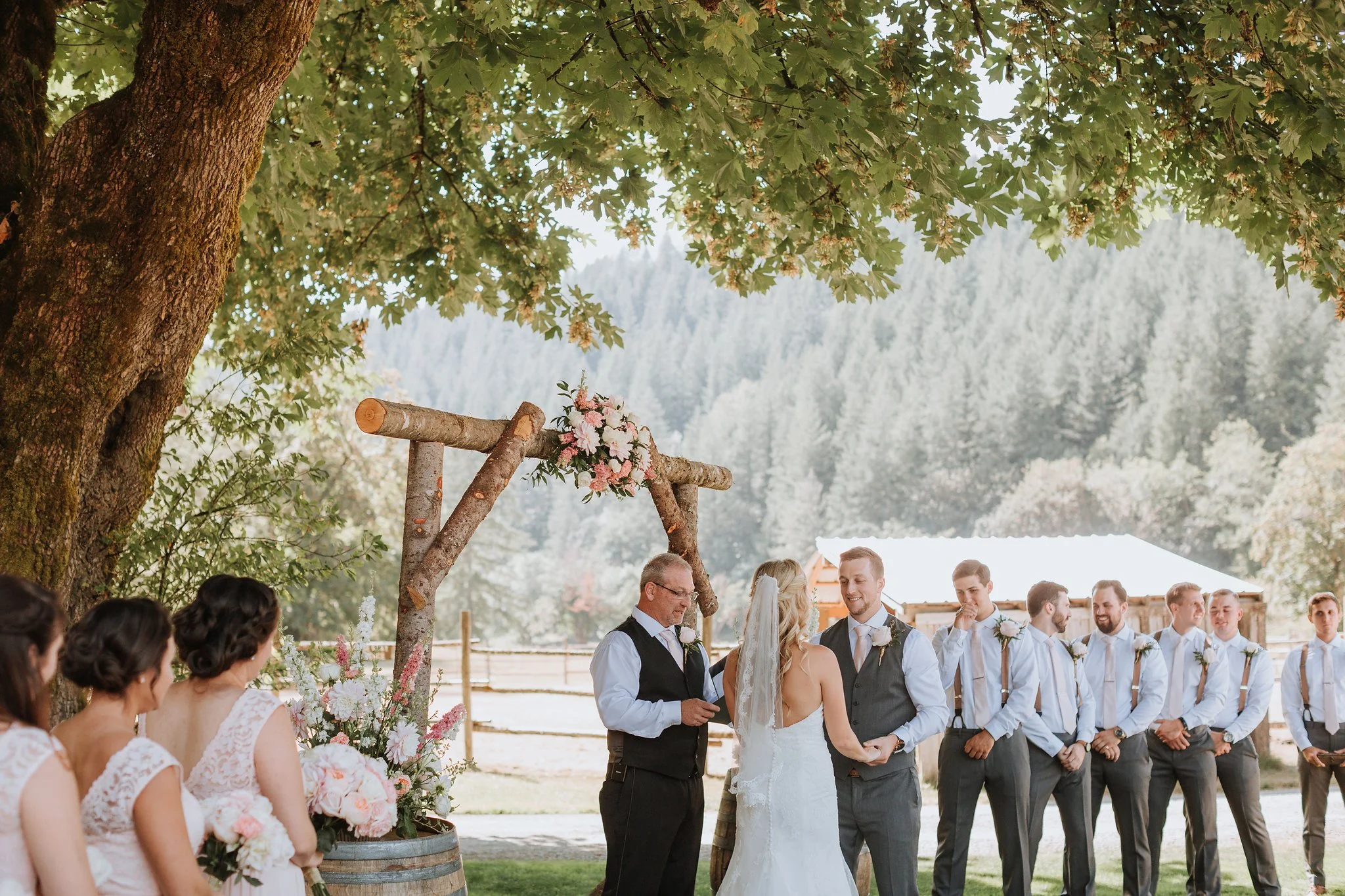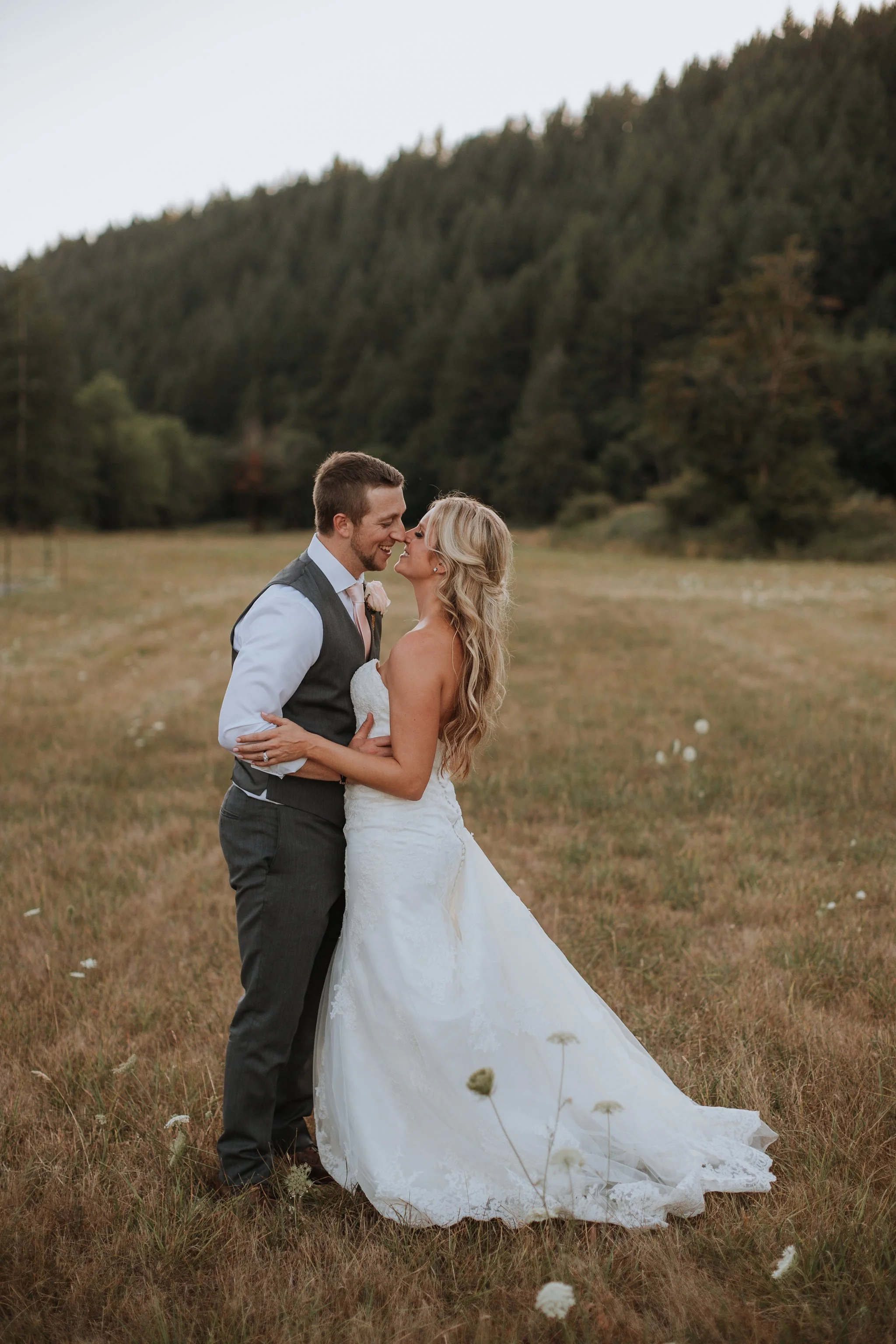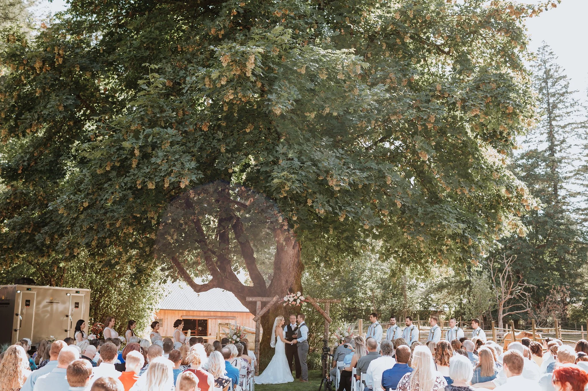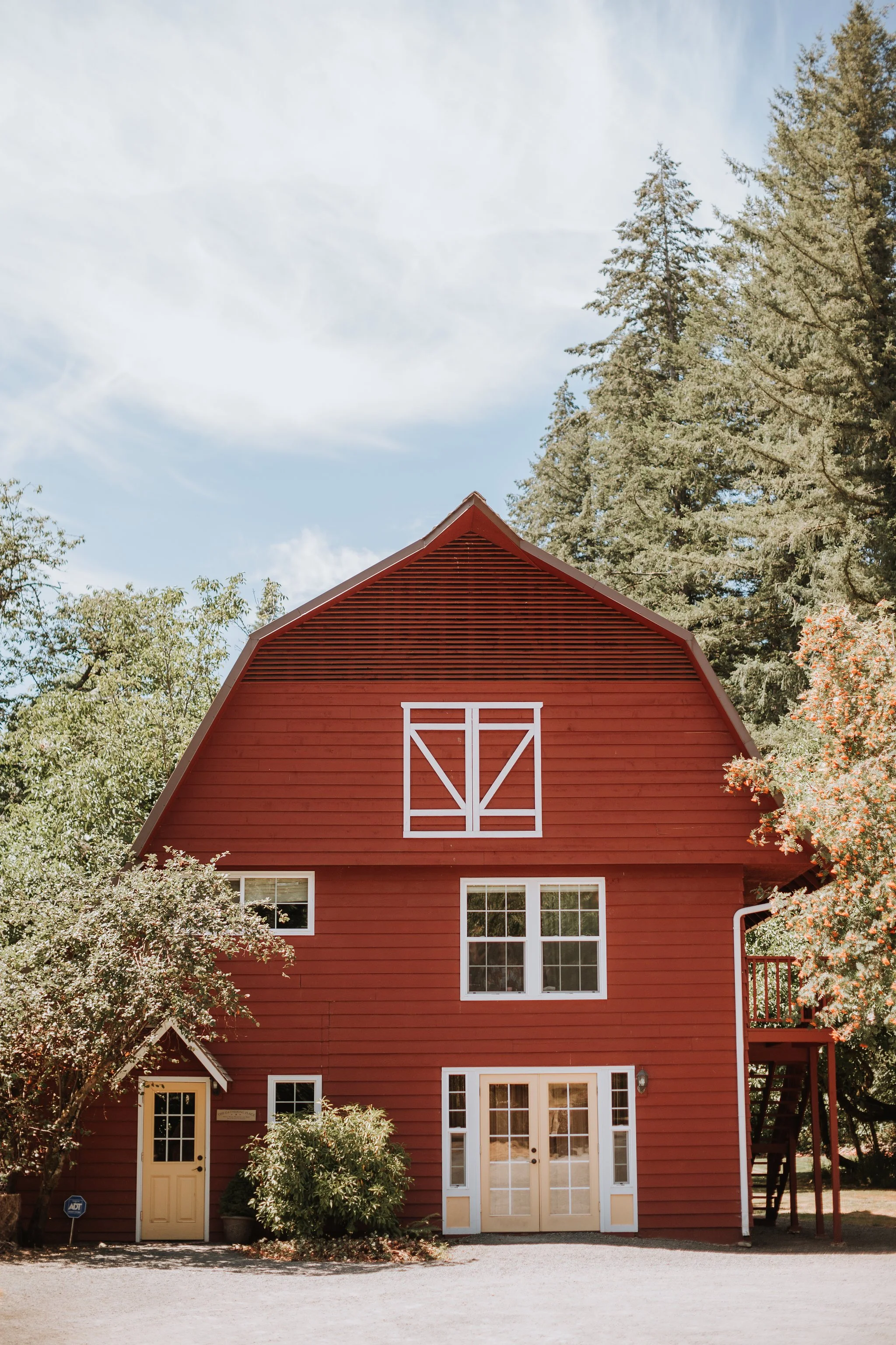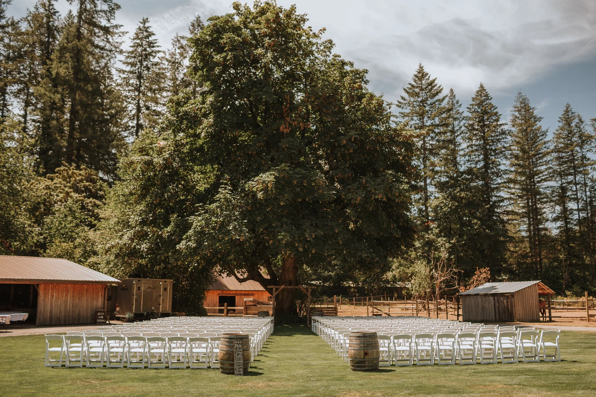We spent it at Pomeroy Farm, which is everything you want a rustic Pacific Northwest wedding venue to be. That iconic big red barn, a massive moss-covered maple tree that served as the ceremony backdrop, split-rail fencing, open golden fields, and pine-covered hills rising just beyond the property line. You could not paint a more perfect setting for these two.
