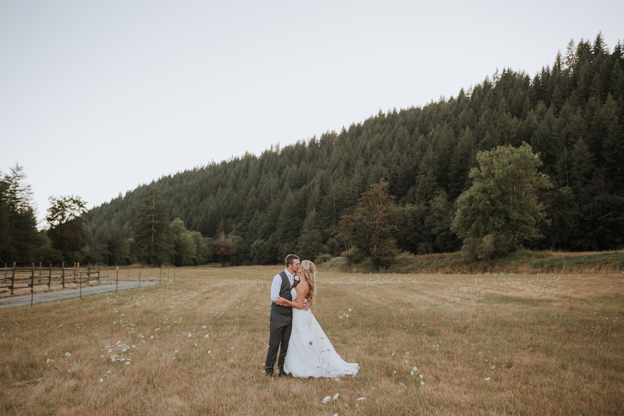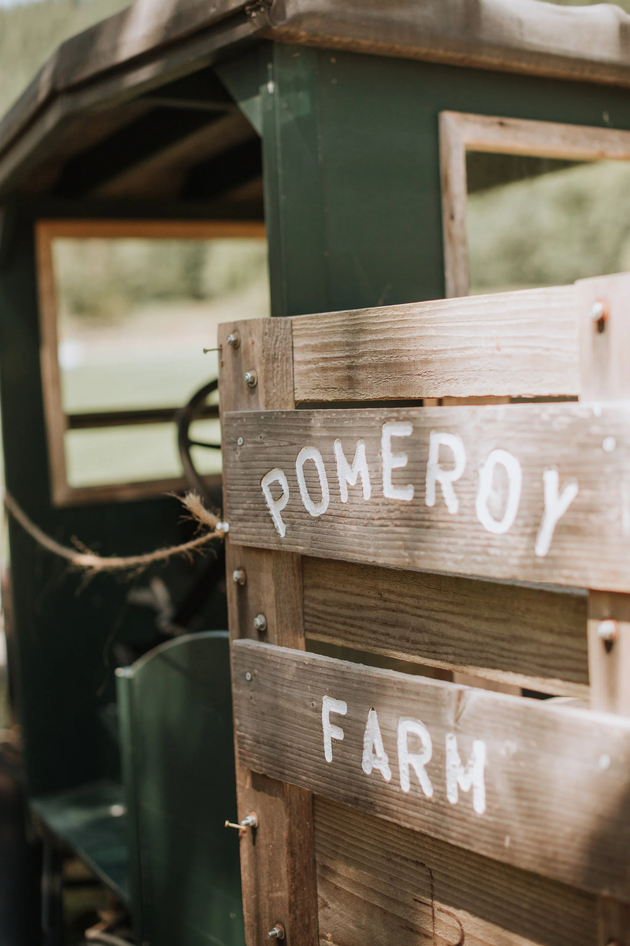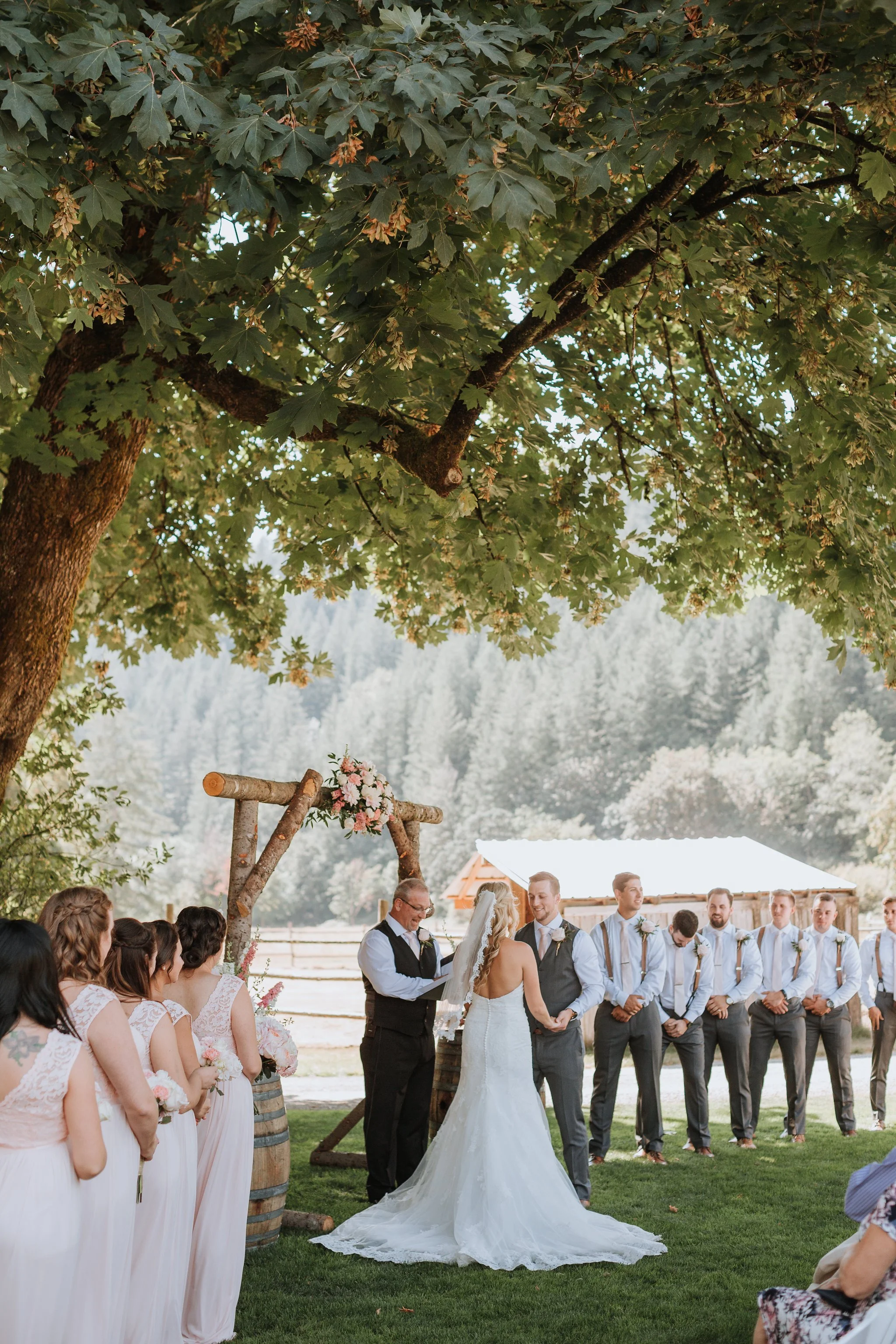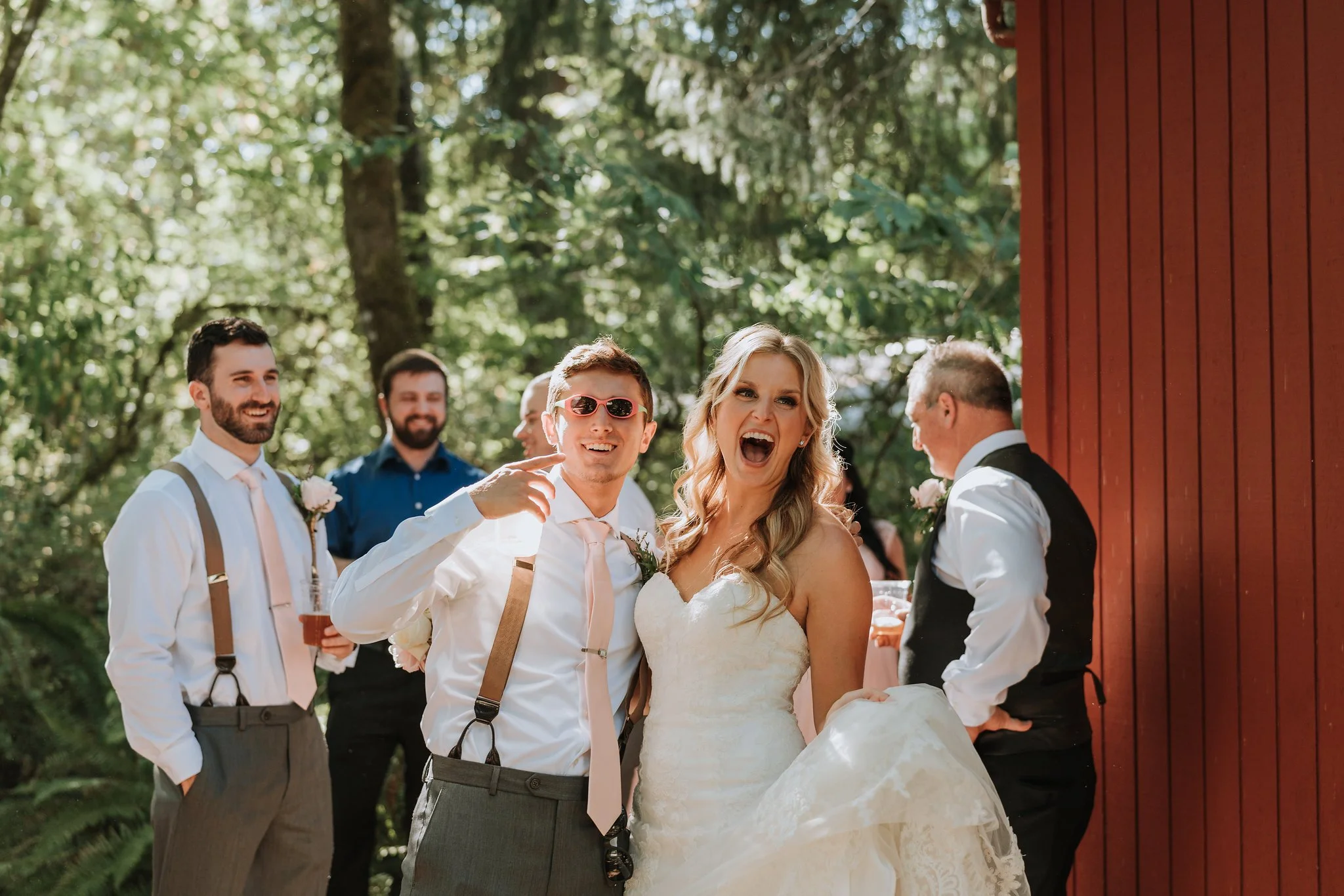 We spent it at Pomeroy Farm, which is everything you want a rustic Pacific Northwest wedding venue to be. That iconic big red barn, a massive moss-covered maple tree that served as the ceremony backdrop, split-rail fencing, open golden fields, and pine-covered hills rising just beyond the property line. You could not paint a more perfect setting for these two.