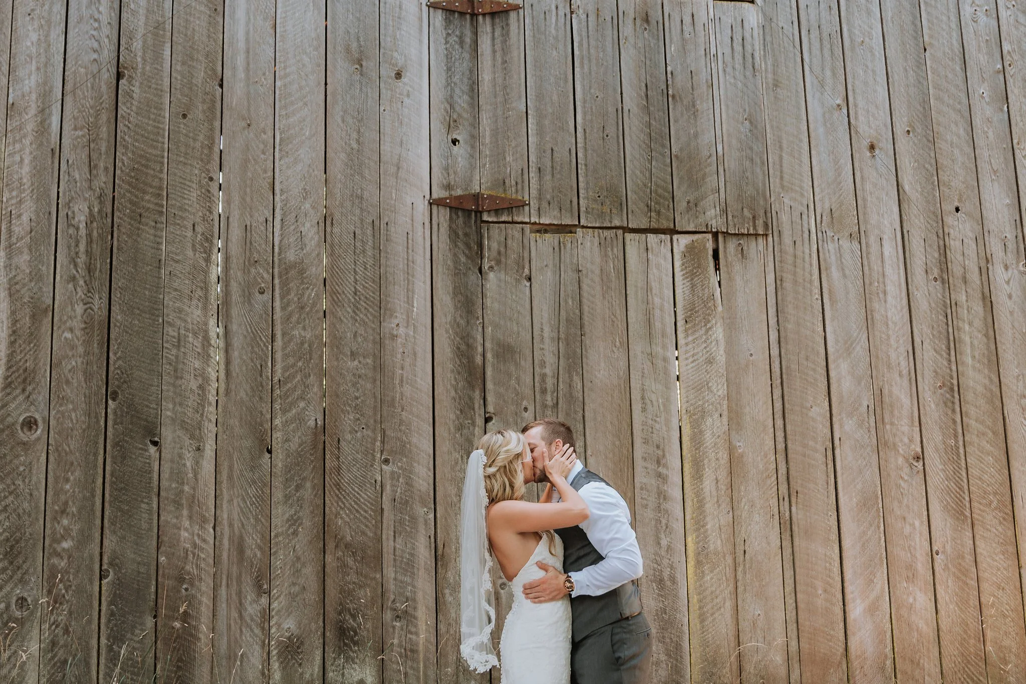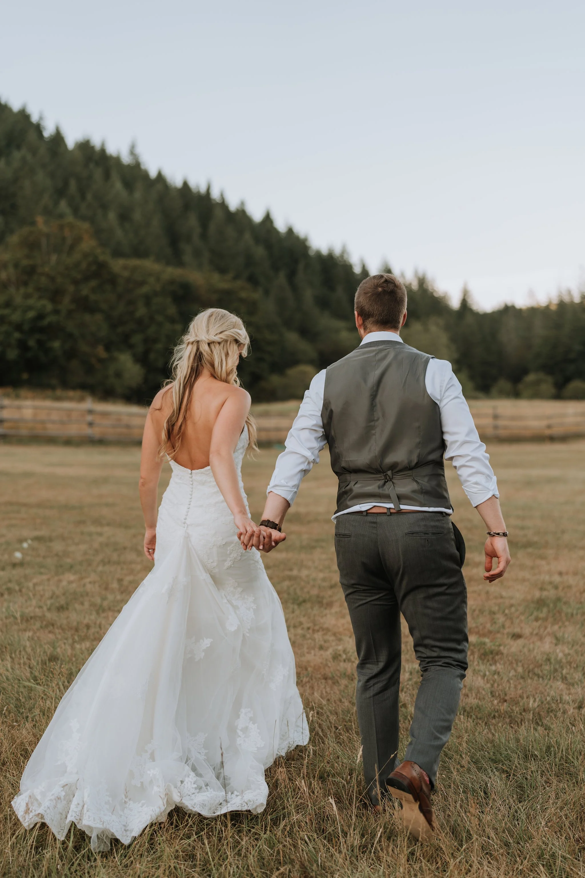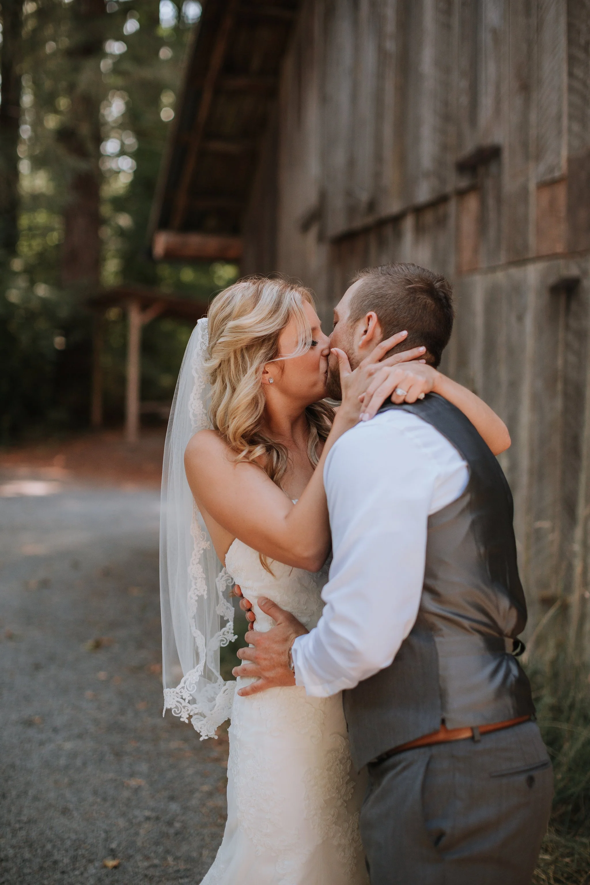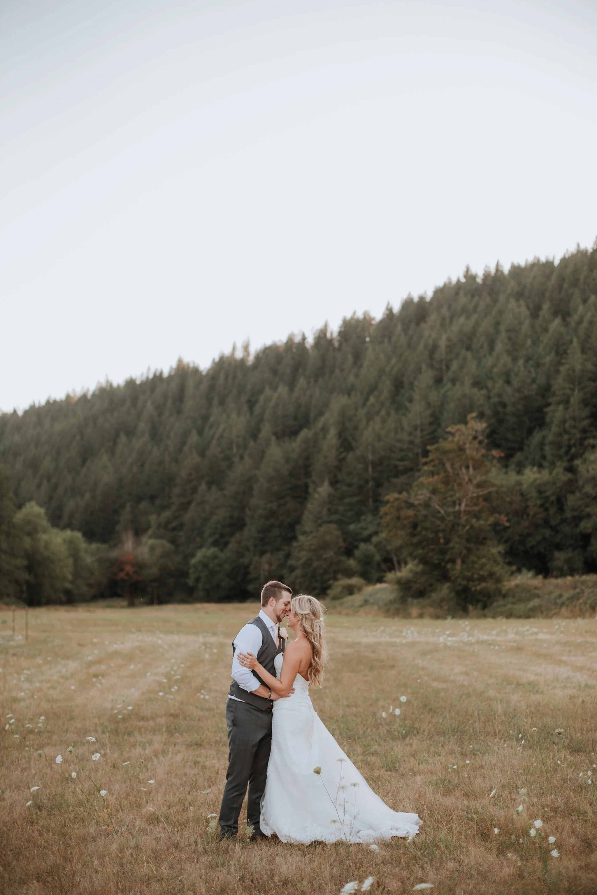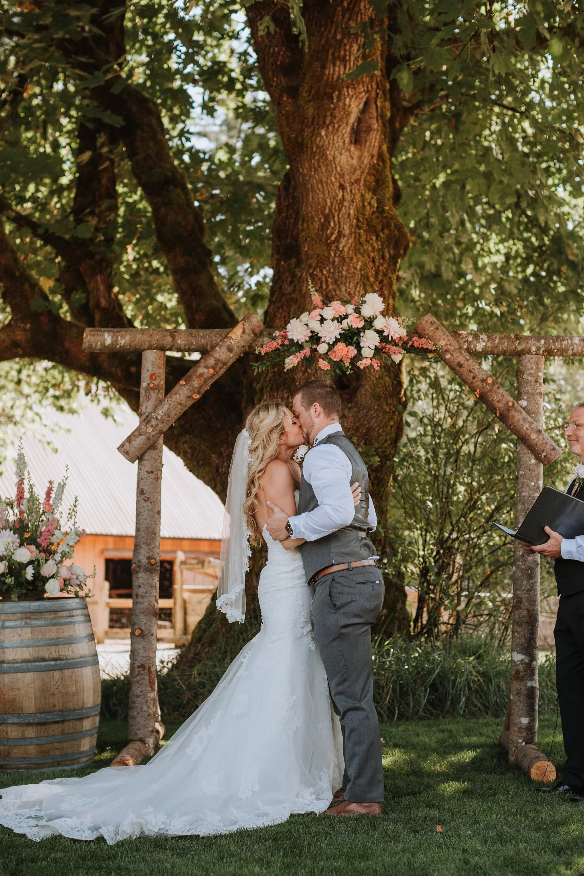 We spent it at Pomeroy Farm, which is everything you want a rustic Pacific Northwest wedding venue to be. That iconic big red barn, a massive moss-covered maple tree that served as the ceremony backdrop, split-rail fencing, open golden fields, and pine-covered hills rising just beyond the property line. You could not paint a more perfect setting for these two.