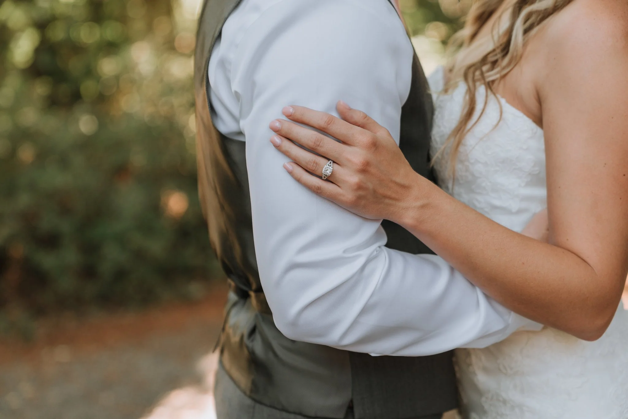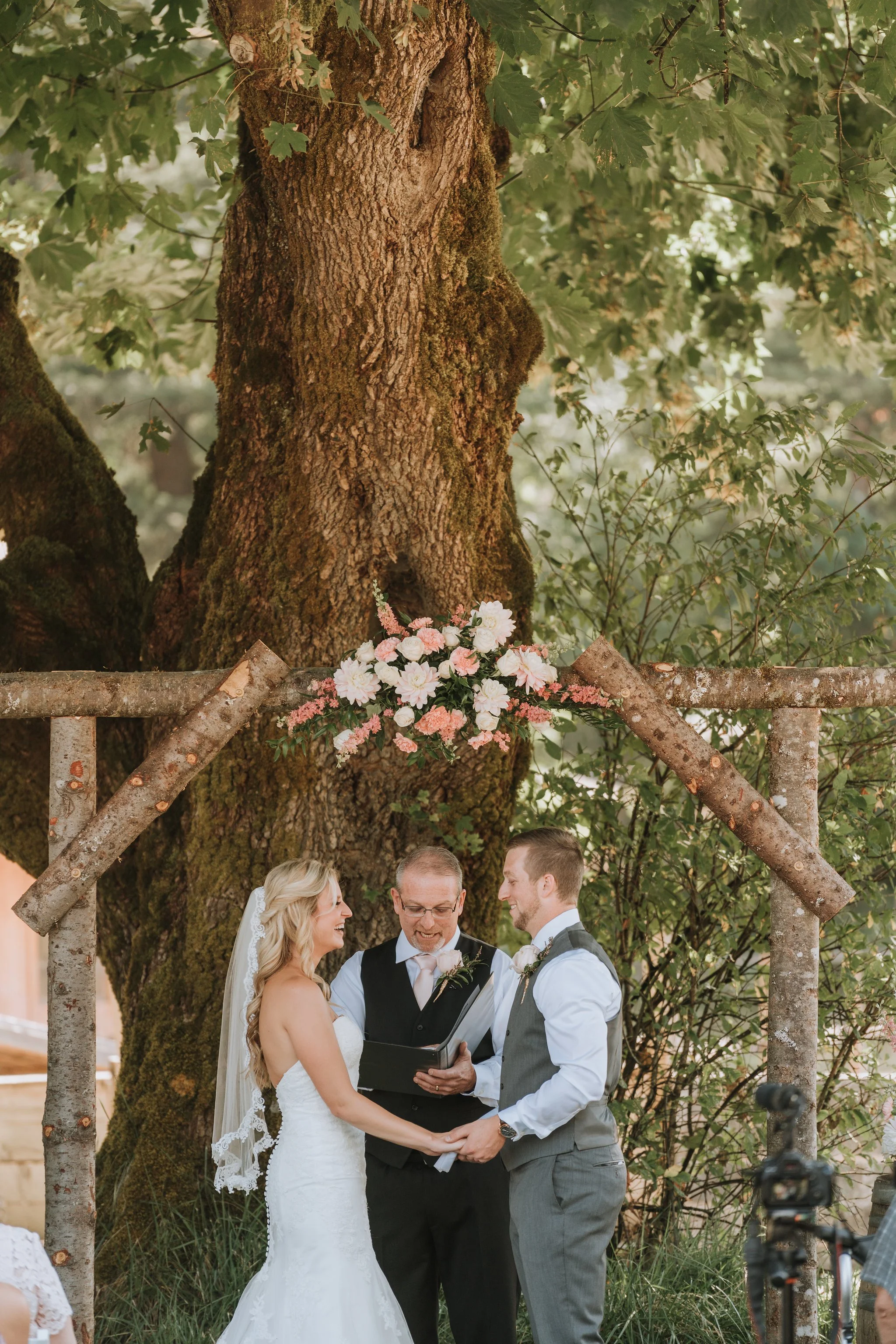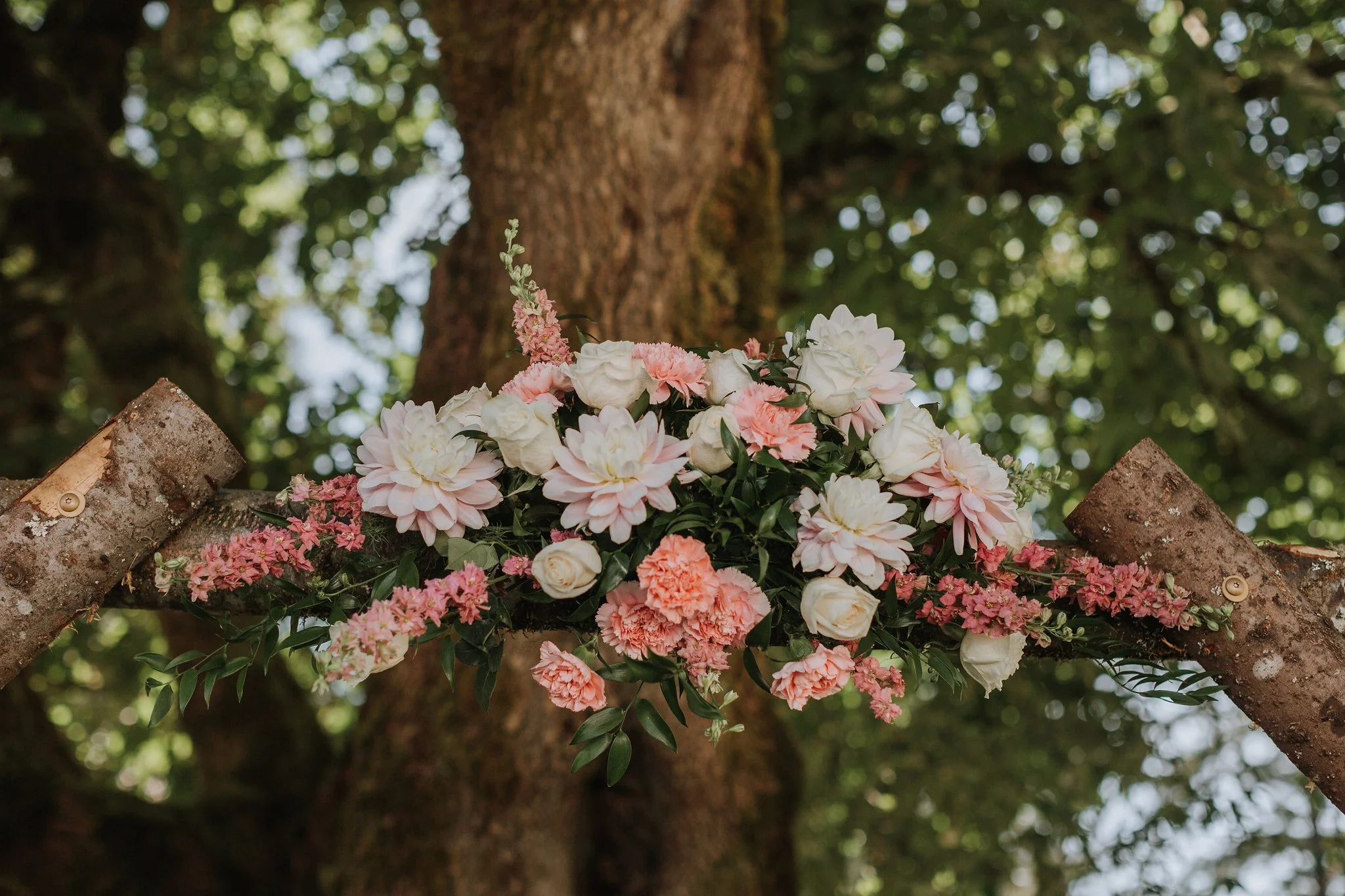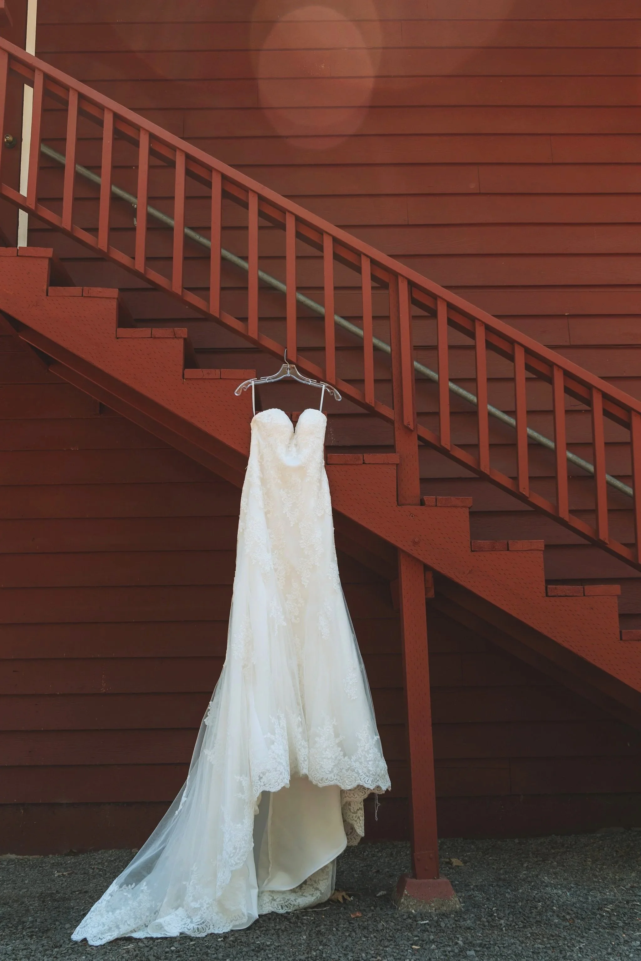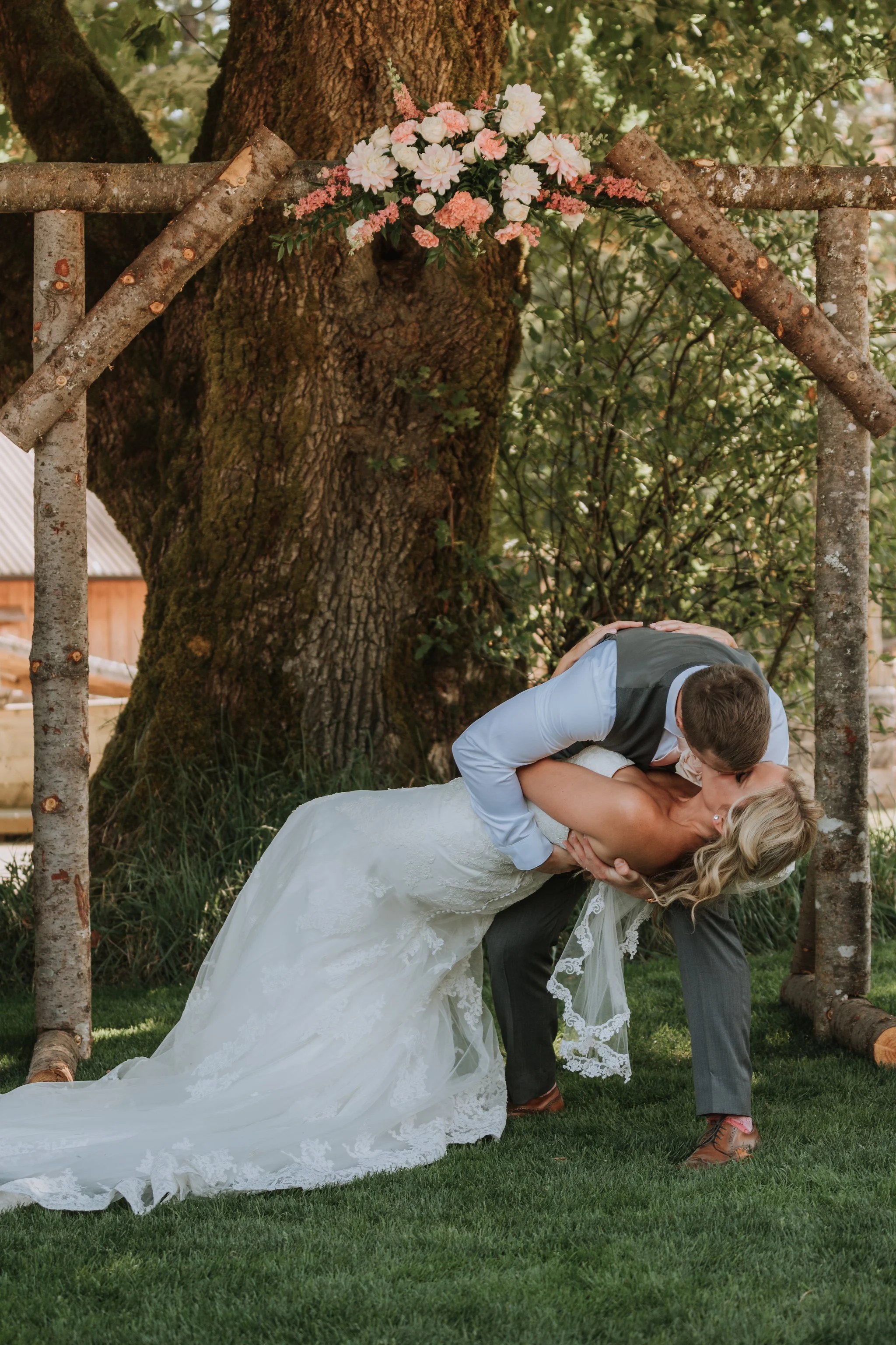 We spent it at Pomeroy Farm, which is everything you want a rustic Pacific Northwest wedding venue to be. That iconic big red barn, a massive moss-covered maple tree that served as the ceremony backdrop, split-rail fencing, open golden fields, and pine-covered hills rising just beyond the property line. You could not paint a more perfect setting for these two.