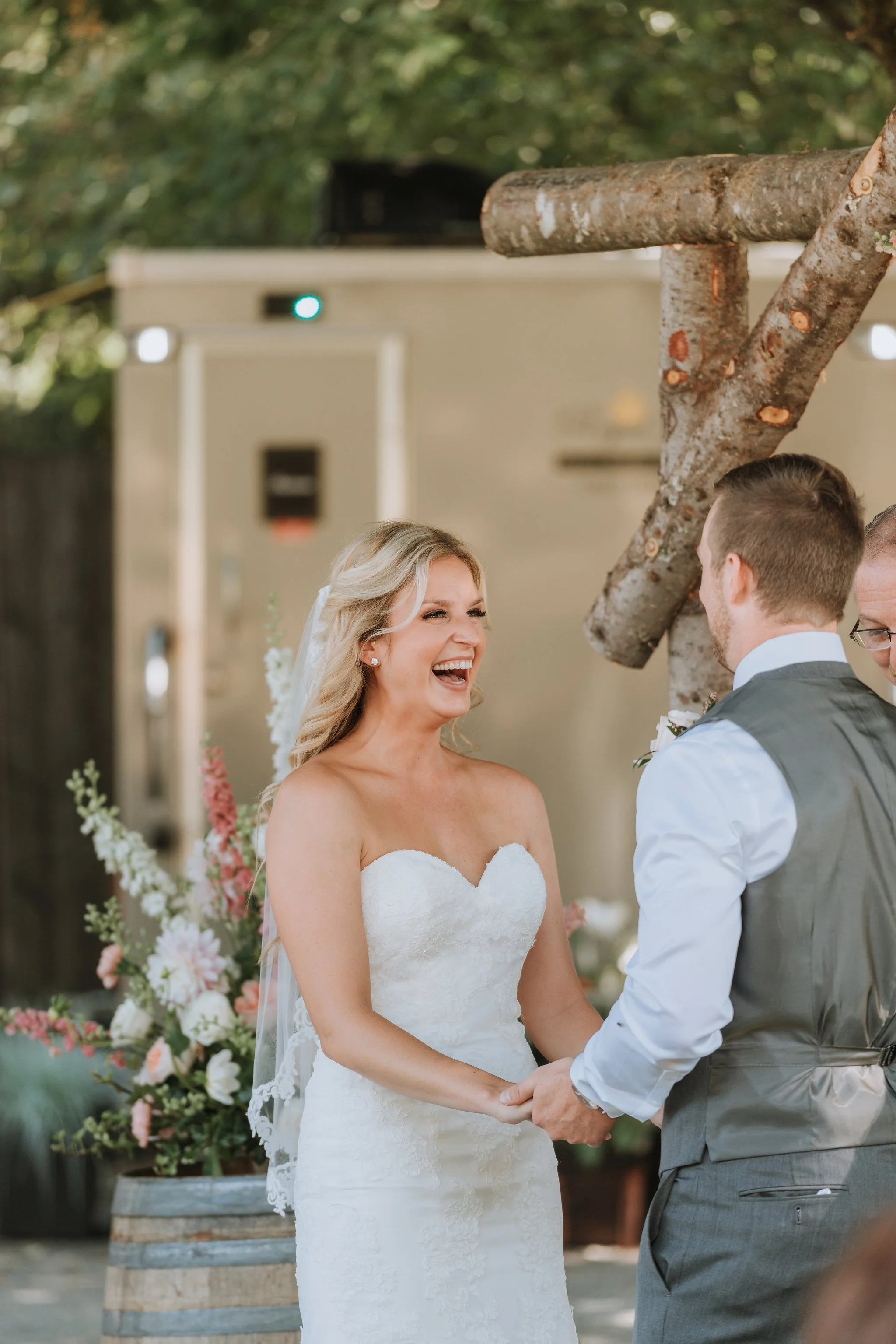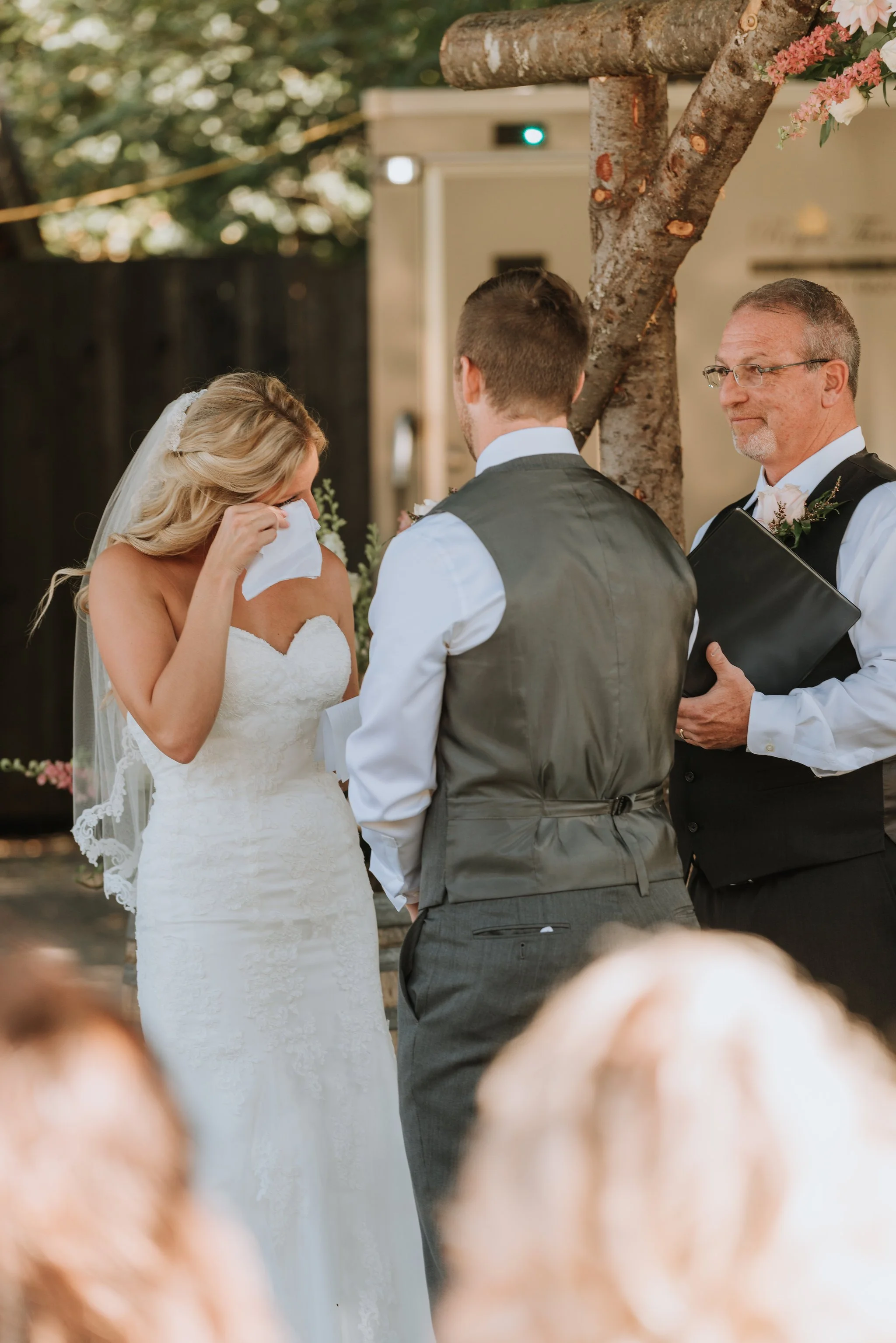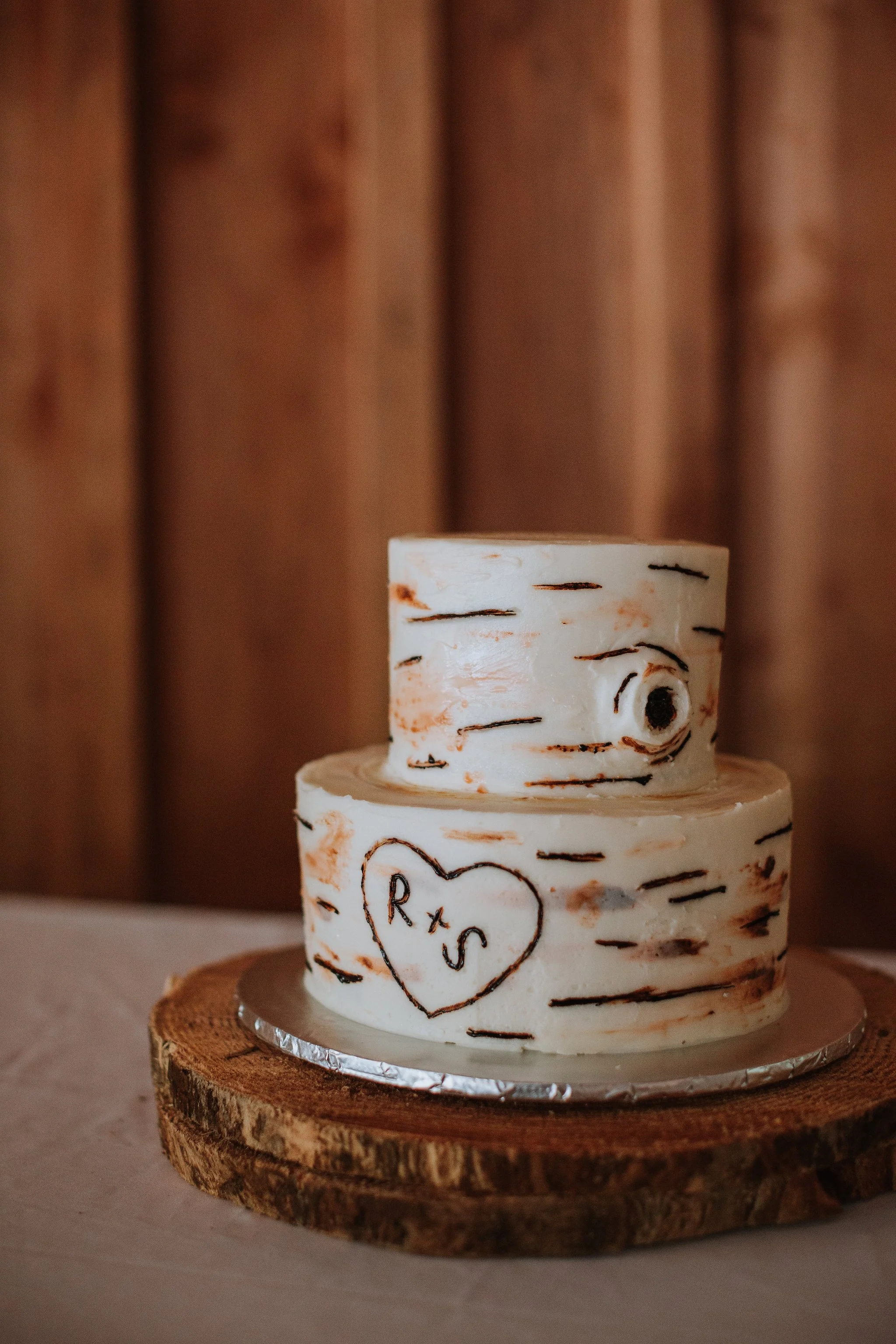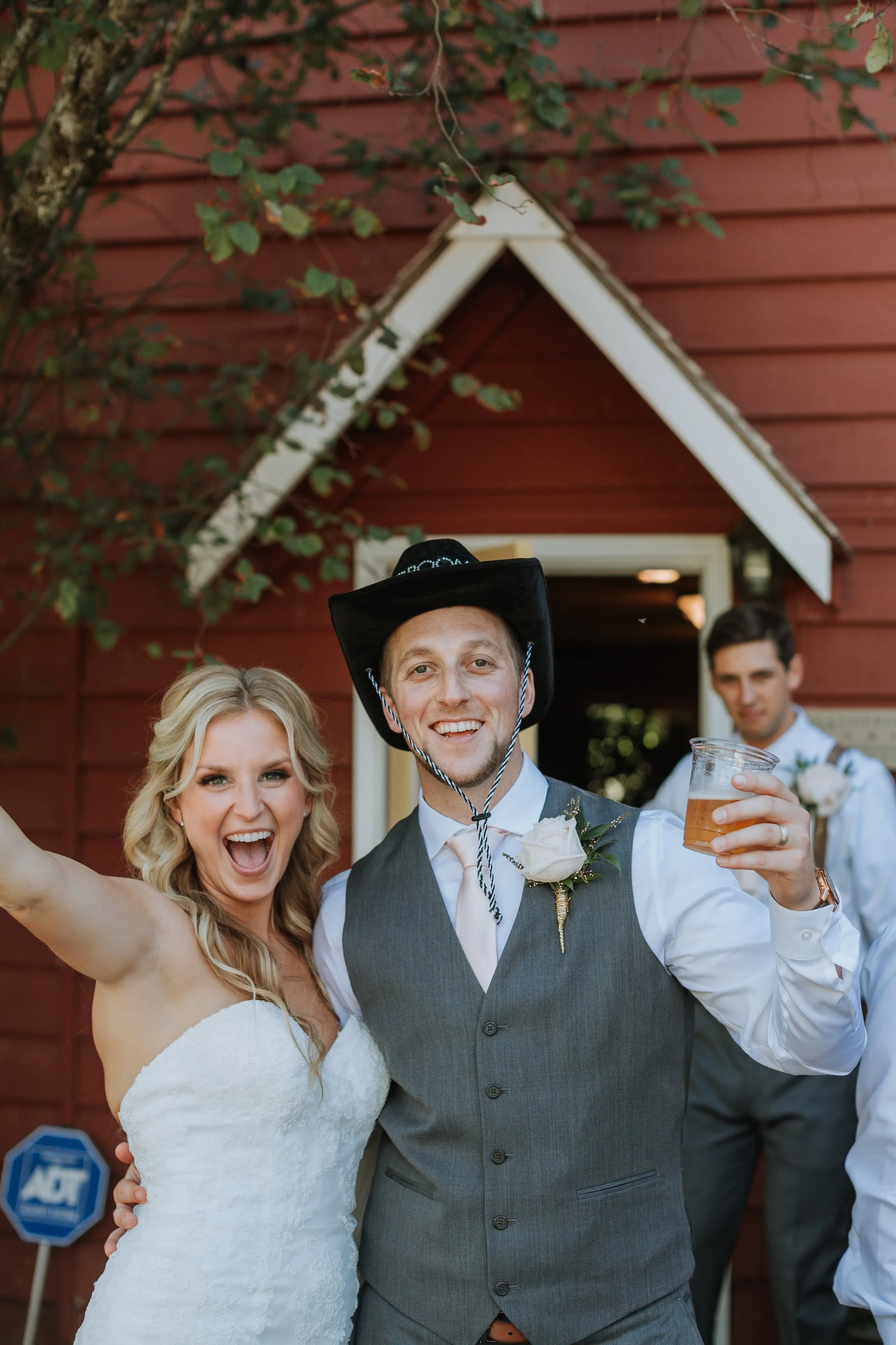 Scott and Rachel leaned all the way into the vibe. Rachel wore her cowboy boots under her lace dress (a detail I could not love more), carried her bouquet down an aisle lined with wine barrels, and said her vows under that massive tree while Scott absolutely beamed at her. The cake was a birch bark buttercream with a little carved heart that read R+S, which felt like the most perfect touch for the whole day. At one point after the ceremony, someone handed Scott a black cowboy hat, and he wore it around with the biggest grin on his face. That photo might be my favorite.