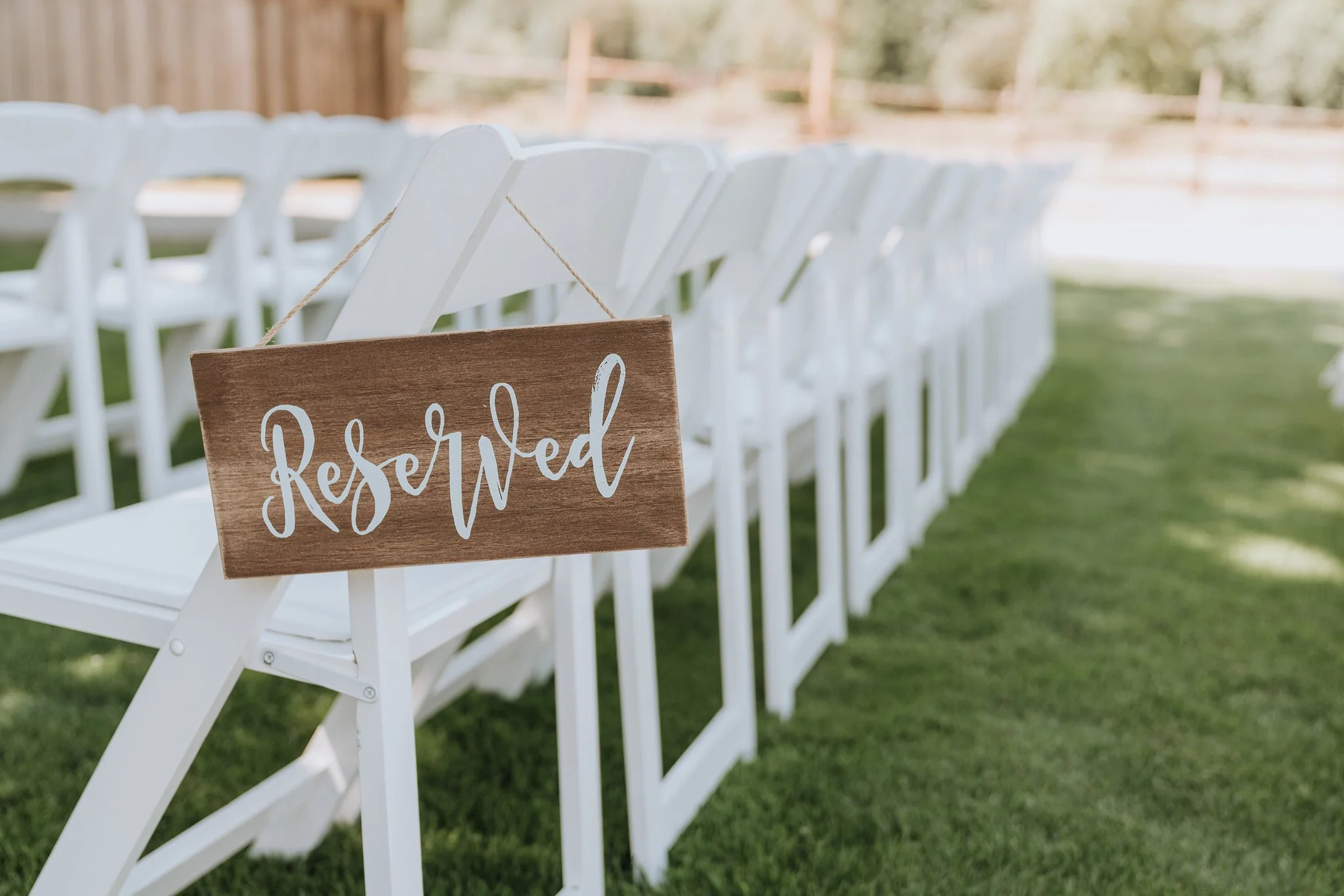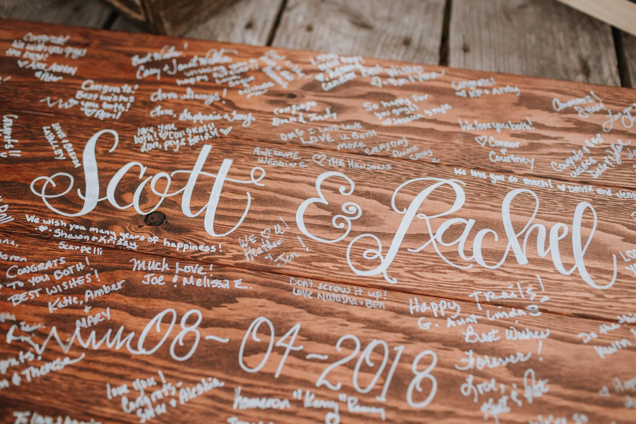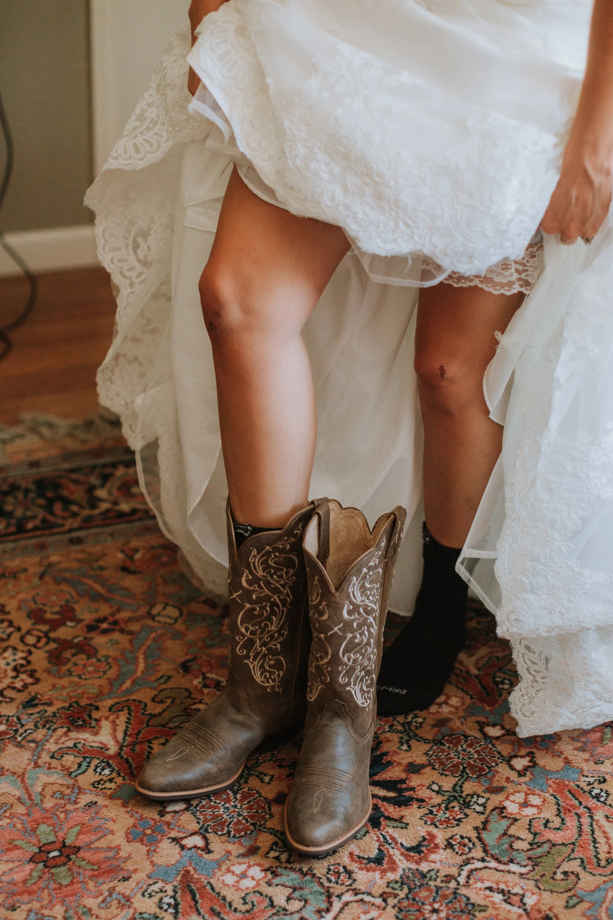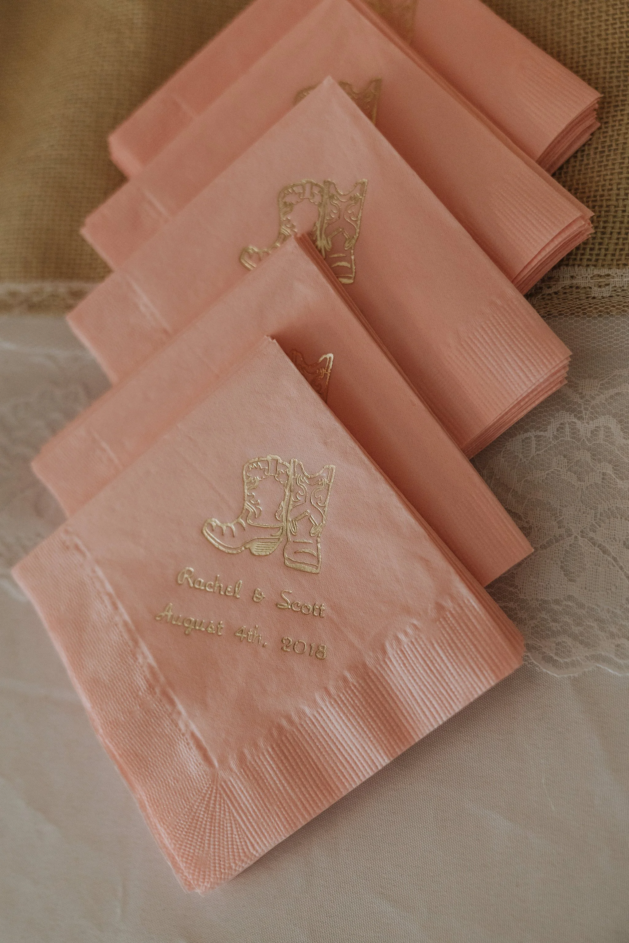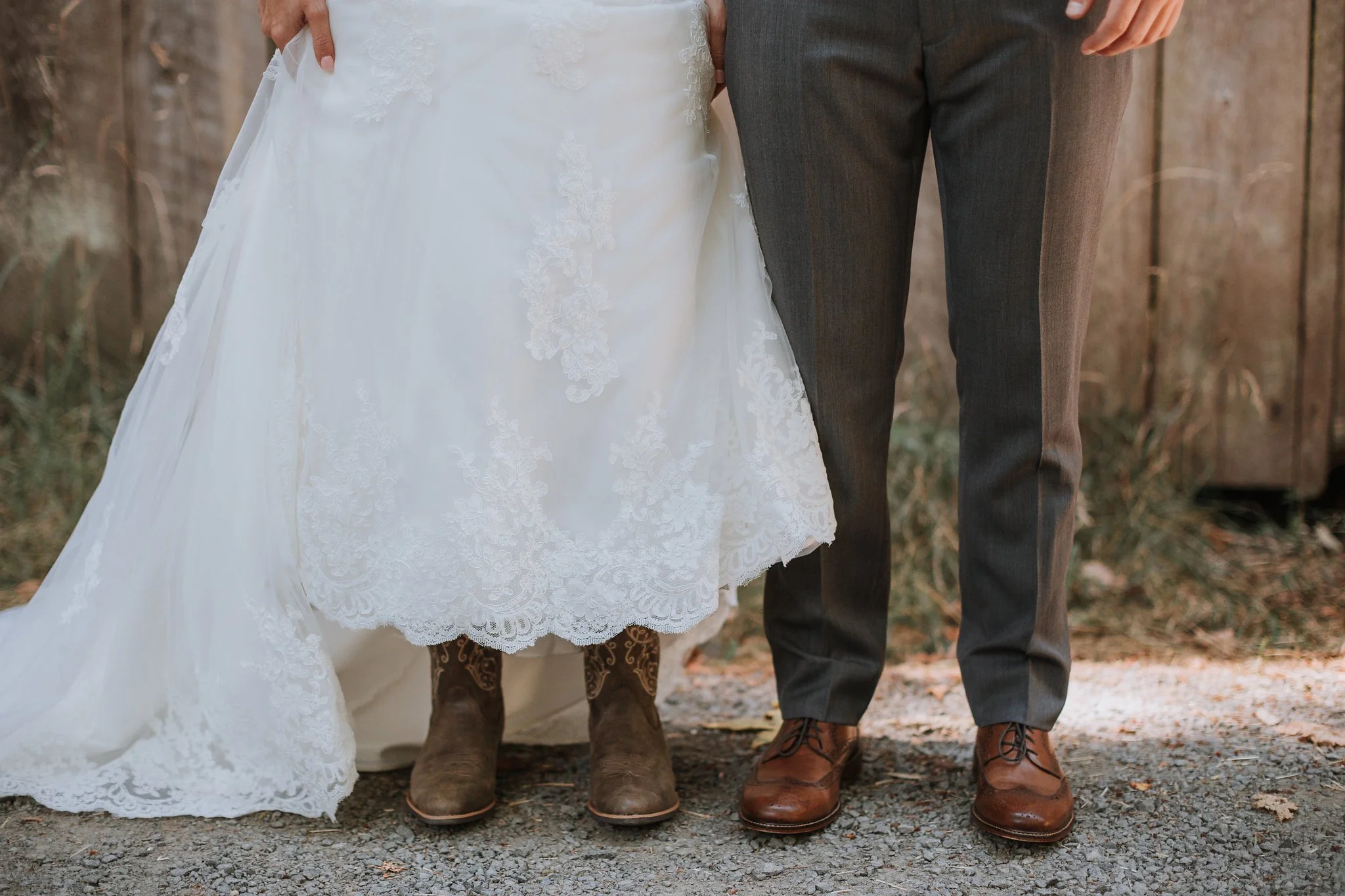Scott and Rachel leaned all the way into the vibe. Rachel wore her cowboy boots under her lace dress (a detail I could not love more), carried her bouquet down an aisle lined with wine barrels, and said her vows under that massive tree while Scott absolutely beamed at her. The cake was a birch bark buttercream with a little carved heart that read R+S, which felt like the most perfect touch for the whole day. At one point after the ceremony, someone handed Scott a black cowboy hat, and he wore it around with the biggest grin on his face. That photo might be my favorite.