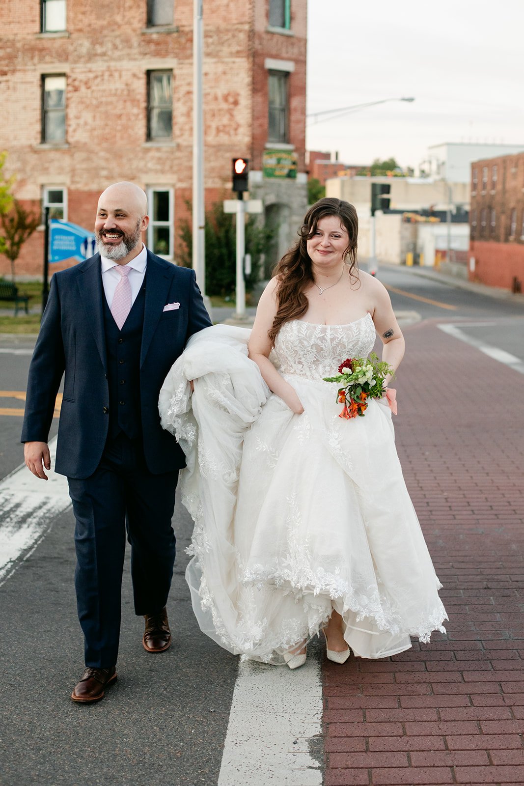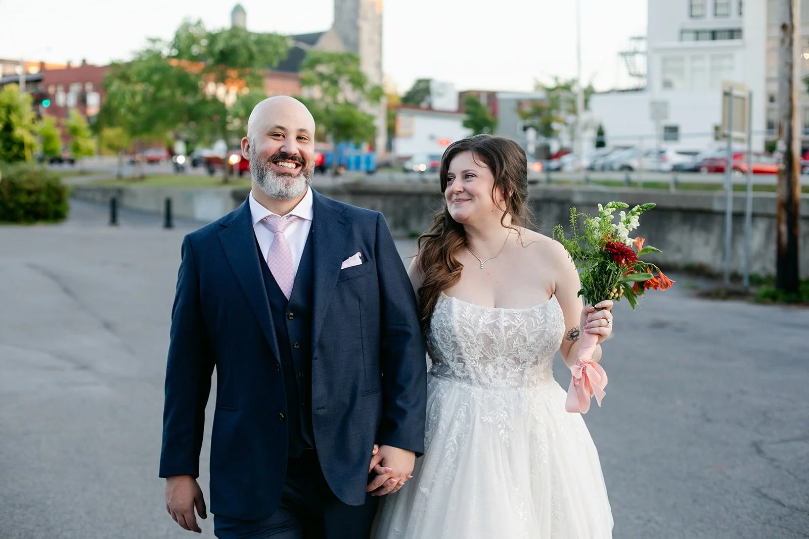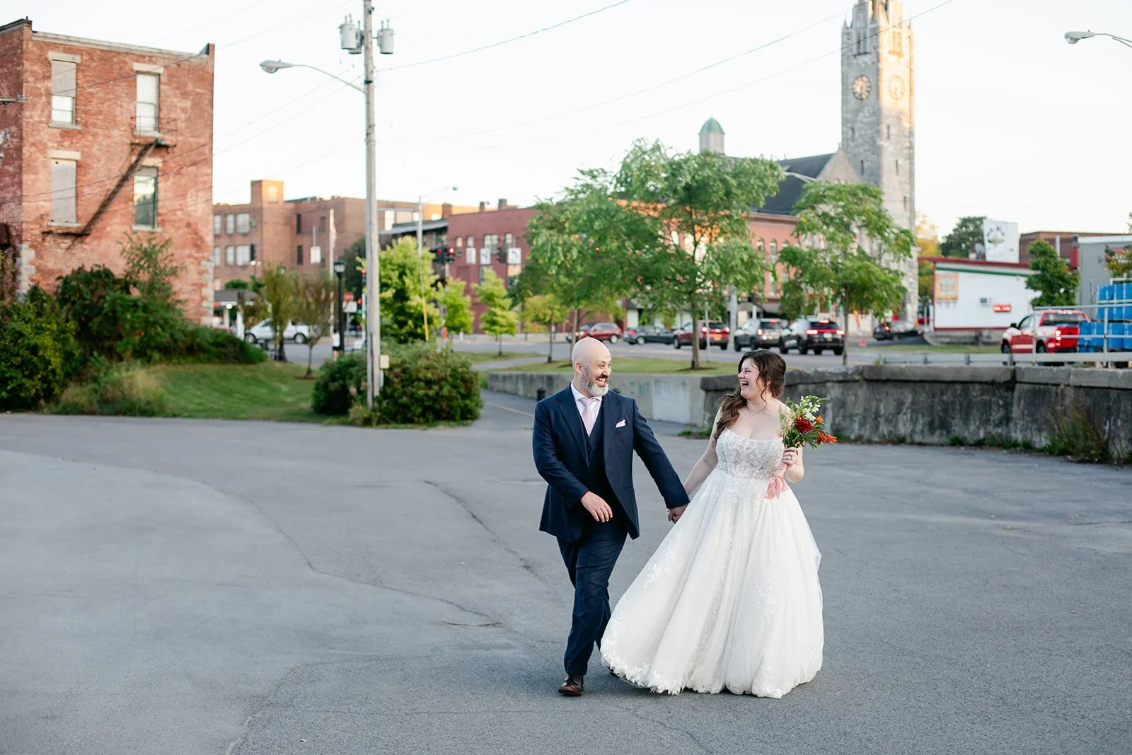 After the ceremony we slipped out into the streets of Watertown for couples portraits — wandering downtown, finding light, letting the city be the backdrop. There's something about a couple just walking through a place together that produces some of the most natural, alive images of the whole day, and Samantha and Jason were completely in their element out there.