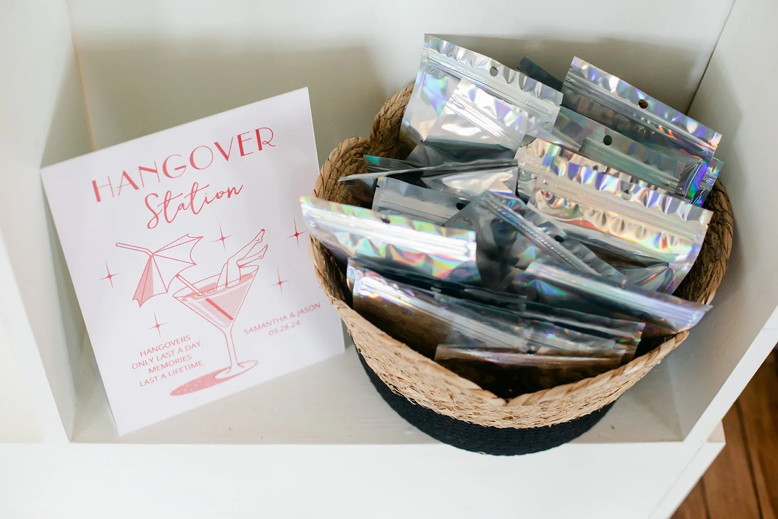 Samantha and Jason put together thoughtful little bags for their guests to take home at the end of the night — the kind of detail that tells you everything you need to know about a couple's sense of humor and how well they know their people. Printed on each bag: but did you die? I photographed them and laughed out loud. It was perfect. It was so completely them. The best wedding details are always the ones that make you feel like you already know the couple before you've even met them, and this one delivered.