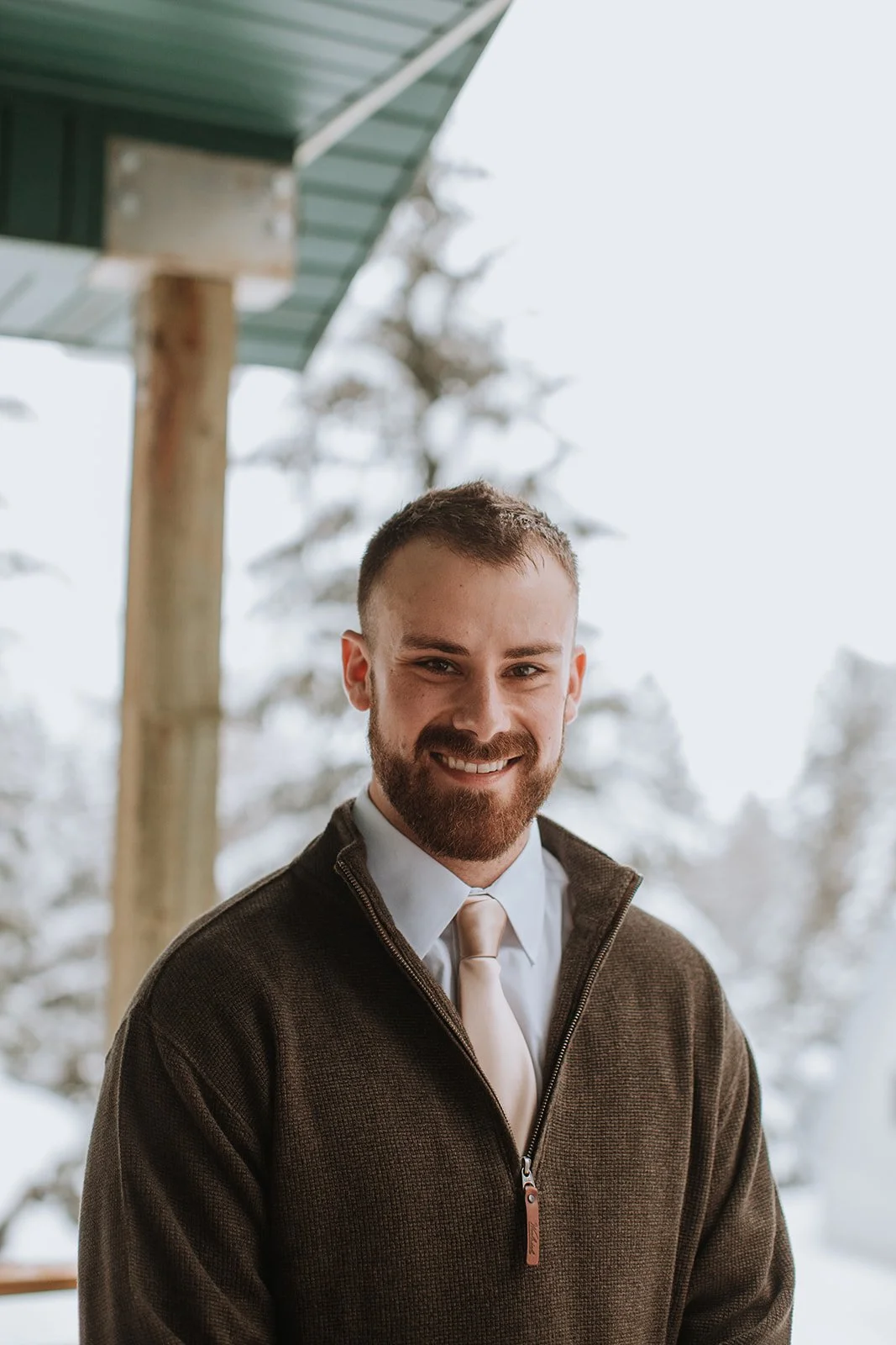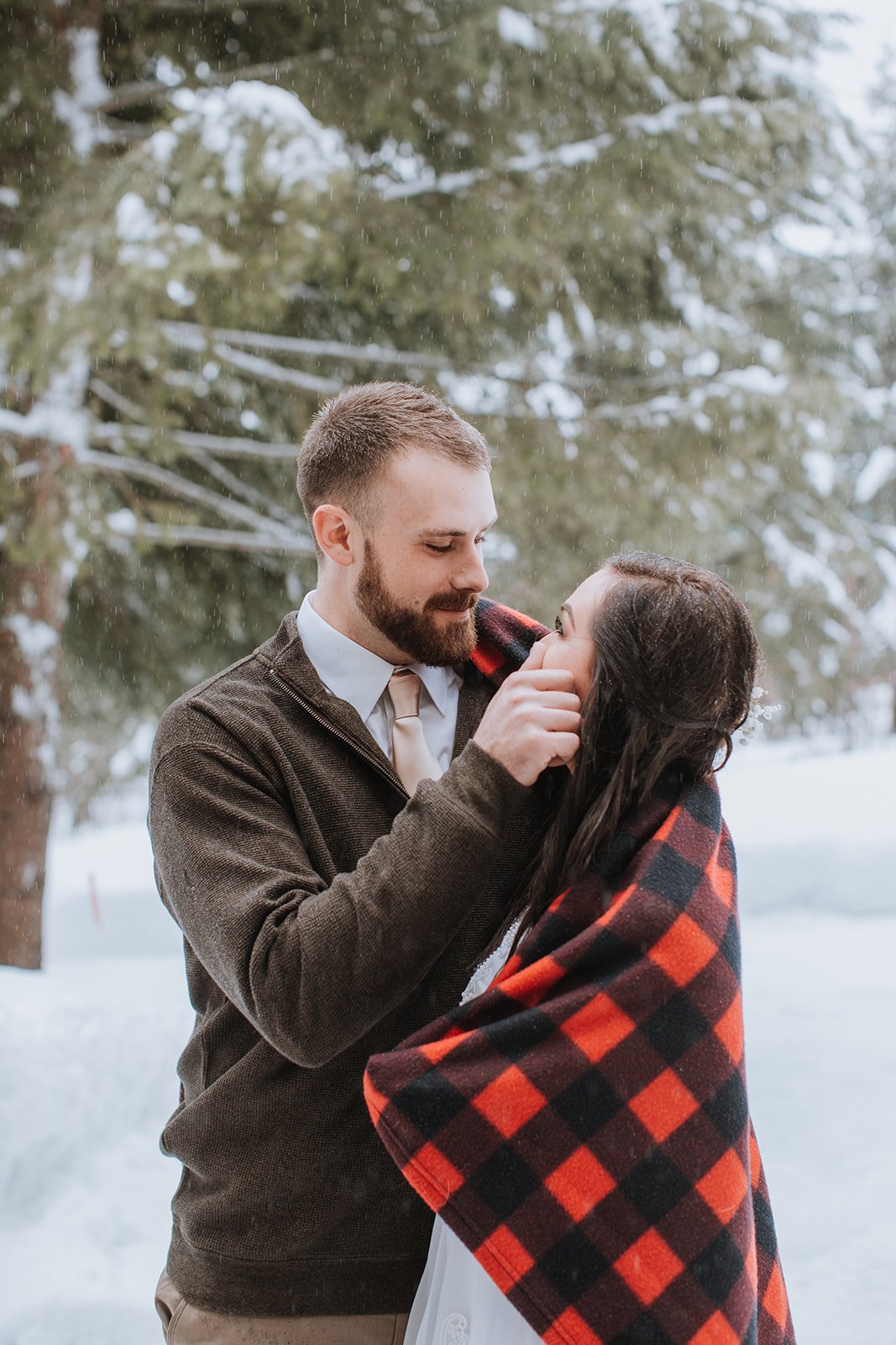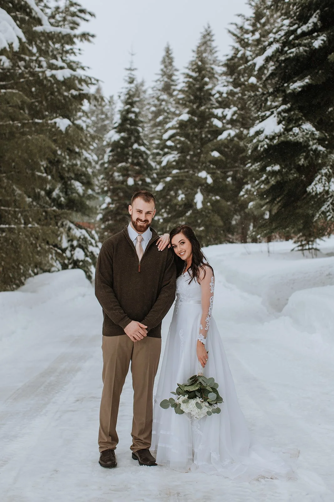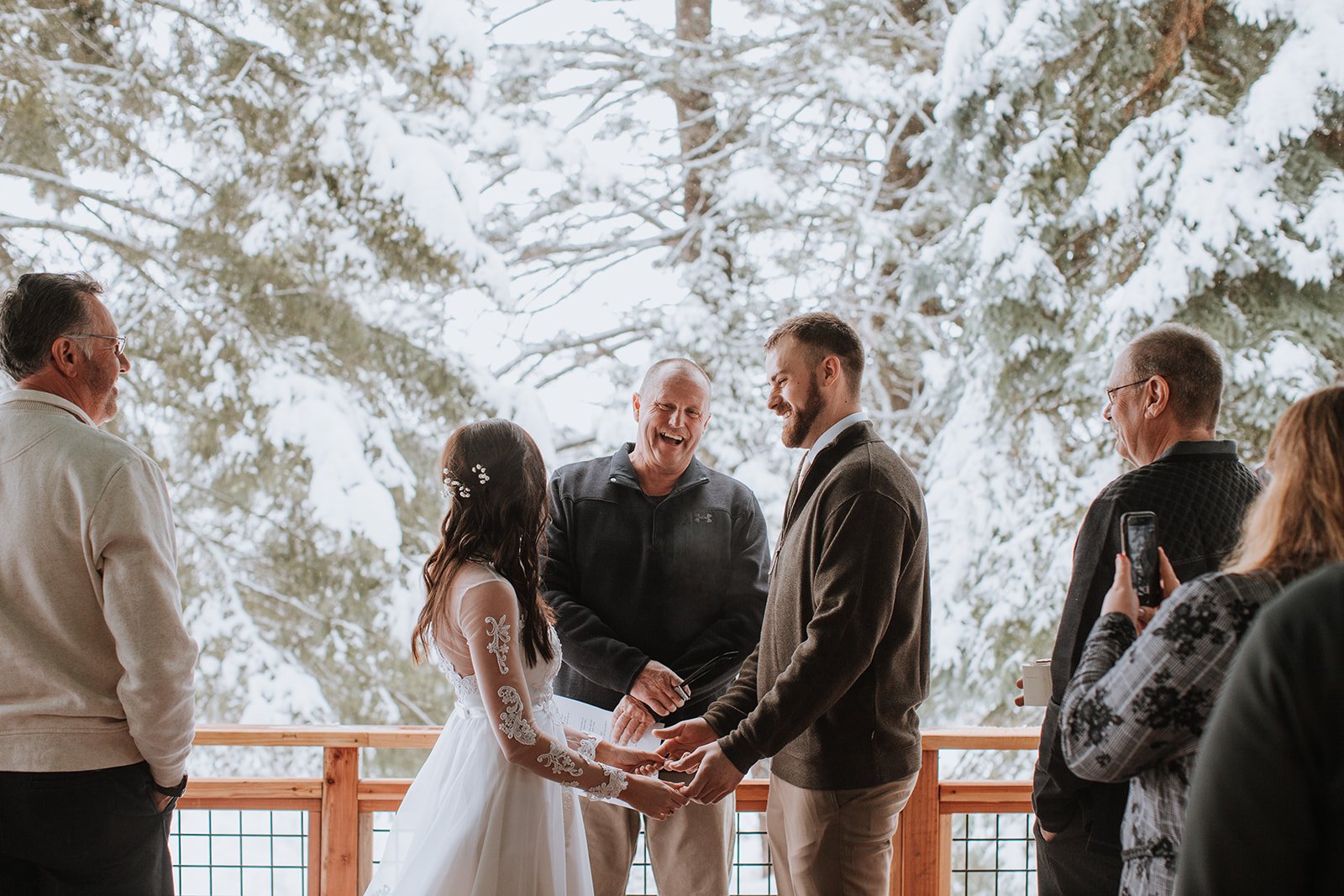 Cascade, Idaho, in winter, is the kind of place that makes you understand why people fall in love with the Pacific Northwest and never leave. Snow-heavy pines pressing in from every direction, the whole world quiet and white and still. Justin and Brianna gathered their closest family and friends on the deck of a mountain cabin and got married exactly the way they wanted to — surrounded by the landscape they love, dressed for the mountains, completely themselves.