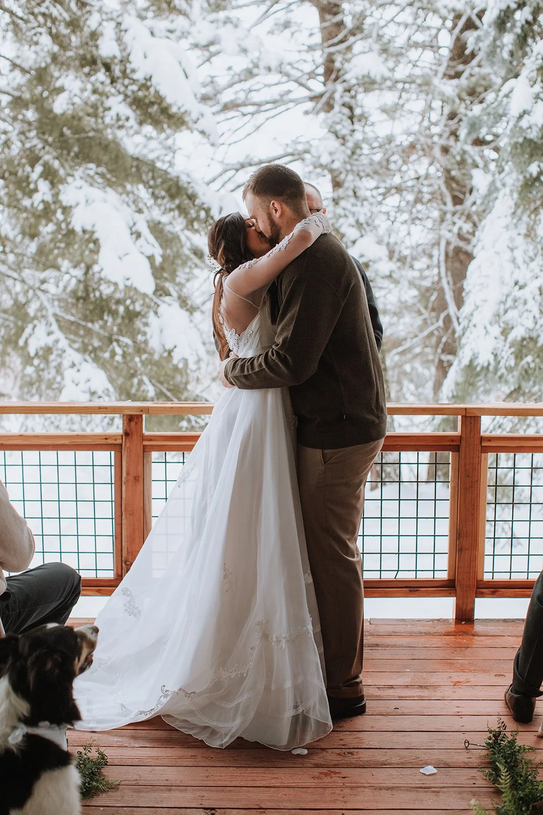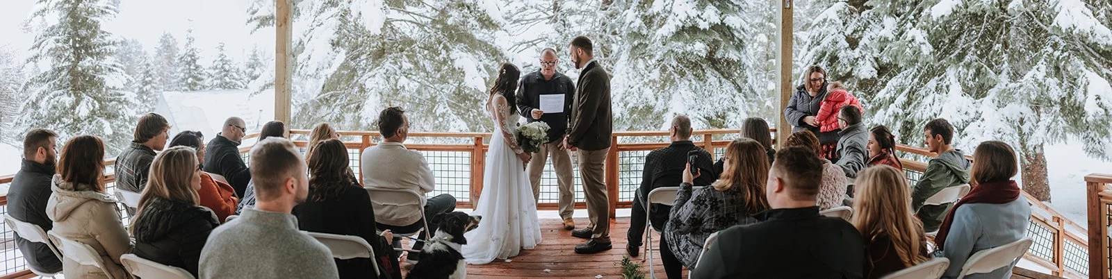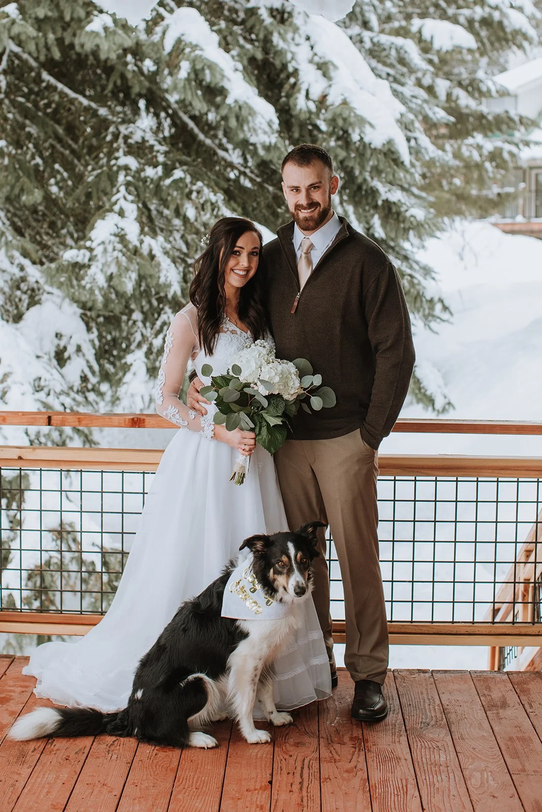Some weddings happen in ballrooms. Some happen in vineyards. And some happen on a snow-covered cabin porch in the mountains of Idaho in the middle of winter, with a border collie in a bandana serving as ring bearer and two snowmobiles parked out front with a "Just Married" banner strung between them.
