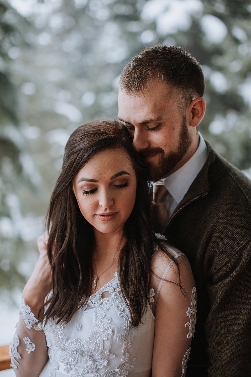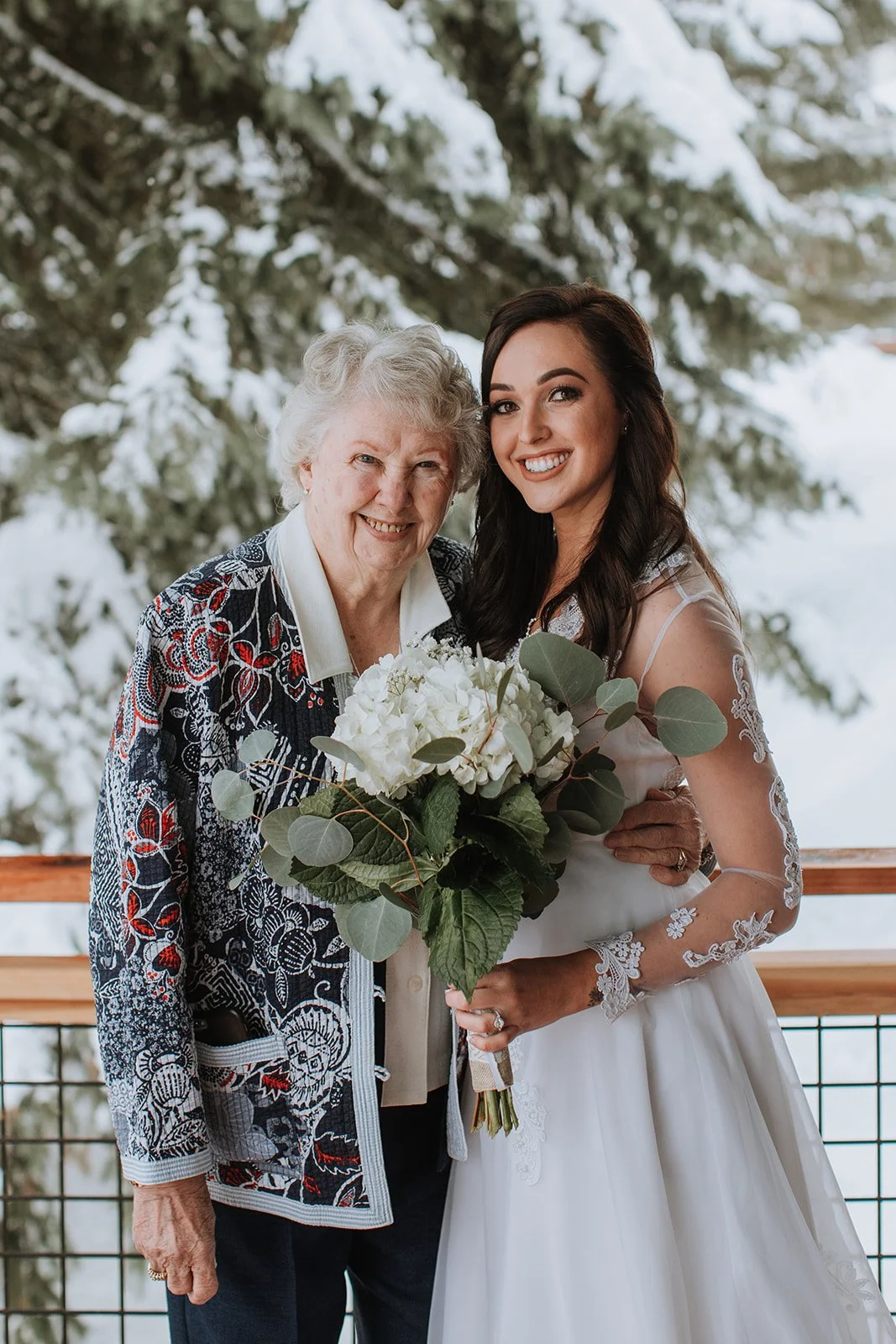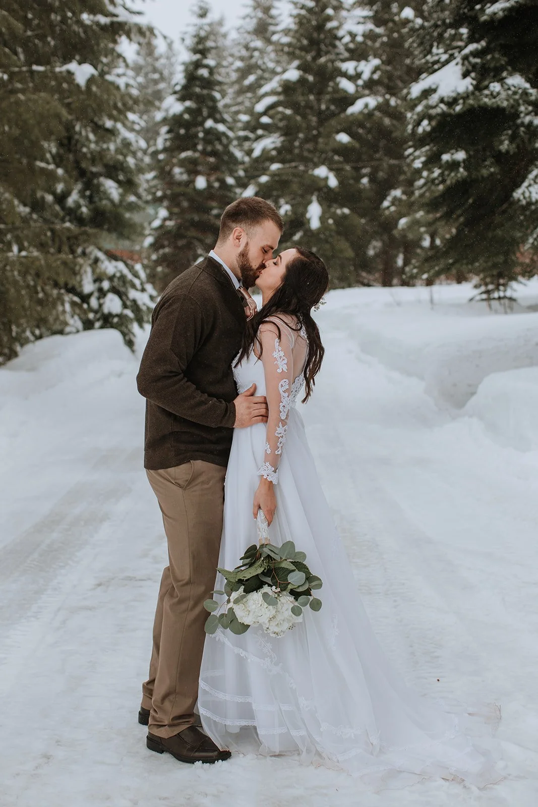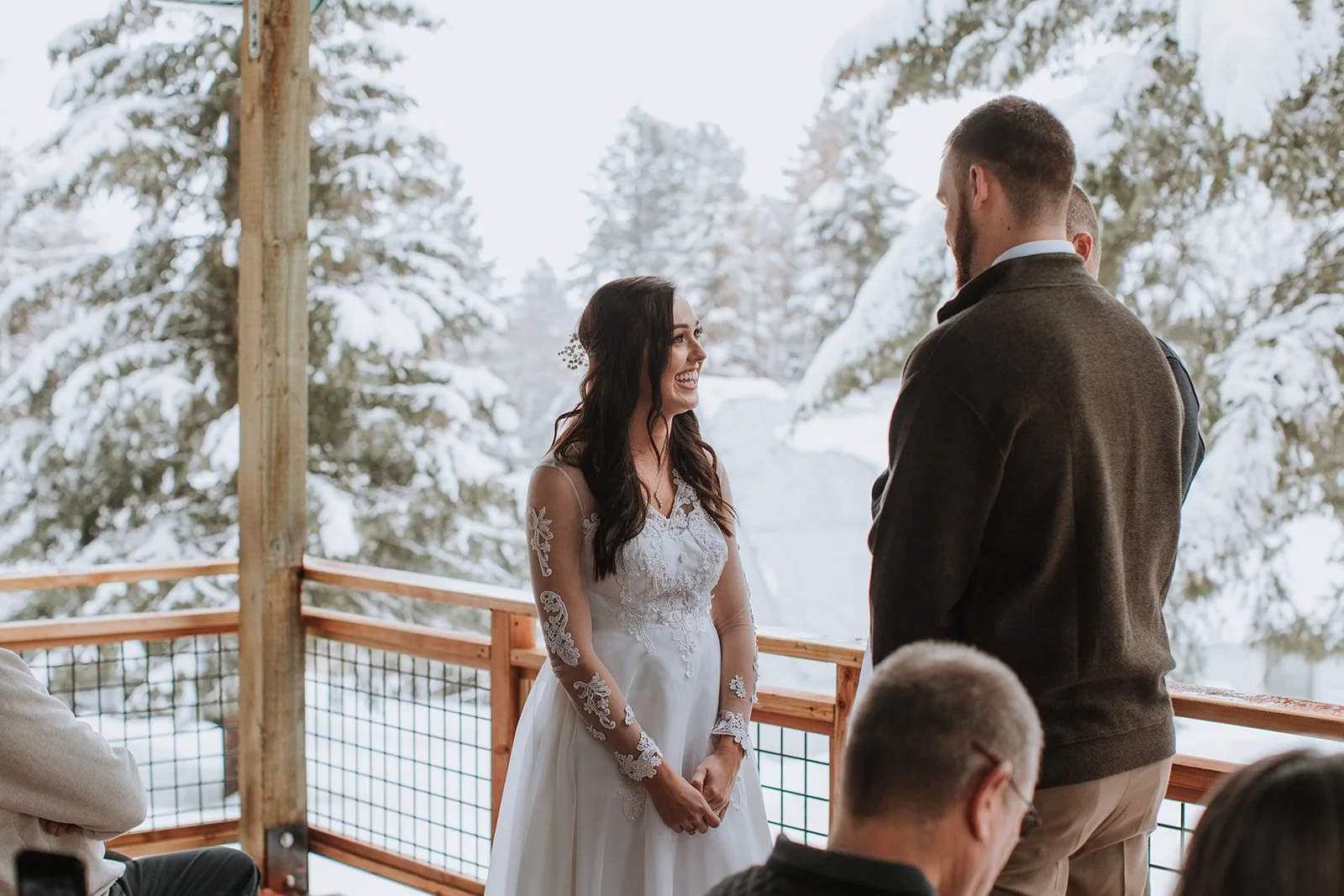 Brianna wore a stunning long-sleeve lace gown — delicate floral appliqué running down sheer sleeves, her bouquet a simple arrangement of white hydrangeas and eucalyptus that felt just right against all that snow. She was radiant. The kind of bride who looks like she belongs exactly where she is. Justin looked at her the way you hope someone will look at you — like he couldn't believe his luck and also absolutely knew what he was doing.