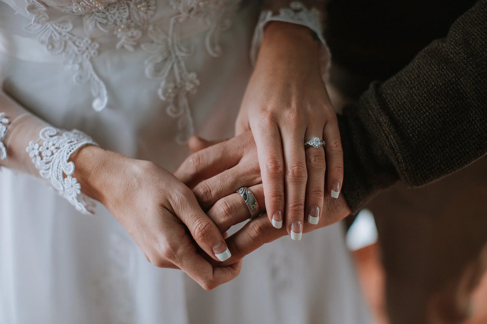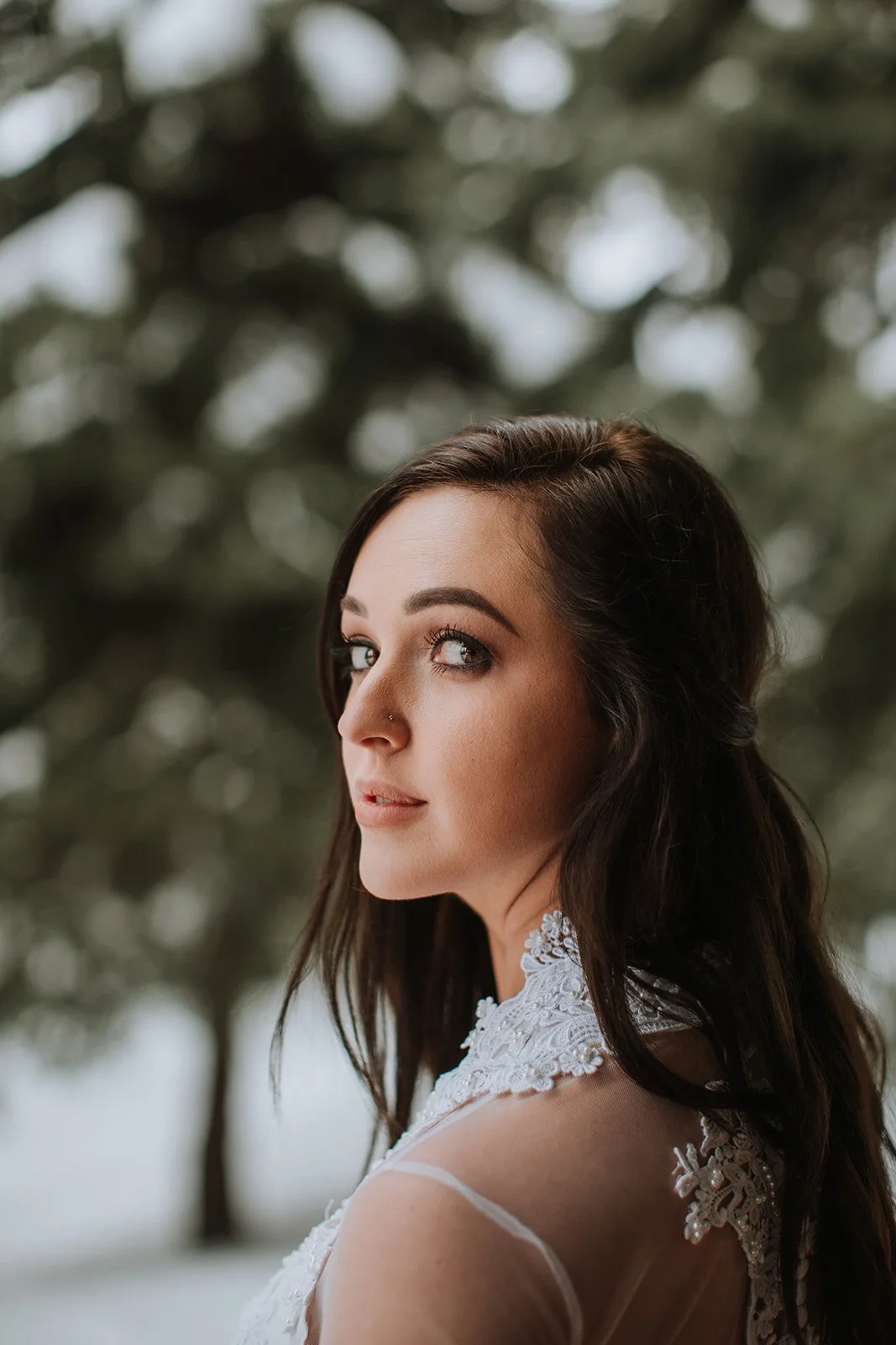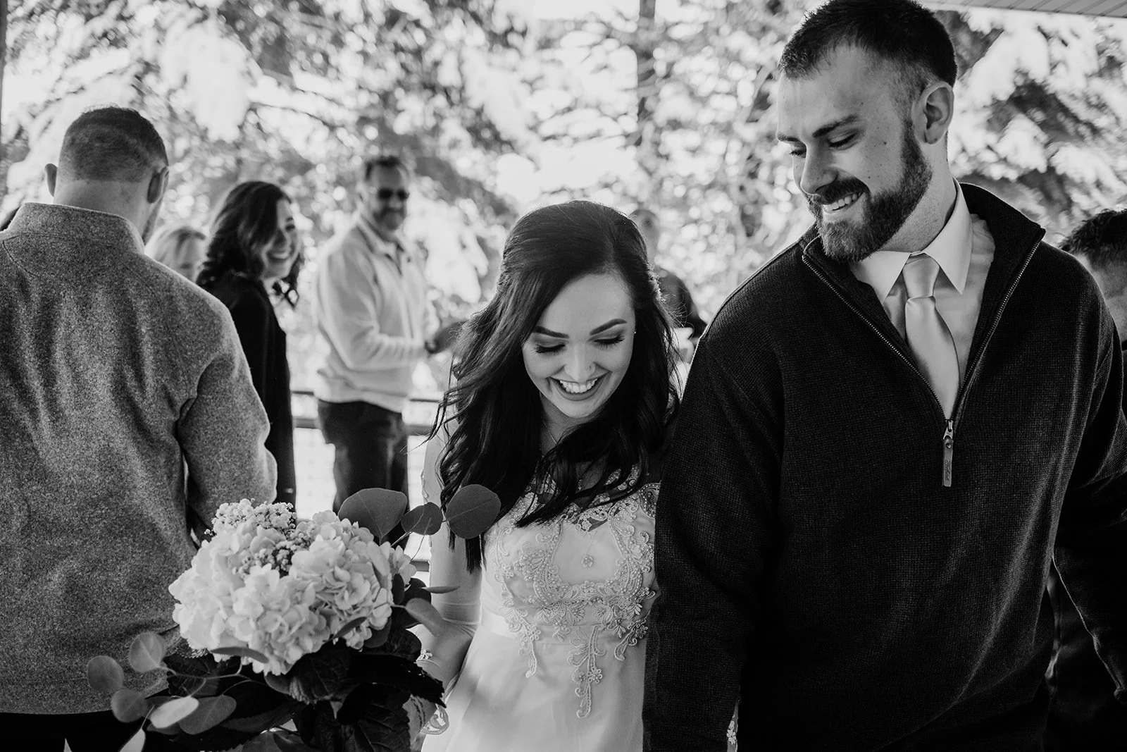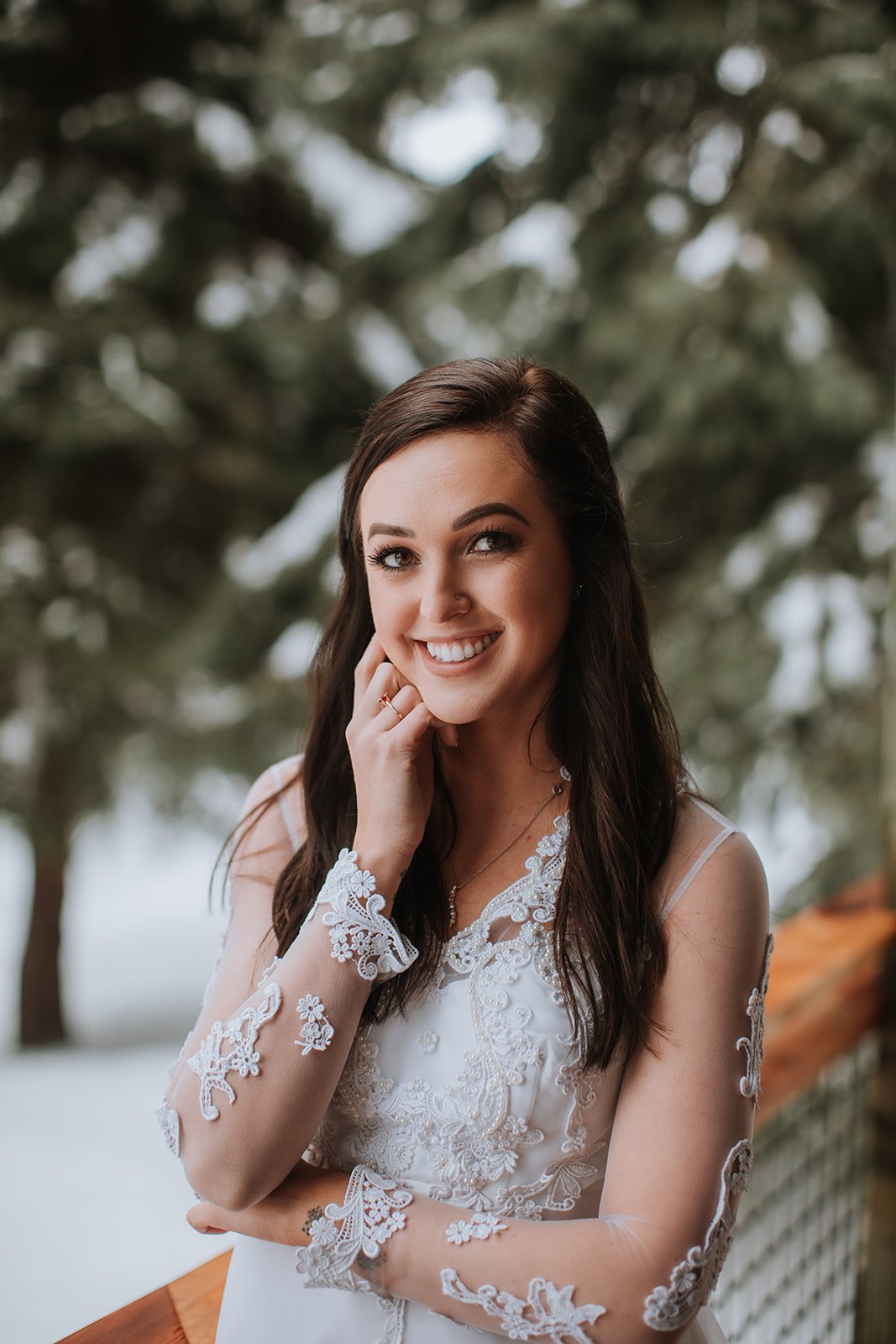 Brianna wore a stunning long-sleeve lace gown — delicate floral appliqué running down sheer sleeves, her bouquet a simple arrangement of white hydrangeas and eucalyptus that felt just right against all that snow. She was radiant. The kind of bride who looks like she belongs exactly where she is. Justin looked at her the way you hope someone will look at you — like he couldn't believe his luck and also absolutely knew what he was doing.