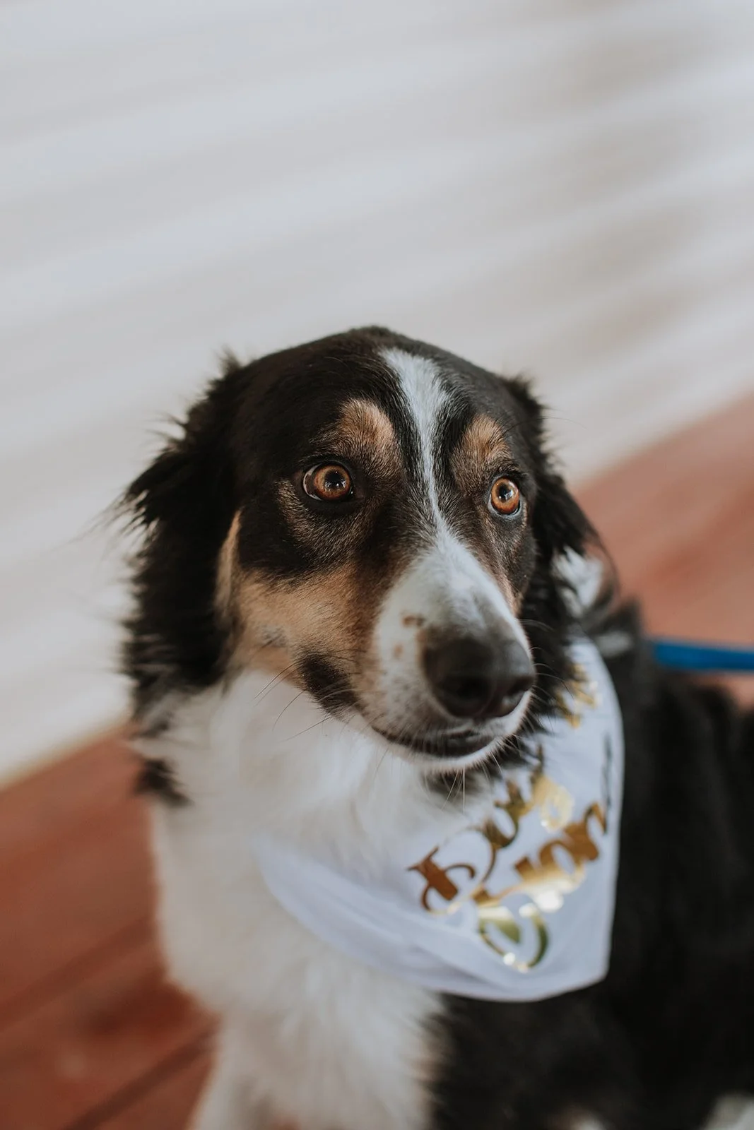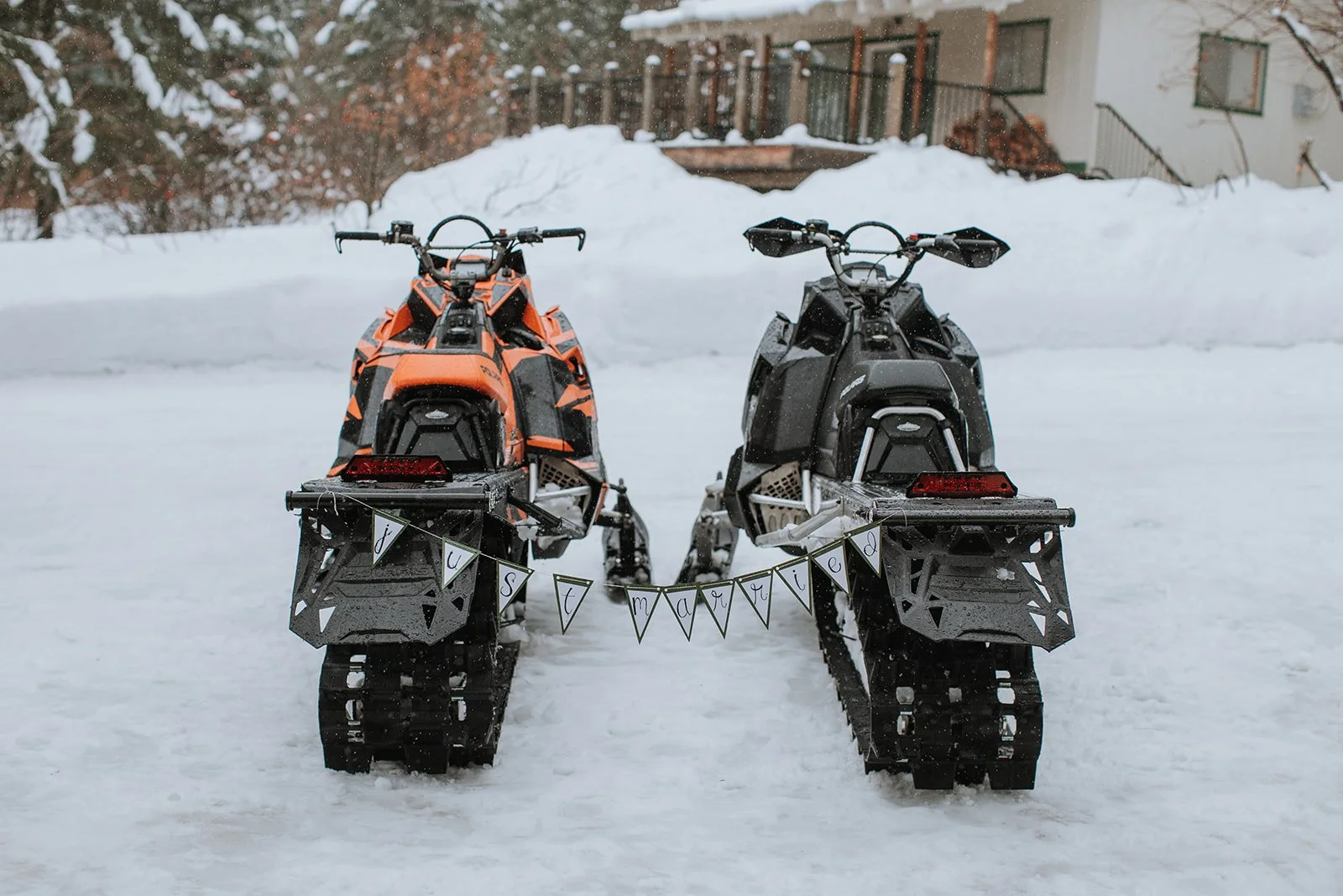 The ceremony was intimate and full of laughter. Their dog — dressed for the occasion in a proper "ring bearer" bandana — sat front and center like he had been rehearsing for weeks. After the vows, they posed between their two snowmobiles in the driveway, tin cans scattered in the snow below, banner swinging in the cold air. It was the most them possible exit and I loved every second of it.