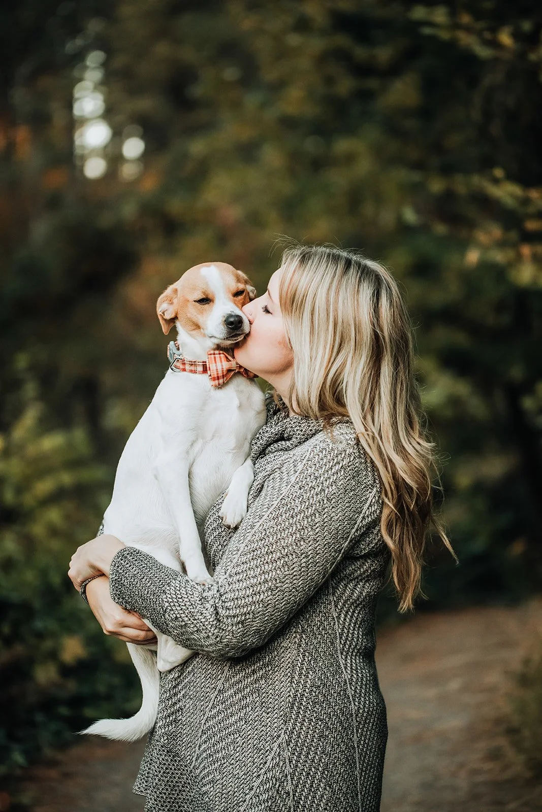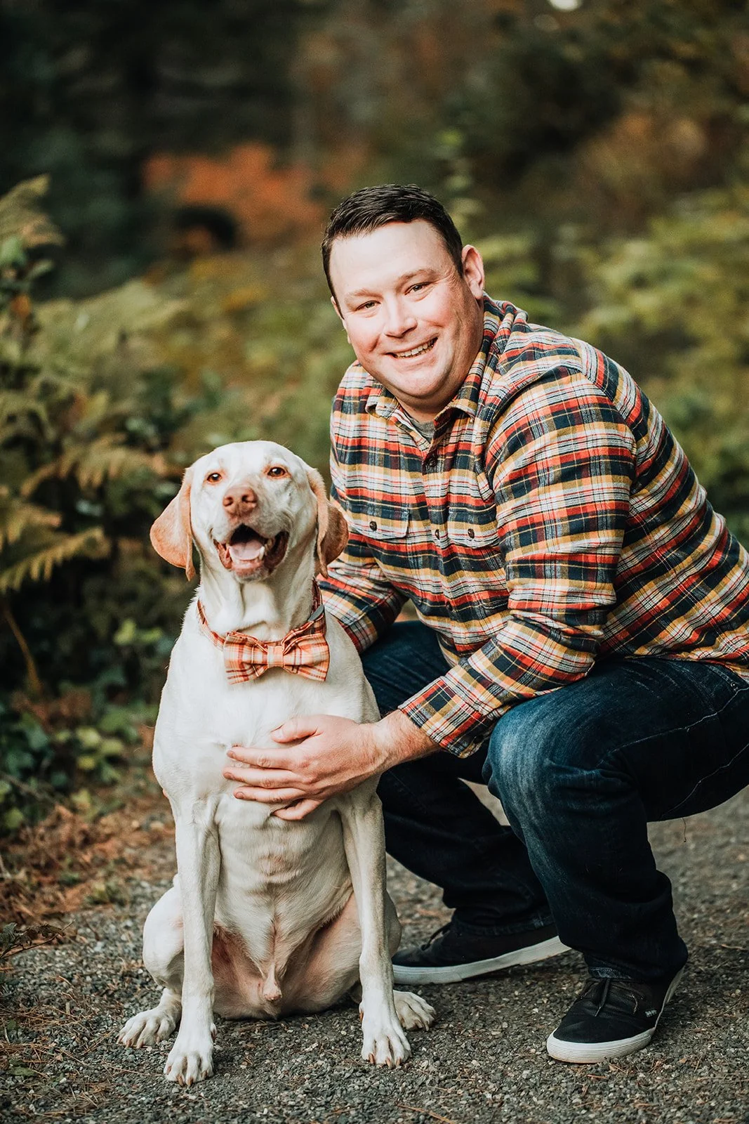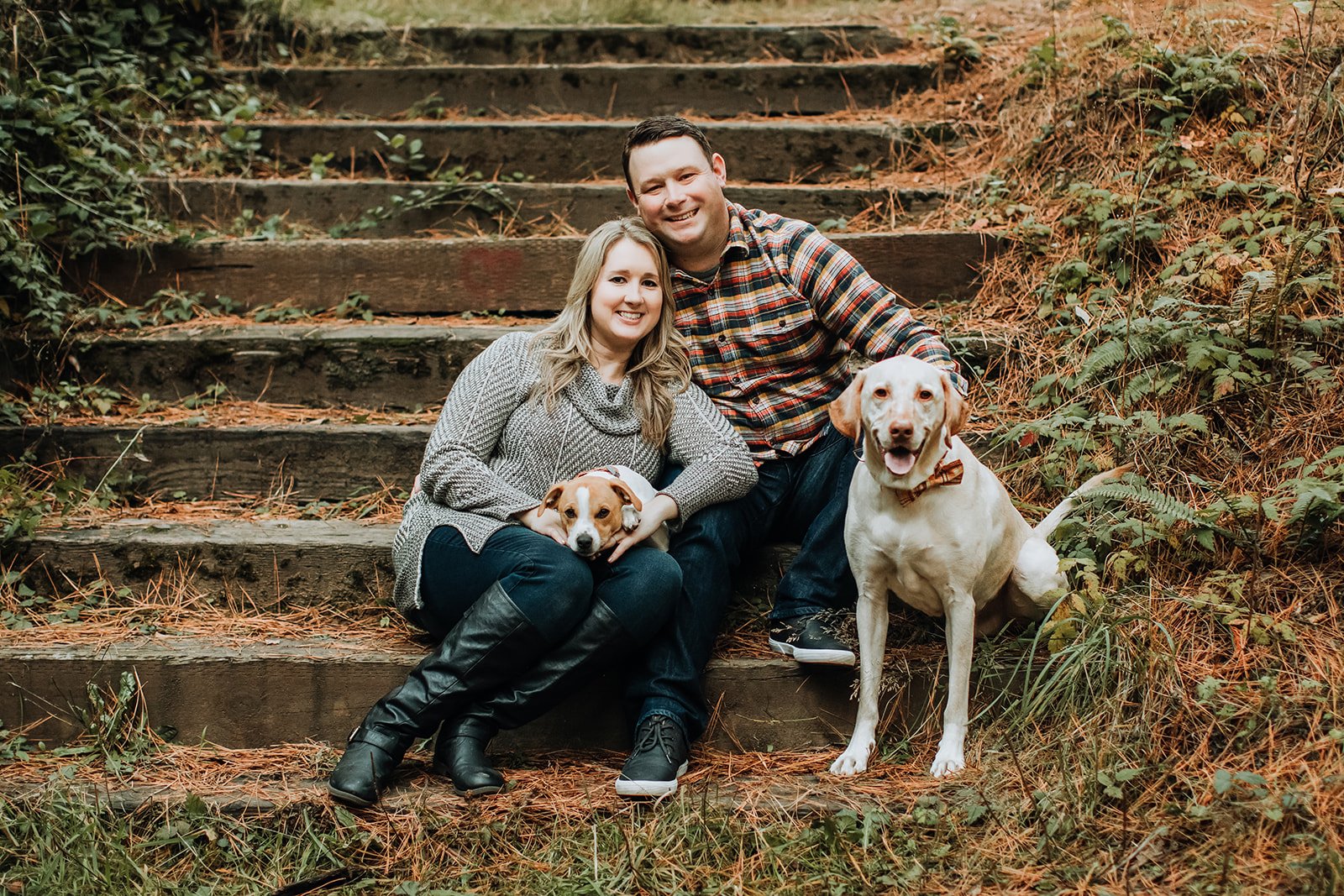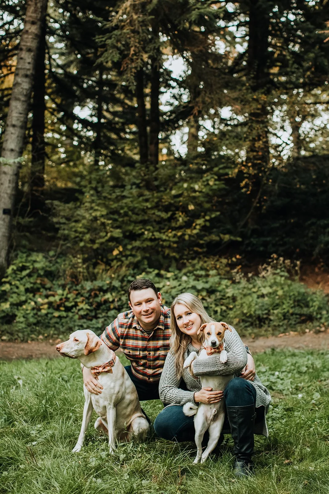 Allie and Ryan brought both of them to their engagement session at Hoyt Arboretum — a Jack Russell mix and a yellow Lab — and the dogs were, to be clear, fully committed to the session. The Lab sat beside them on the mossy steps with the dignity of someone who had done this before. The Jack Russell was held, which was probably the right call.