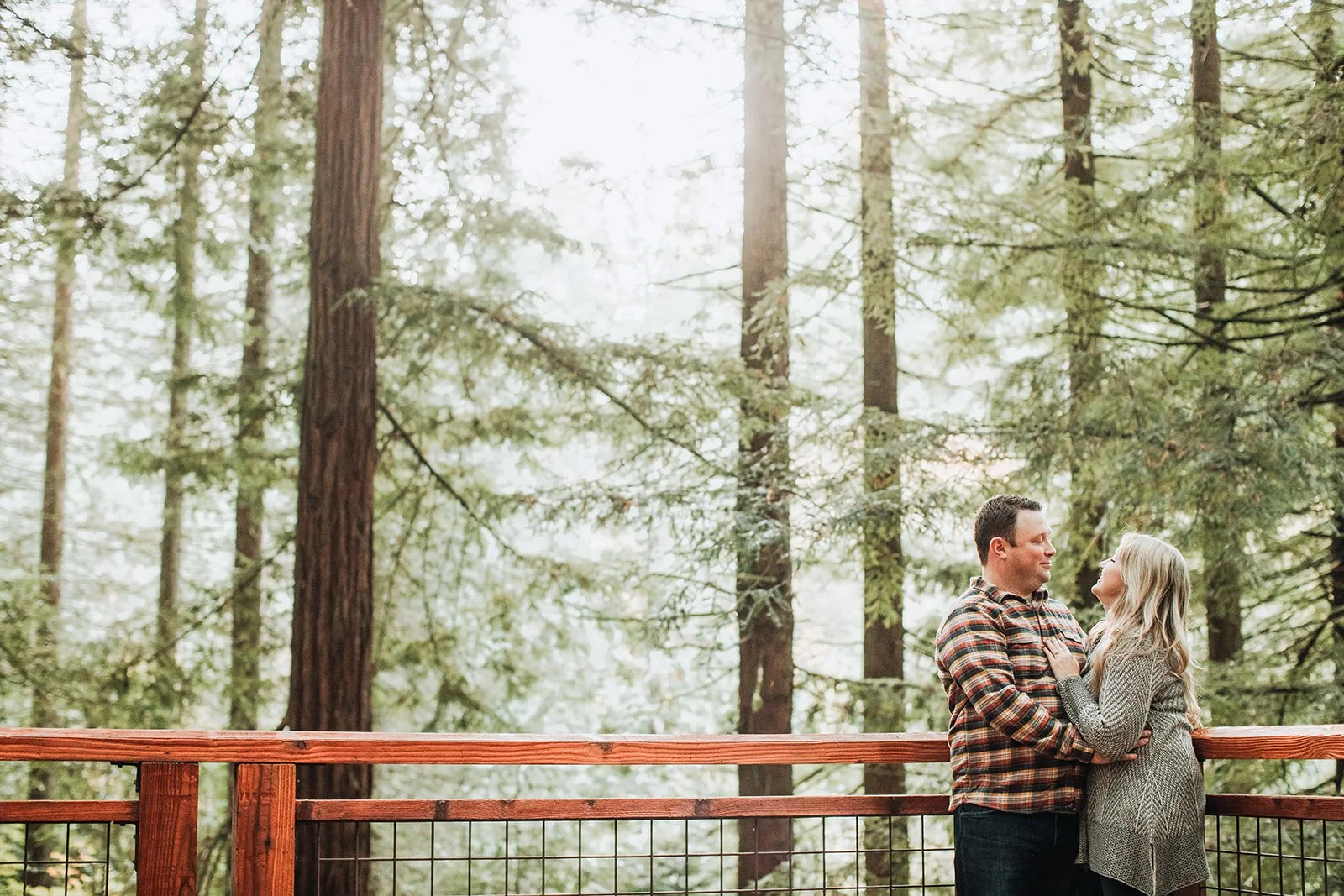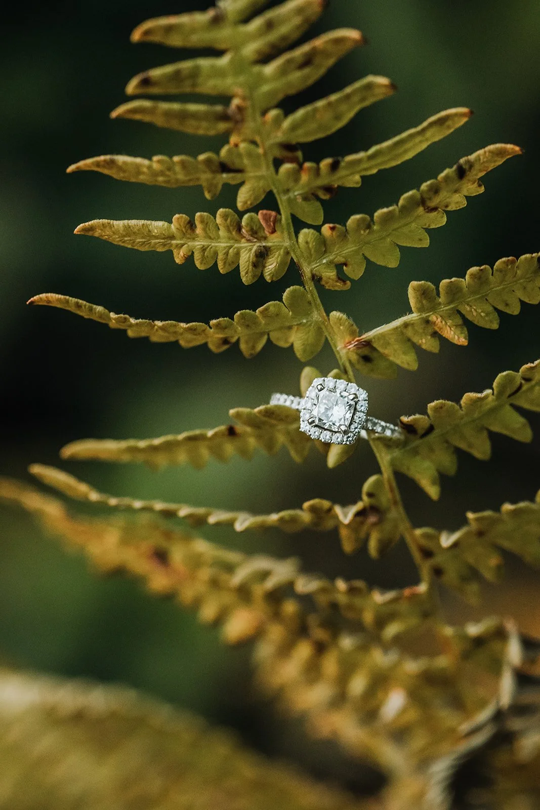 We kissed on the redwood deck. We wandered the forest trails. We tucked the ring into a fern for a detail shot, the cushion-cut diamond and its diamond halo catching what filtered light came down through the canopy. It belongs there.