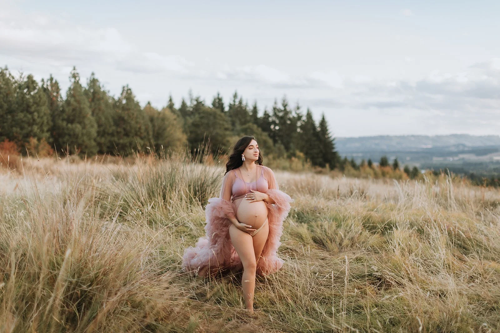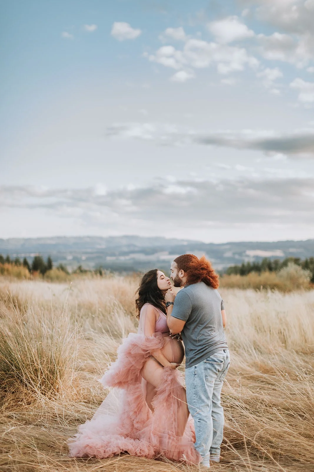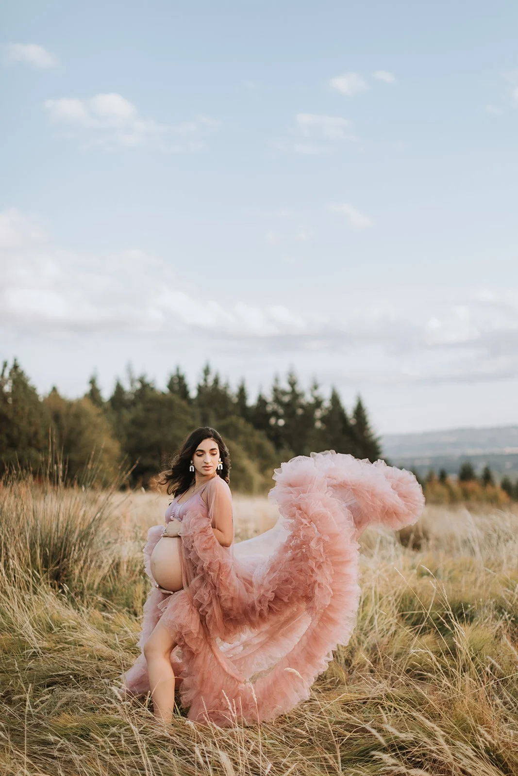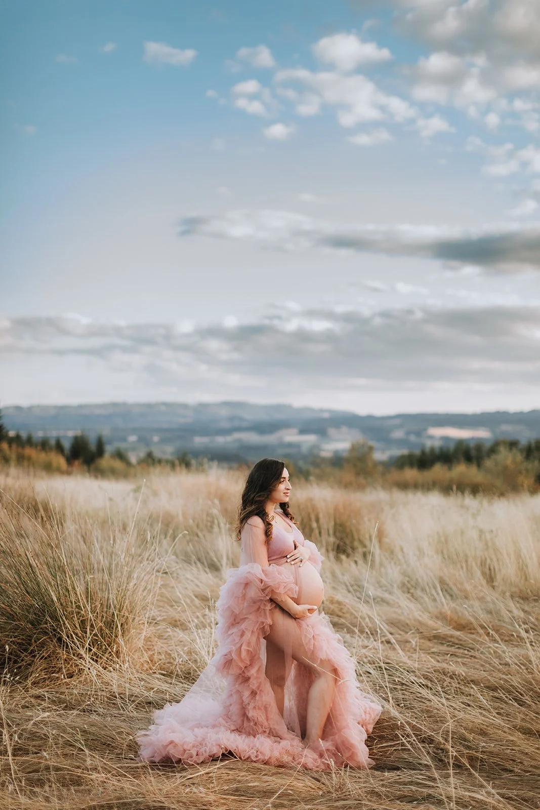 It's blush pink, floor-length, made entirely of ruffled tulle — layers and layers of it, the kind that catches every breath of wind and moves like something out of a film. Andrea wore it on a hilltop at Cooper Mountain Nature Park above the golden autumn grass and the wide Tualatin Valley, with a dramatic cloud-streaked sky overhead, and I genuinely had to remind myself to keep shooting because I kept just looking.