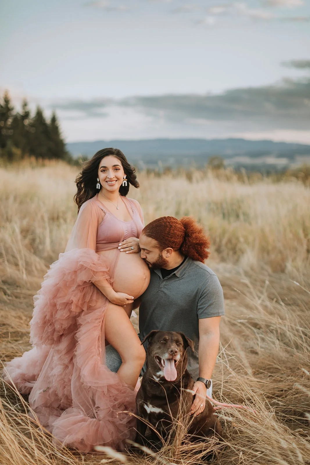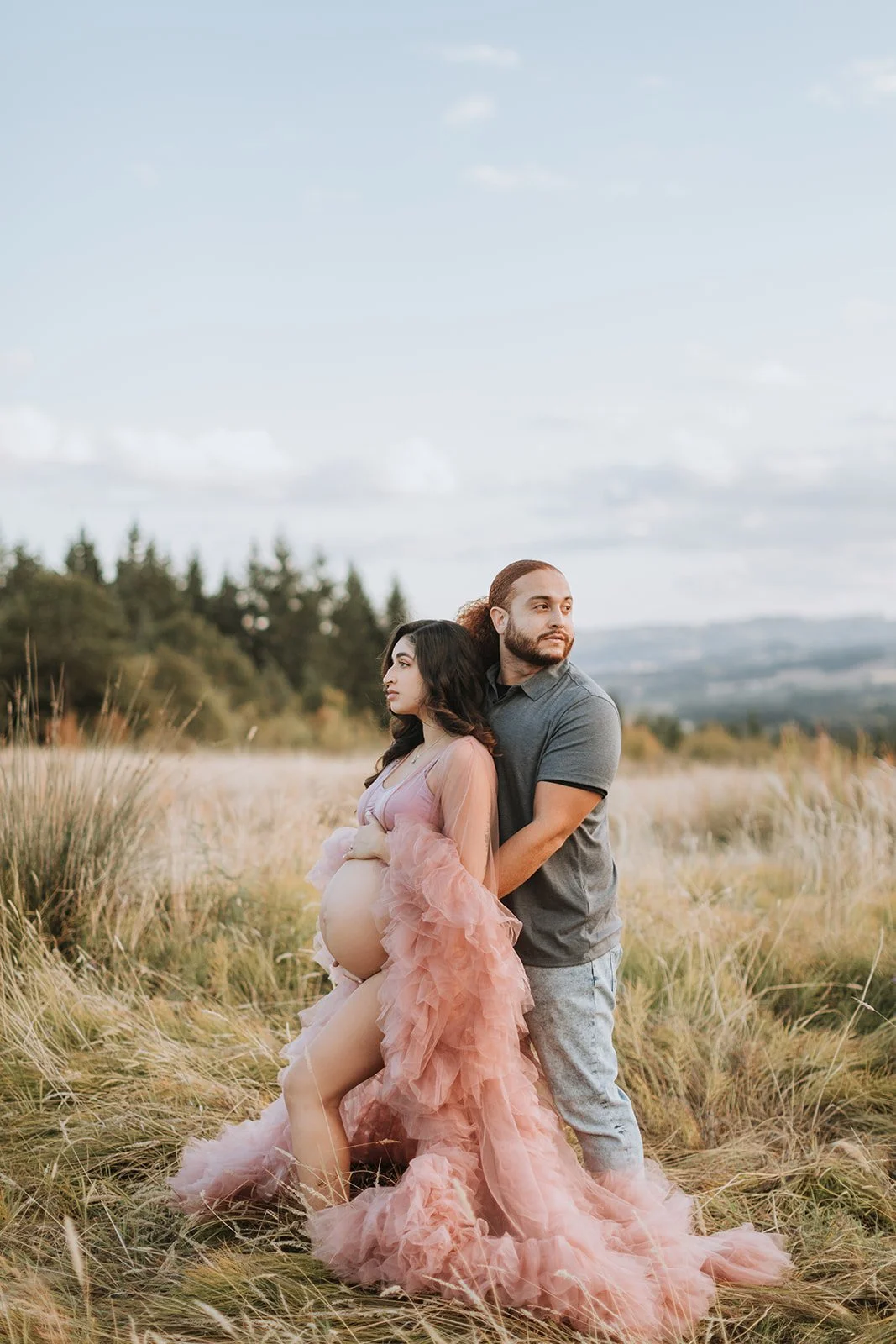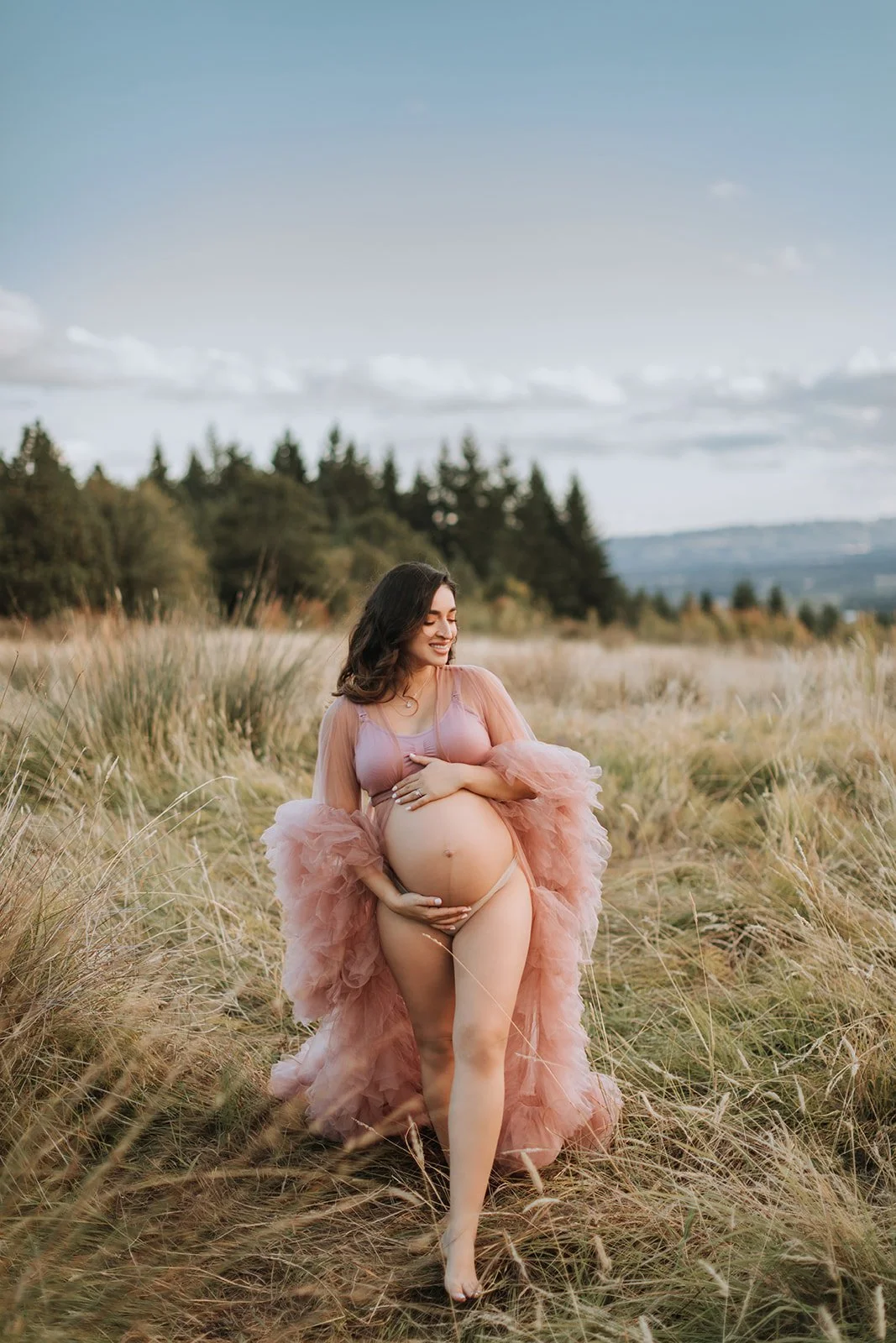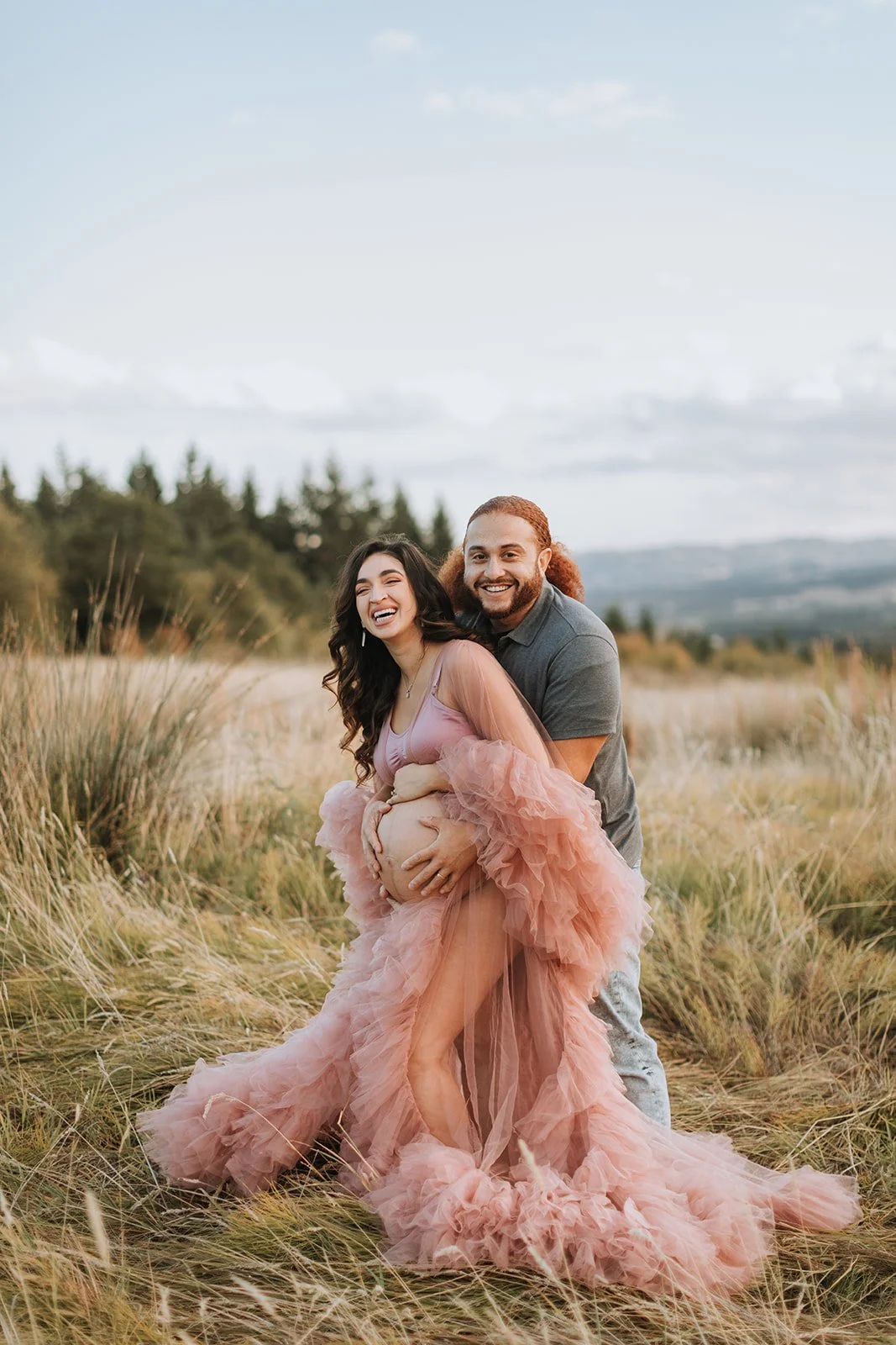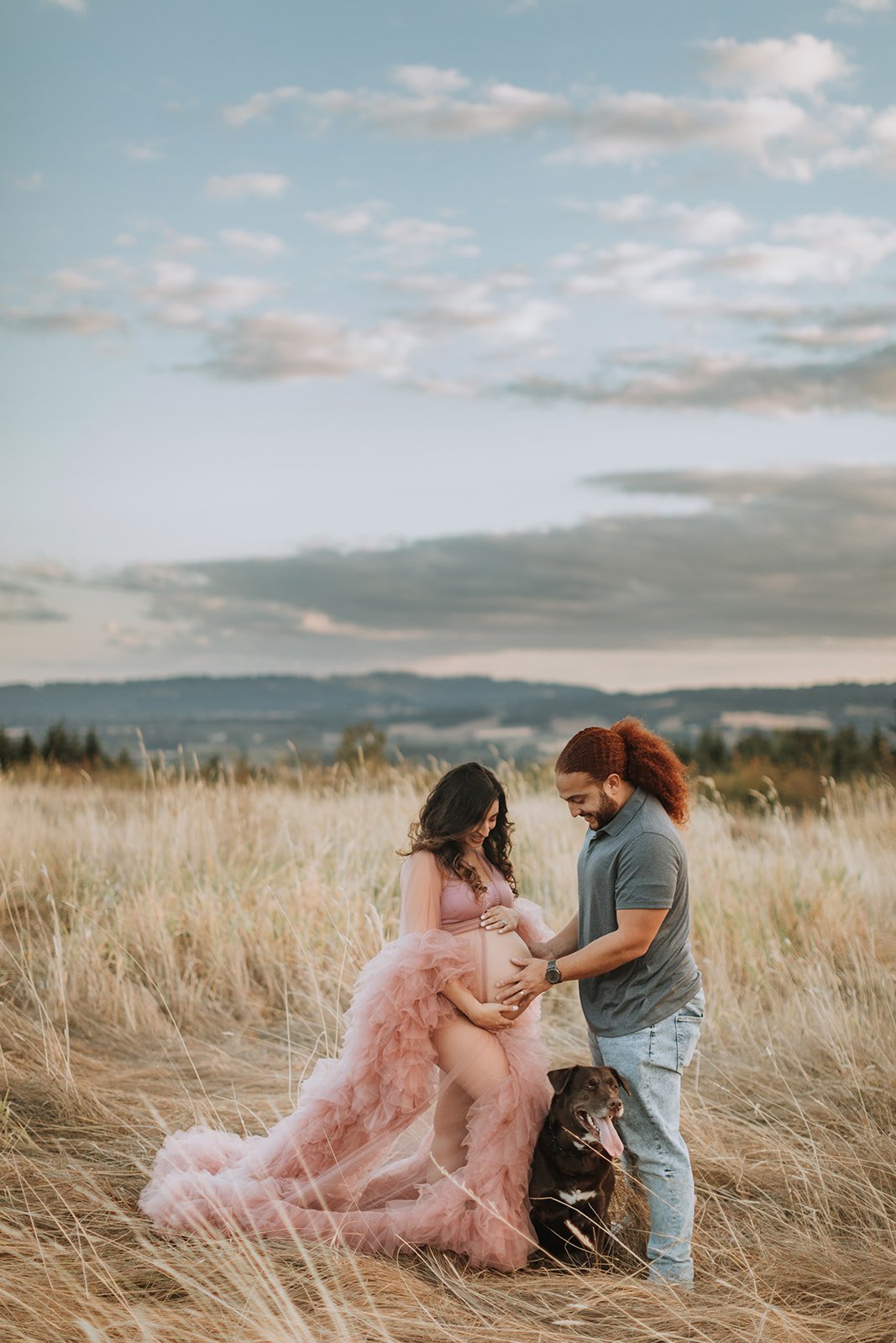 It's blush pink, floor-length, made entirely of ruffled tulle — layers and layers of it, the kind that catches every breath of wind and moves like something out of a film. Andrea wore it on a hilltop at Cooper Mountain Nature Park above the golden autumn grass and the wide Tualatin Valley, with a dramatic cloud-streaked sky overhead, and I genuinely had to remind myself to keep shooting because I kept just looking.