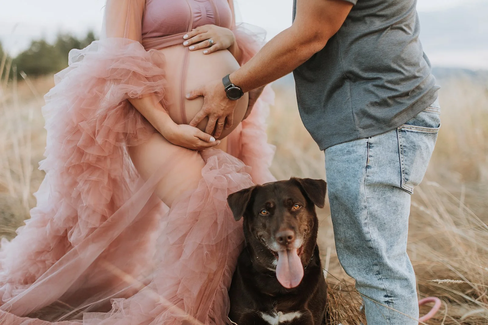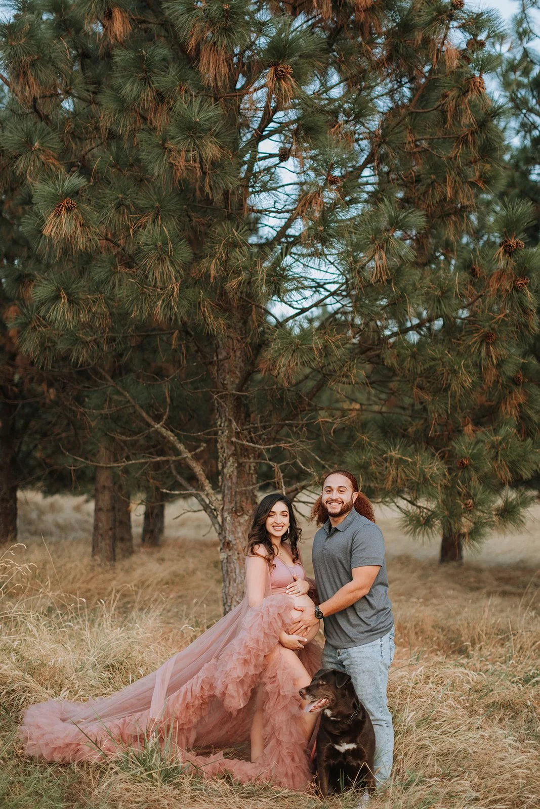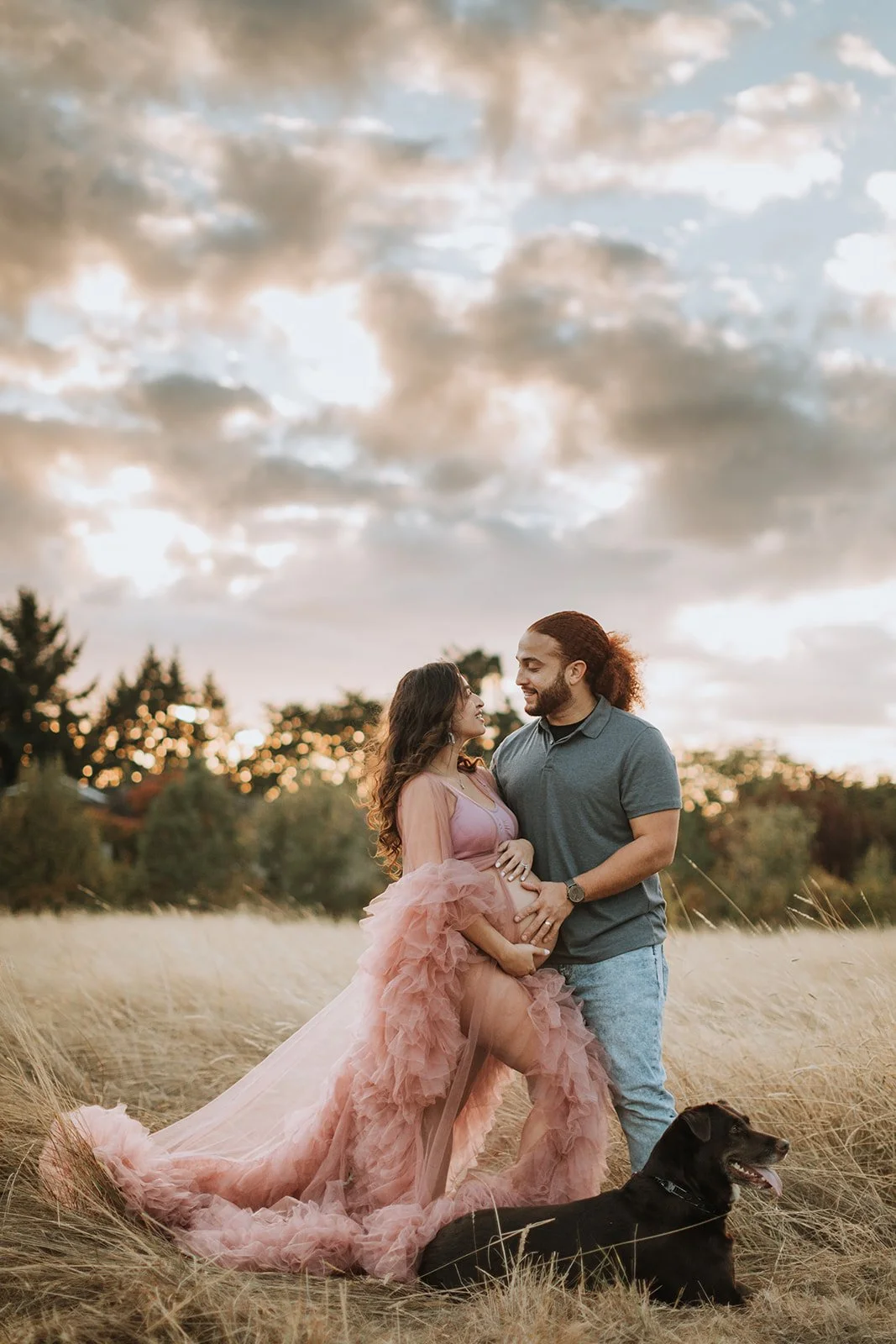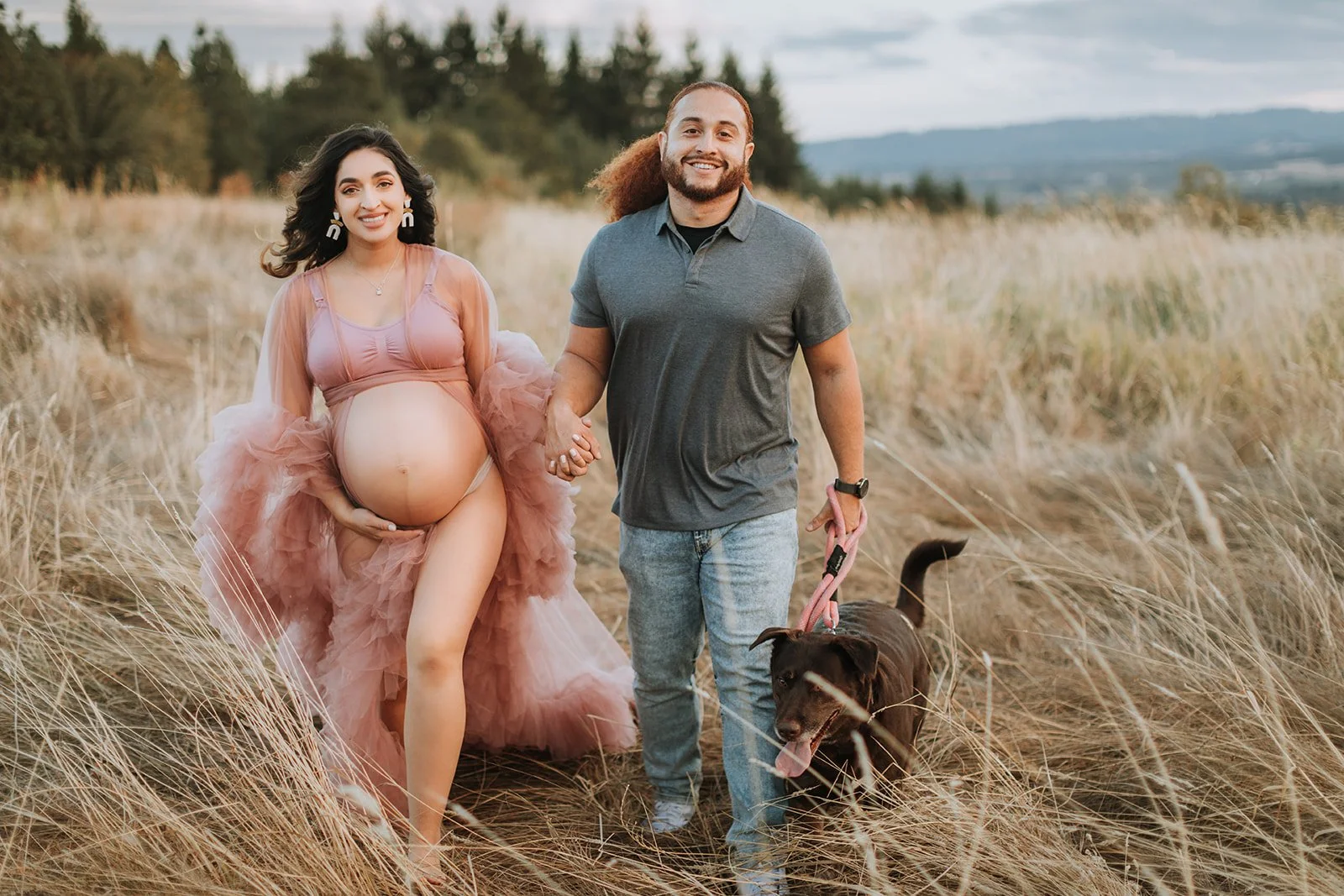 It's blush pink, floor-length, made entirely of ruffled tulle — layers and layers of it, the kind that catches every breath of wind and moves like something out of a film. Andrea wore it on a hilltop at Cooper Mountain Nature Park above the golden autumn grass and the wide Tualatin Valley, with a dramatic cloud-streaked sky overhead, and I genuinely had to remind myself to keep shooting because I kept just looking.