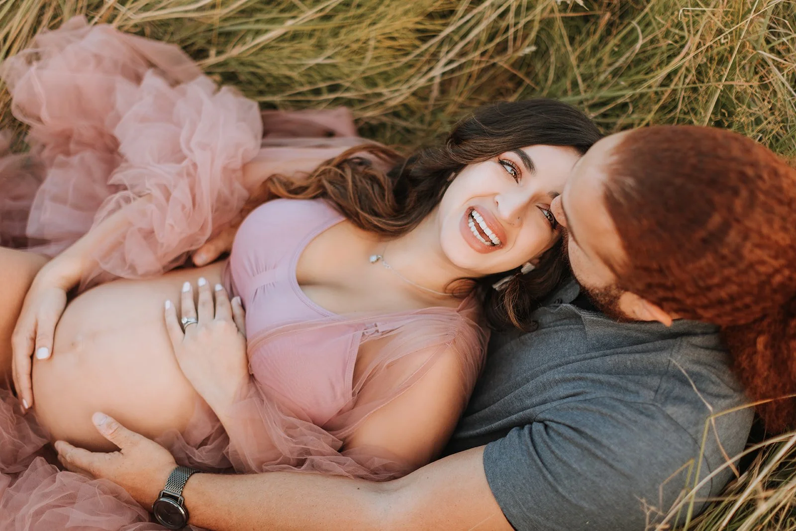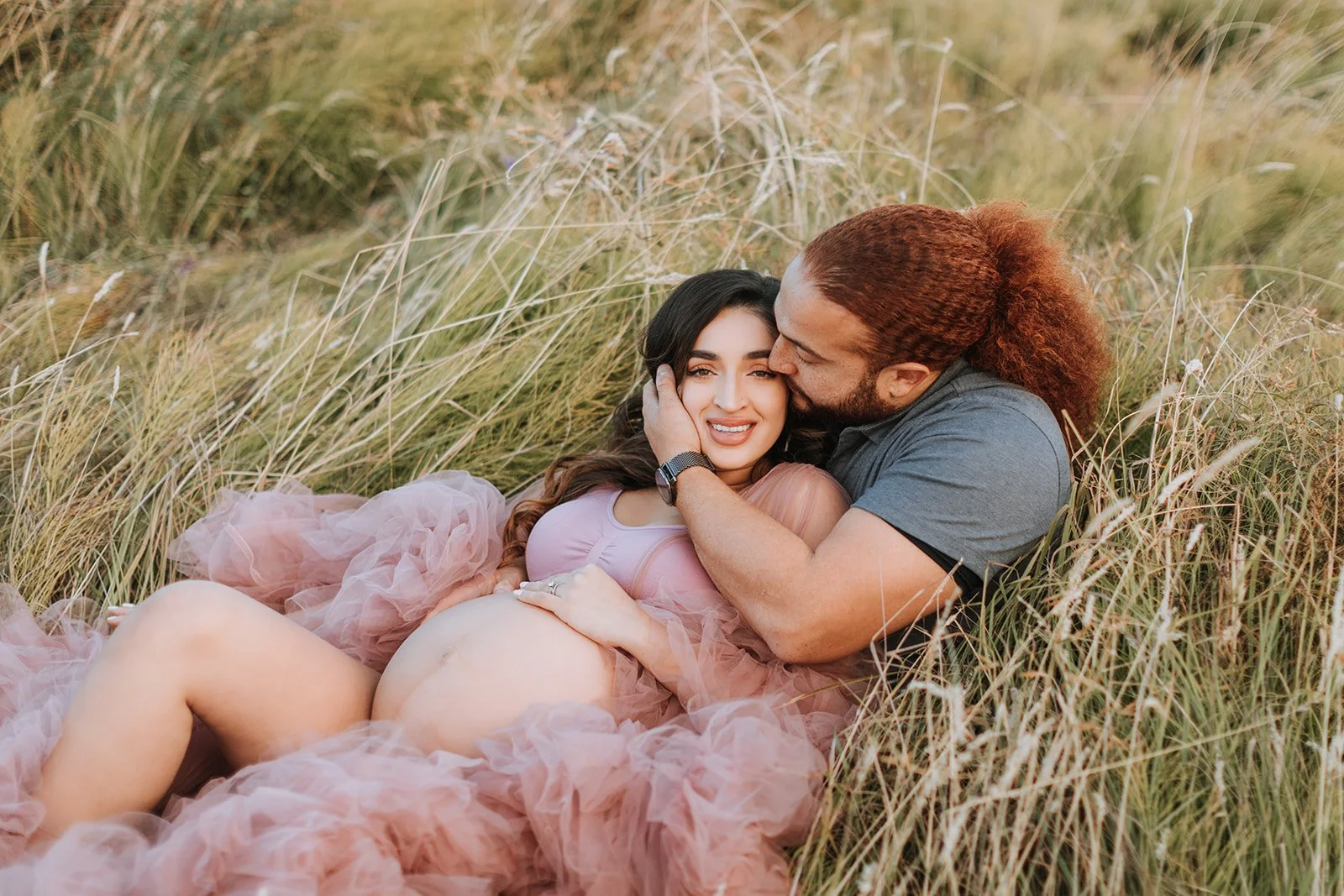 Deion was steady and warm through the whole session — the kind of partner who makes everything feel easy just by being present. The shot of the two of them lying in the grass, him kissing her cheek while she smiles at the camera, the pink tulle pooling around them — that one is everything.