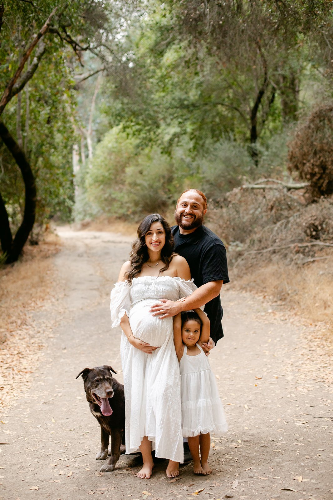 Andrea in a white off-shoulder gown, her daughter in a matching white dress, the two of them walking hand in hand down the trail — that image was always going to be something. But it was the little moments that made this session. The way their daughter draped herself over her dad's shoulders like she owned him completely, which she does. The quiet solo portrait of Andrea nestled into the rocks and greenery, just holding her bump and being still for a moment in the middle of all of it.