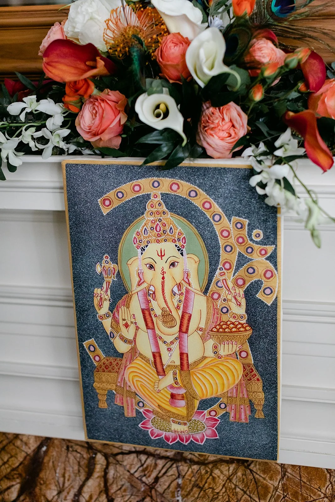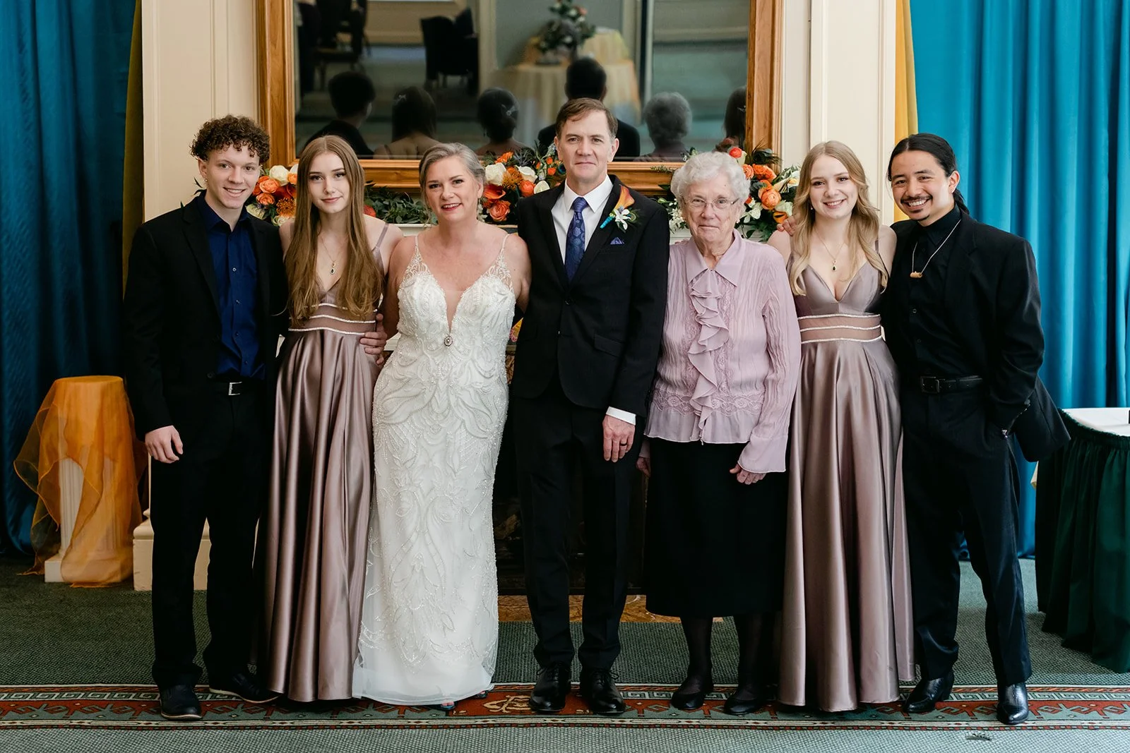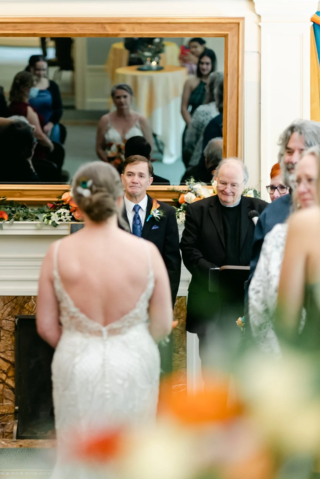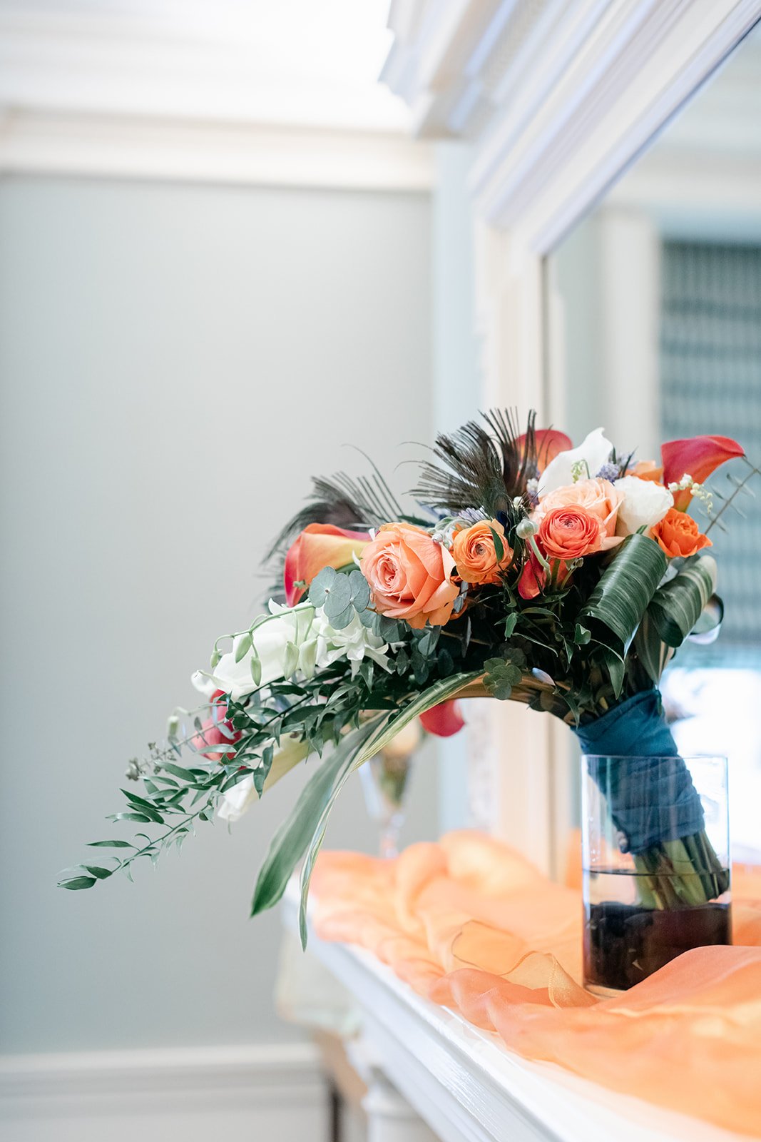 They chose the Arlington Club in Portland, which is exactly the right venue for a wedding with this kind of weight and elegance. One of Portland's oldest and most storied private clubs. The ceremony room with its fireplace, gilded mirror, and mantle draped in an extraordinary arrangement of orange calla lilies, coral roses, protea, peacock feathers, and white calla lilies was one of the most richly detailed setups I have ever photographed. Every corner was intentional.
