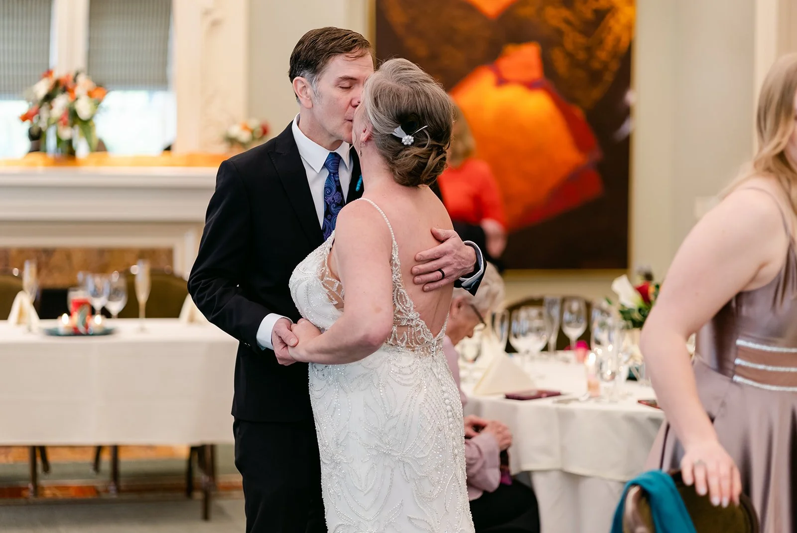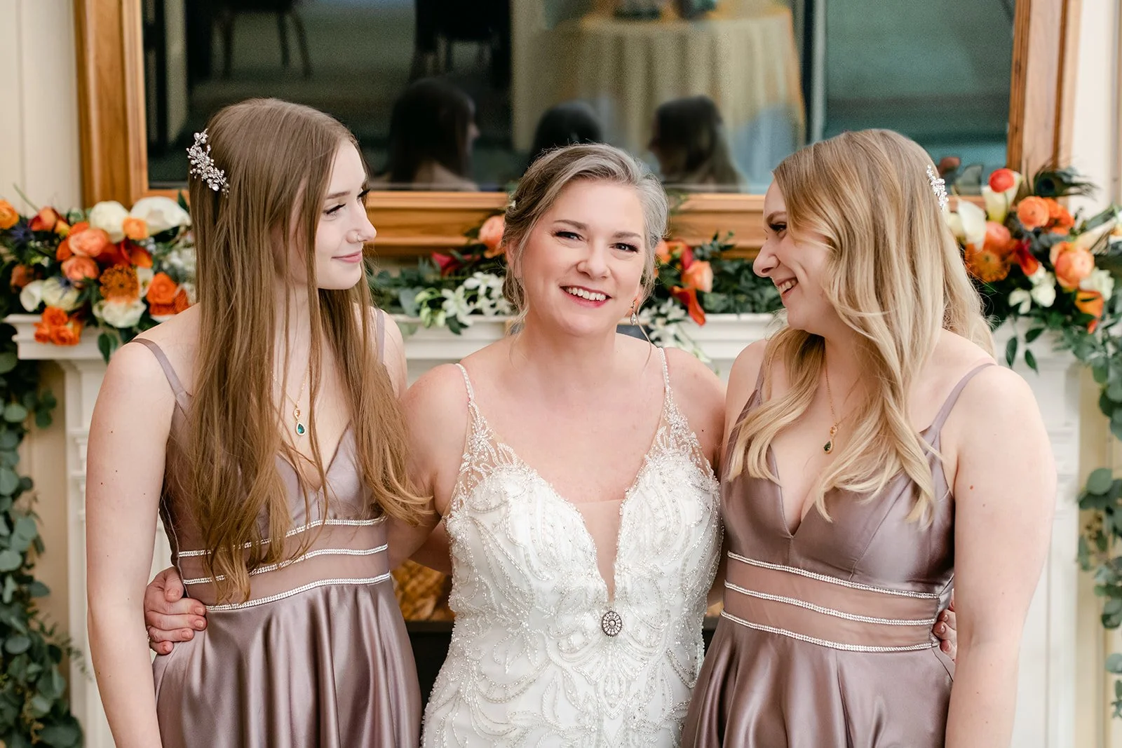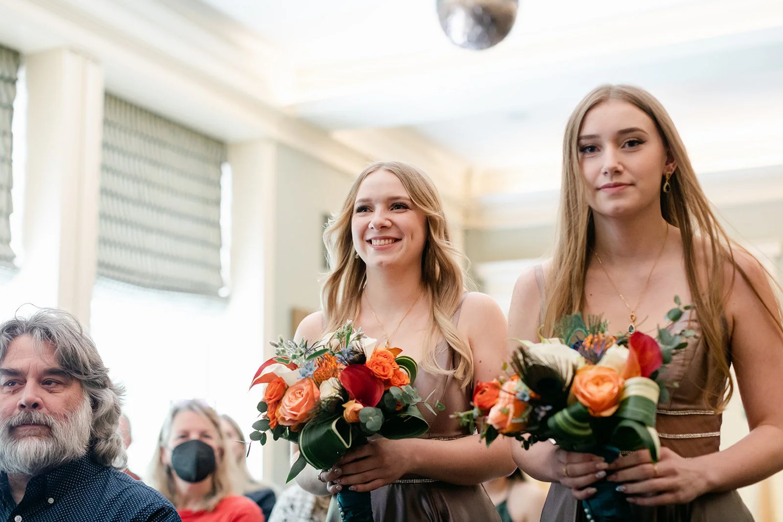 They chose the Arlington Club in Portland, which is exactly the right venue for a wedding with this kind of weight and elegance. One of Portland's oldest and most storied private clubs. The ceremony room with its fireplace, gilded mirror, and mantle draped in an extraordinary arrangement of orange calla lilies, coral roses, protea, peacock feathers, and white calla lilies was one of the most richly detailed setups I have ever photographed. Every corner was intentional.