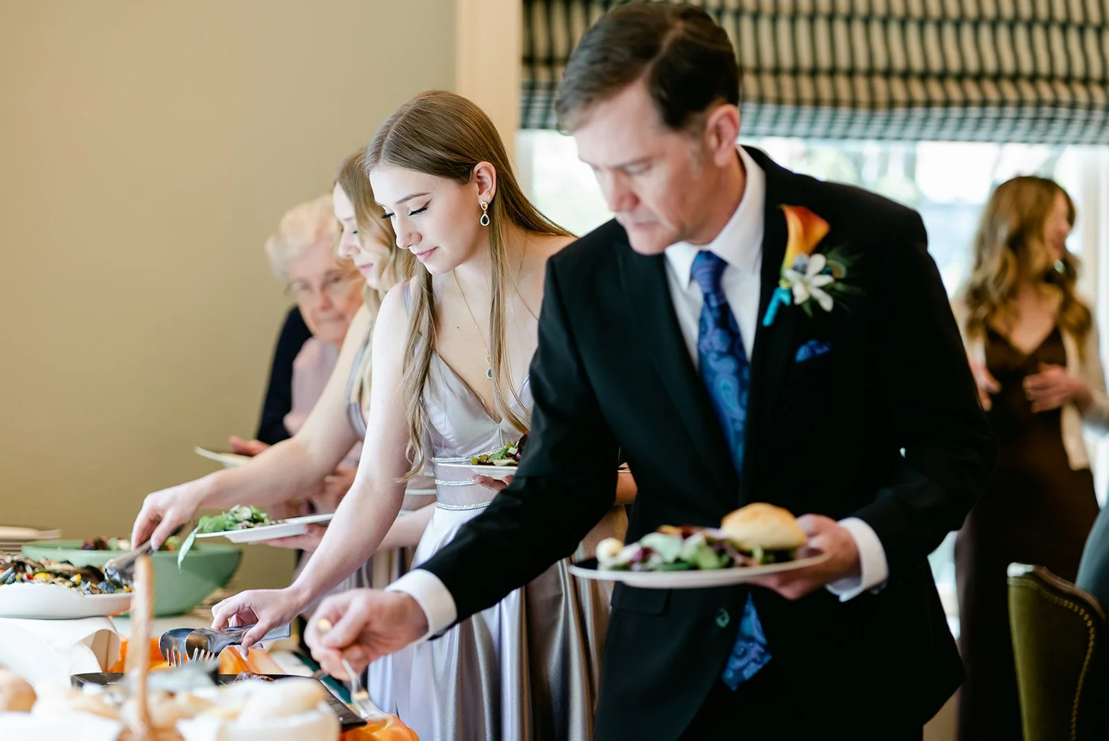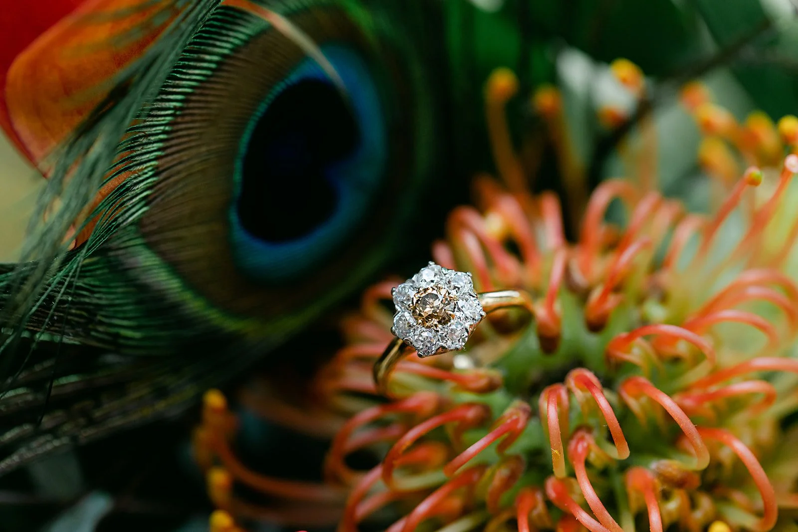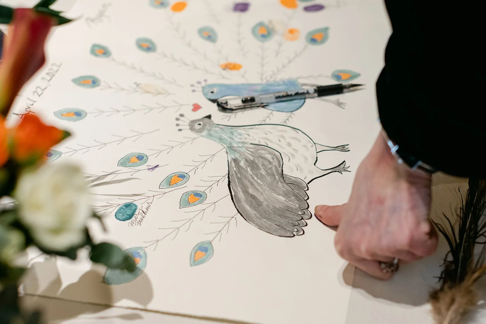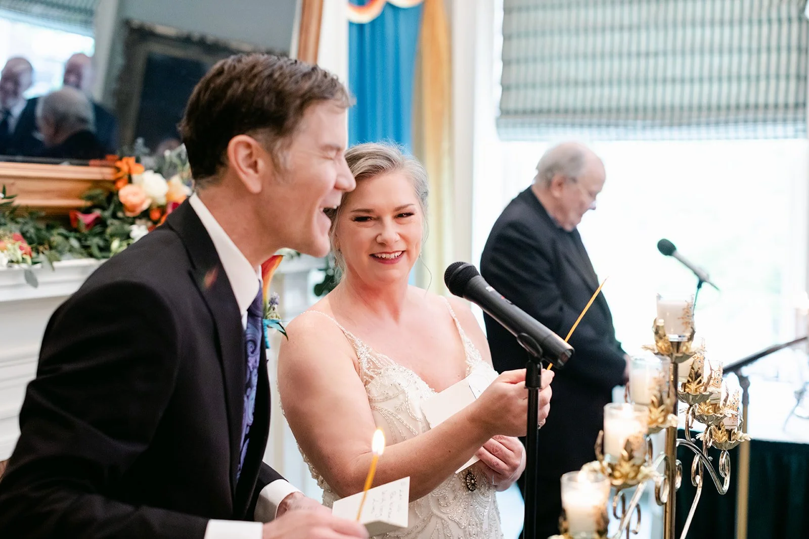 They chose the Arlington Club in Portland, which is exactly the right venue for a wedding with this kind of weight and elegance. One of Portland's oldest and most storied private clubs. The ceremony room with its fireplace, gilded mirror, and mantle draped in an extraordinary arrangement of orange calla lilies, coral roses, protea, peacock feathers, and white calla lilies was one of the most richly detailed setups I have ever photographed. Every corner was intentional.