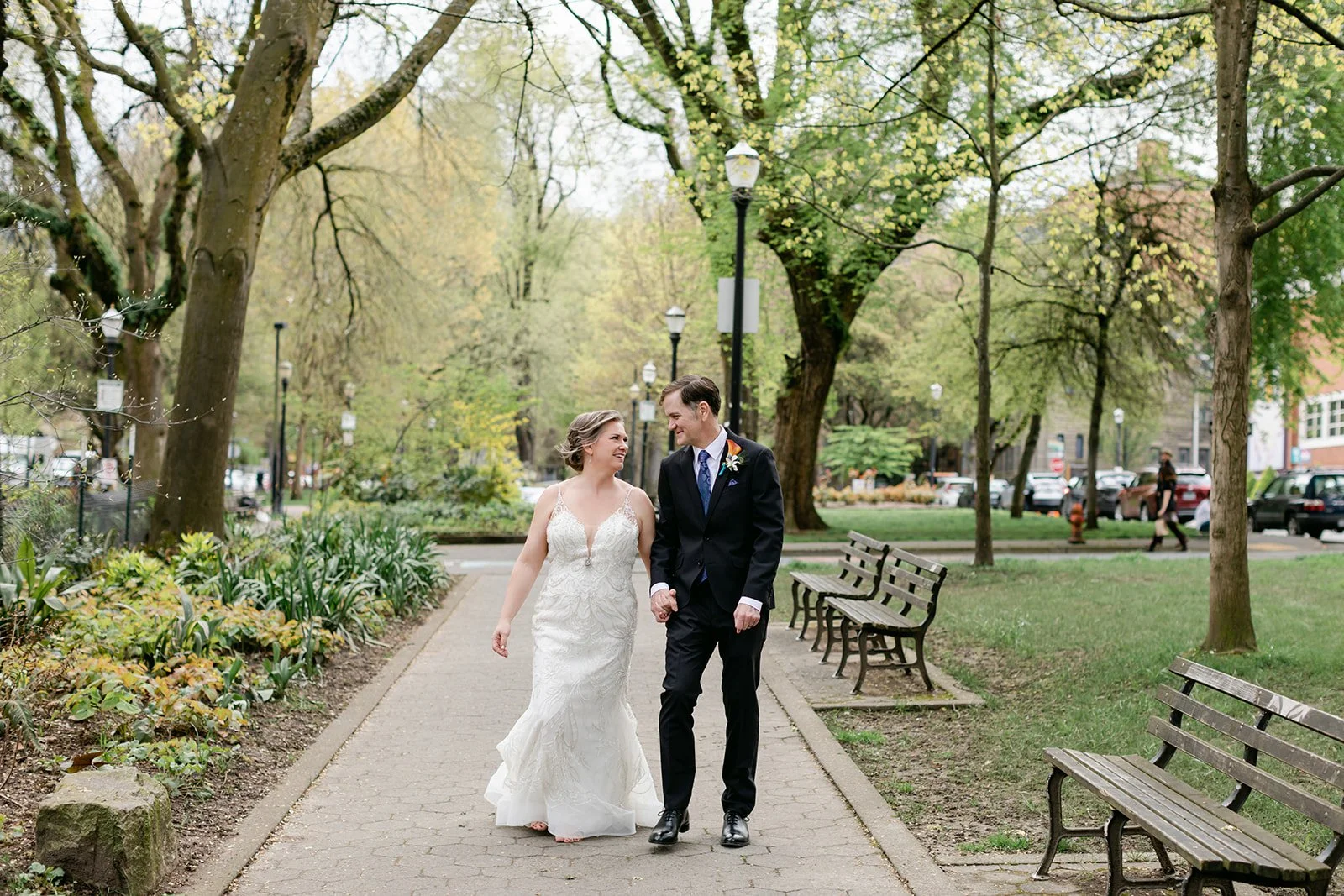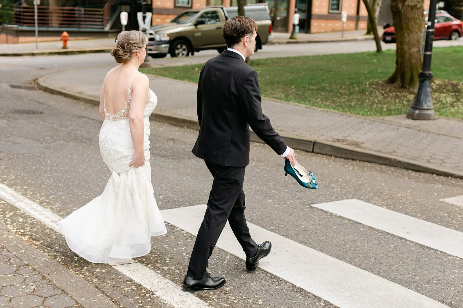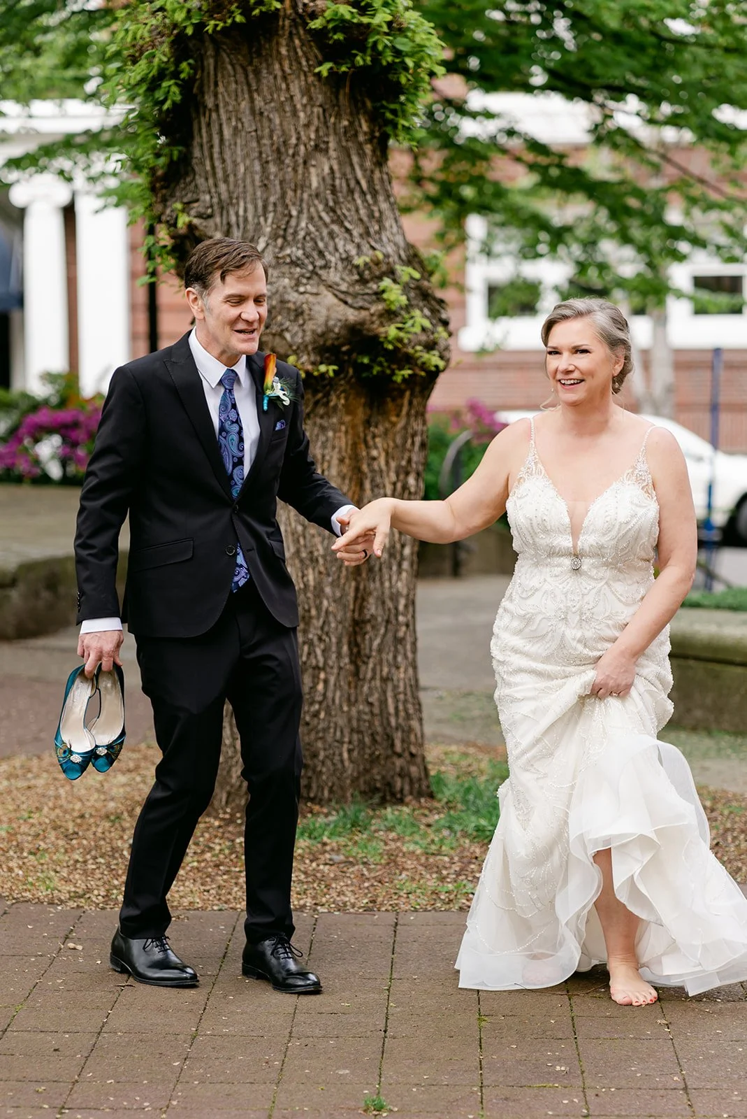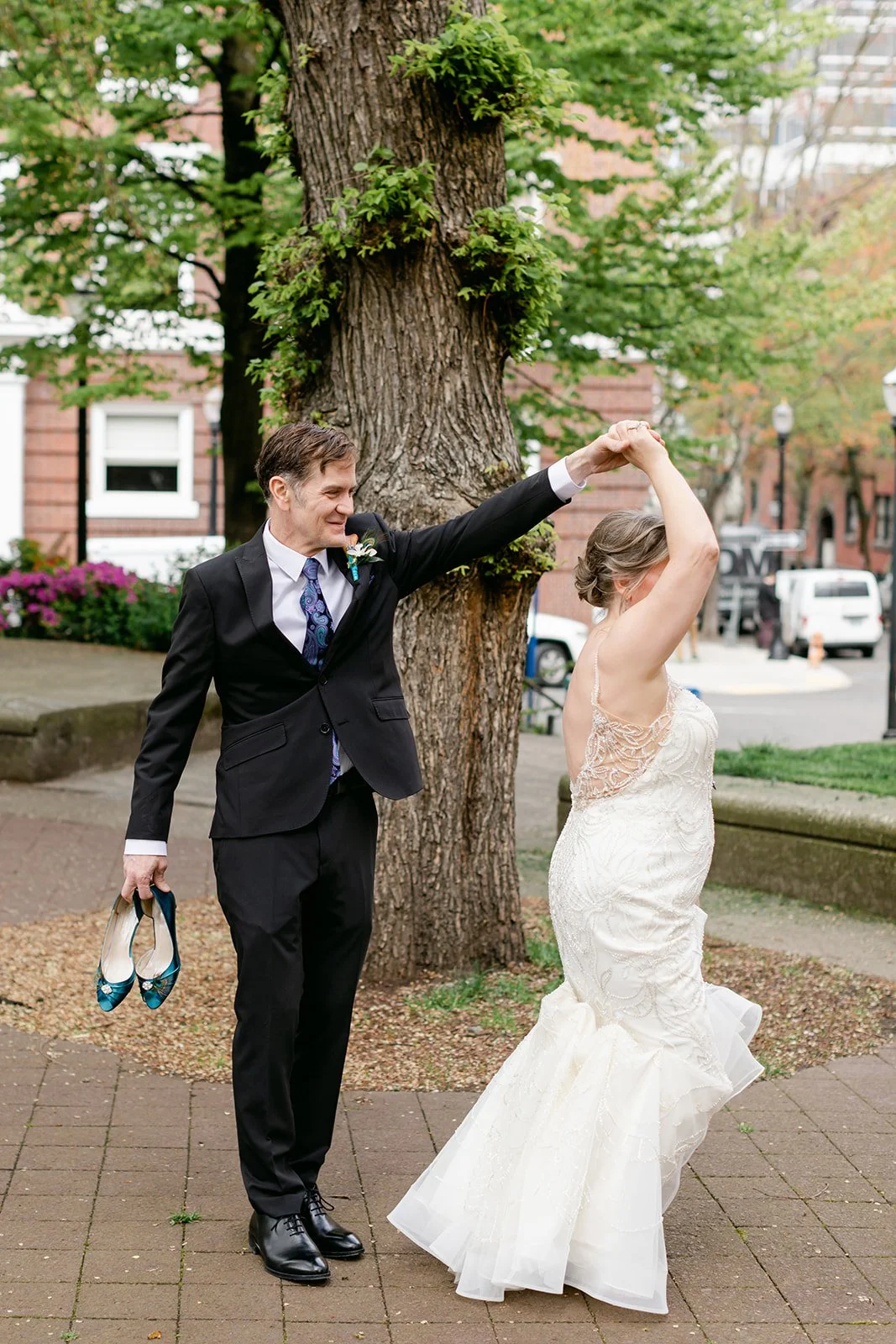 After the ceremony, we slipped out into the spring afternoon and walked to Portland's Park Blocks — that long green corridor of elm trees running through the heart of the city that has anchored Portland's cultural neighborhood for over a century. For Rachel and Ryan, it was personal. They had walked these same paths in the early days of their relationship, when everything was still new and uncertain. Coming back as a married couple, Ryan carrying her teal peacock heels in one hand and holding her hand with the other while she walked barefoot on the brick — that image says everything about who these two are.