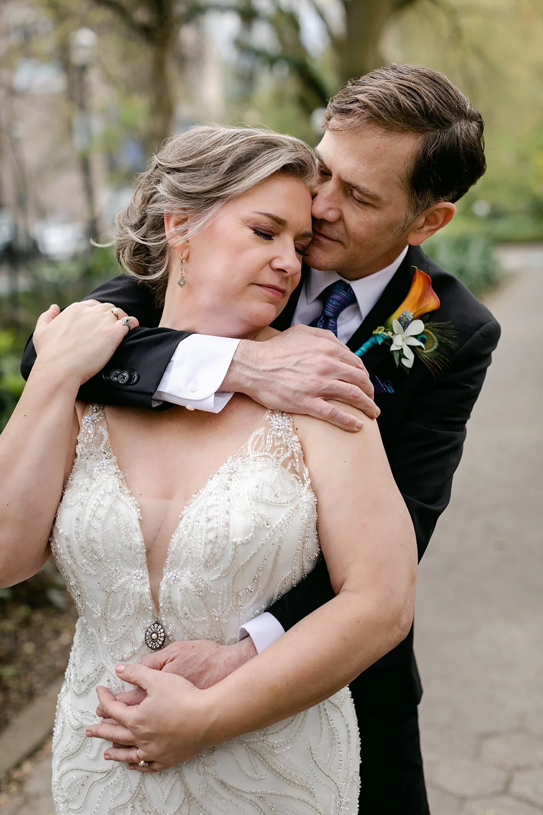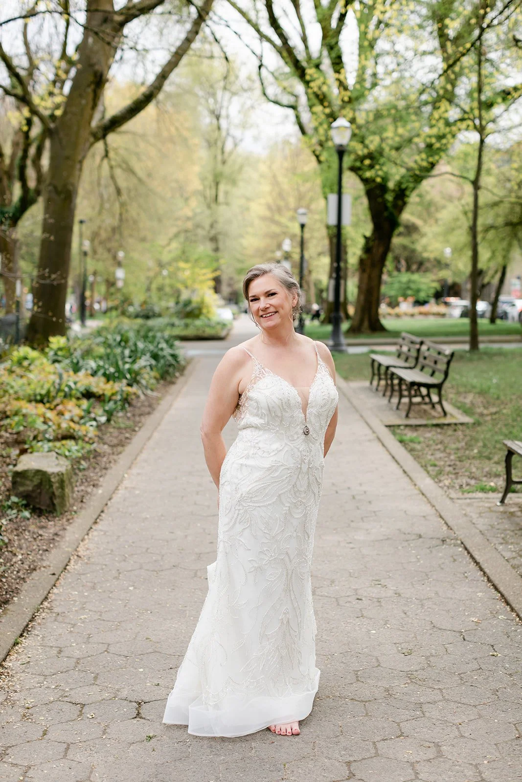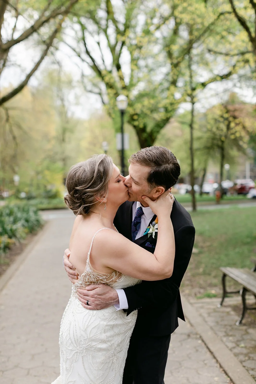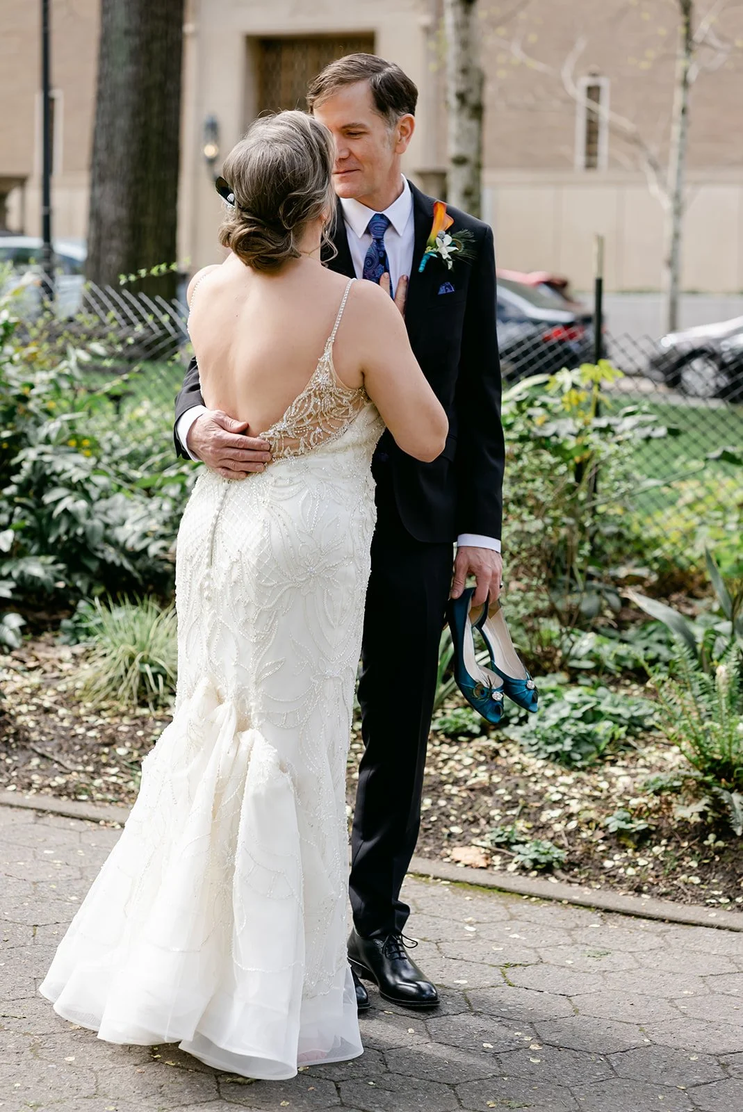 After the ceremony, we slipped out into the spring afternoon and walked to Portland's Park Blocks — that long green corridor of elm trees running through the heart of the city that has anchored Portland's cultural neighborhood for over a century. For Rachel and Ryan, it was personal. They had walked these same paths in the early days of their relationship, when everything was still new and uncertain. Coming back as a married couple, Ryan carrying her teal peacock heels in one hand and holding her hand with the other while she walked barefoot on the brick — that image says everything about who these two are.