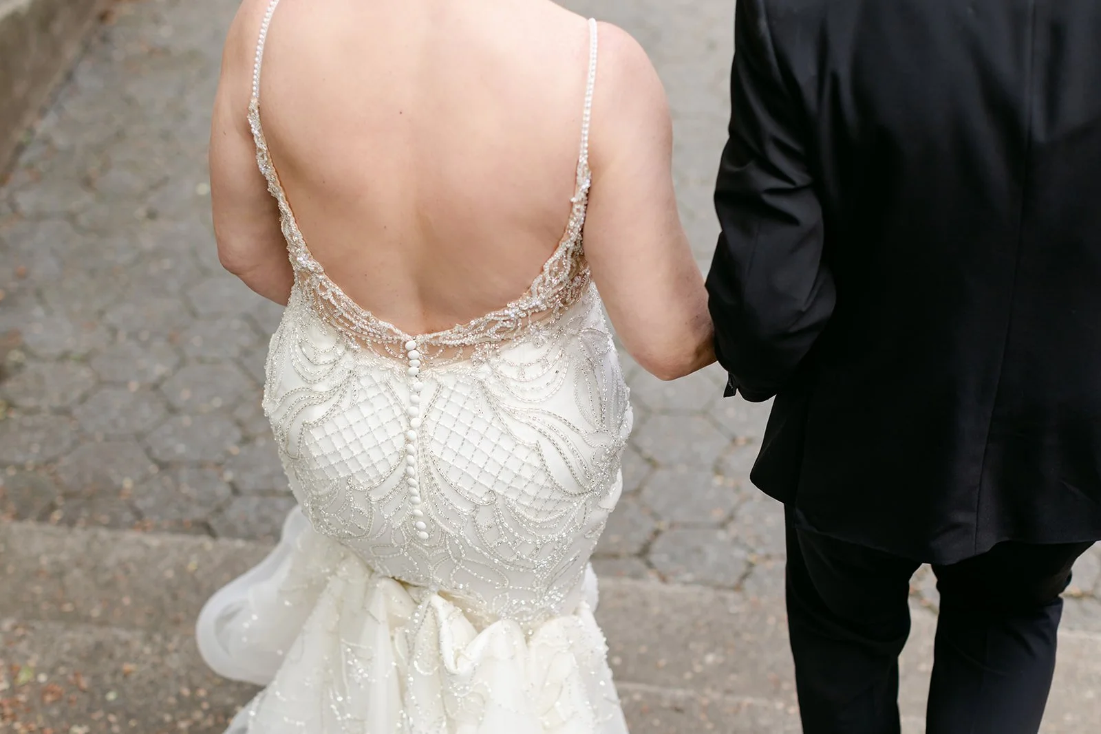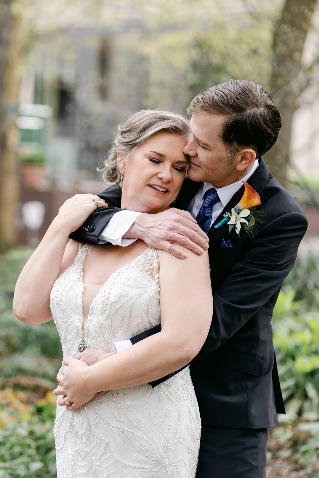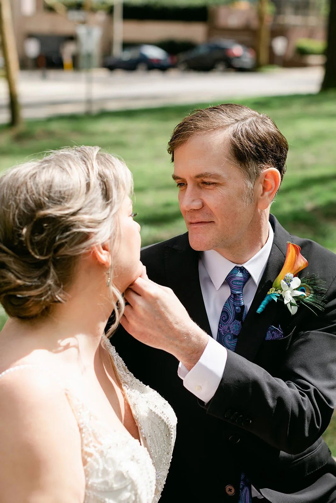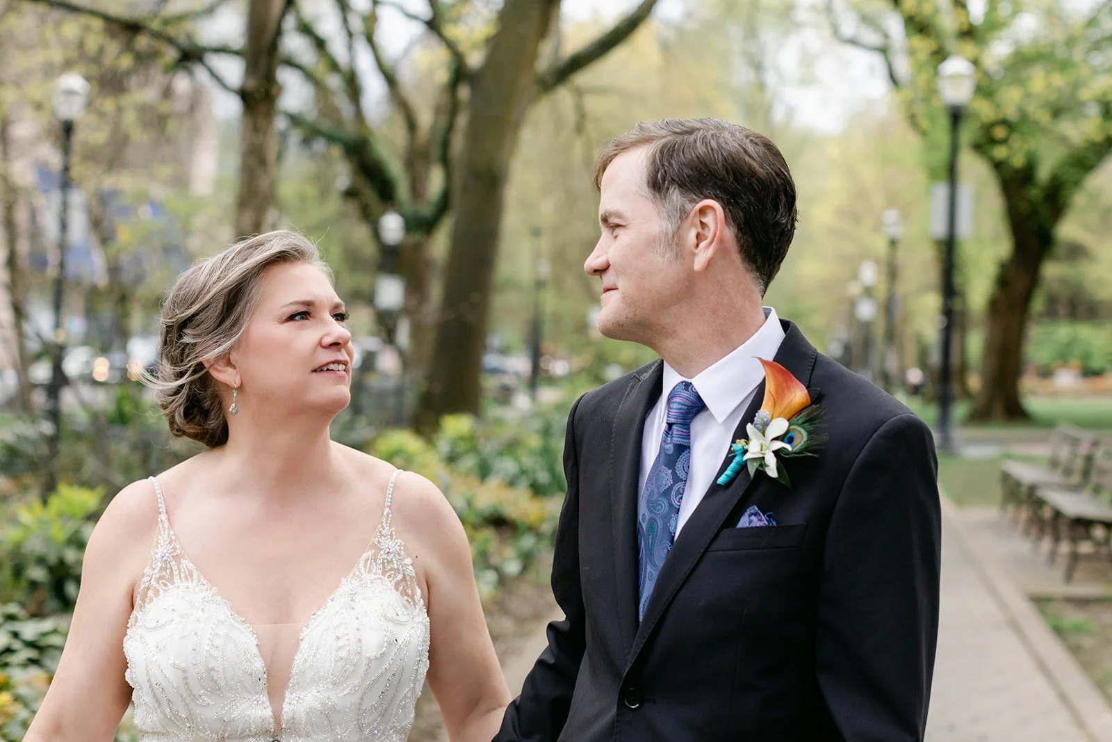 After the ceremony, we slipped out into the spring afternoon and walked to Portland's Park Blocks — that long green corridor of elm trees running through the heart of the city that has anchored Portland's cultural neighborhood for over a century. For Rachel and Ryan, it was personal. They had walked these same paths in the early days of their relationship, when everything was still new and uncertain. Coming back as a married couple, Ryan carrying her teal peacock heels in one hand and holding her hand with the other while she walked barefoot on the brick — that image says everything about who these two are.