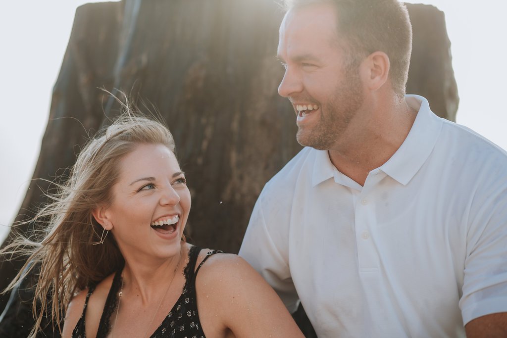 Brooke's reaction when David told her what was happening was its own little moment, and you can feel it in the frames that followed. They held hands and walked the shoreline. They kissed in the waves and got absolutely soaked doing it, not one bit of concern for the dress or the shorts. He lifted her out of the water, and she laughed with her whole body. At one point, a wave crashed behind them on the rocks and sent a spray of water right across the frame, and it is one of my favorite images from the whole session. A little bit of chaos, a lot of joy.