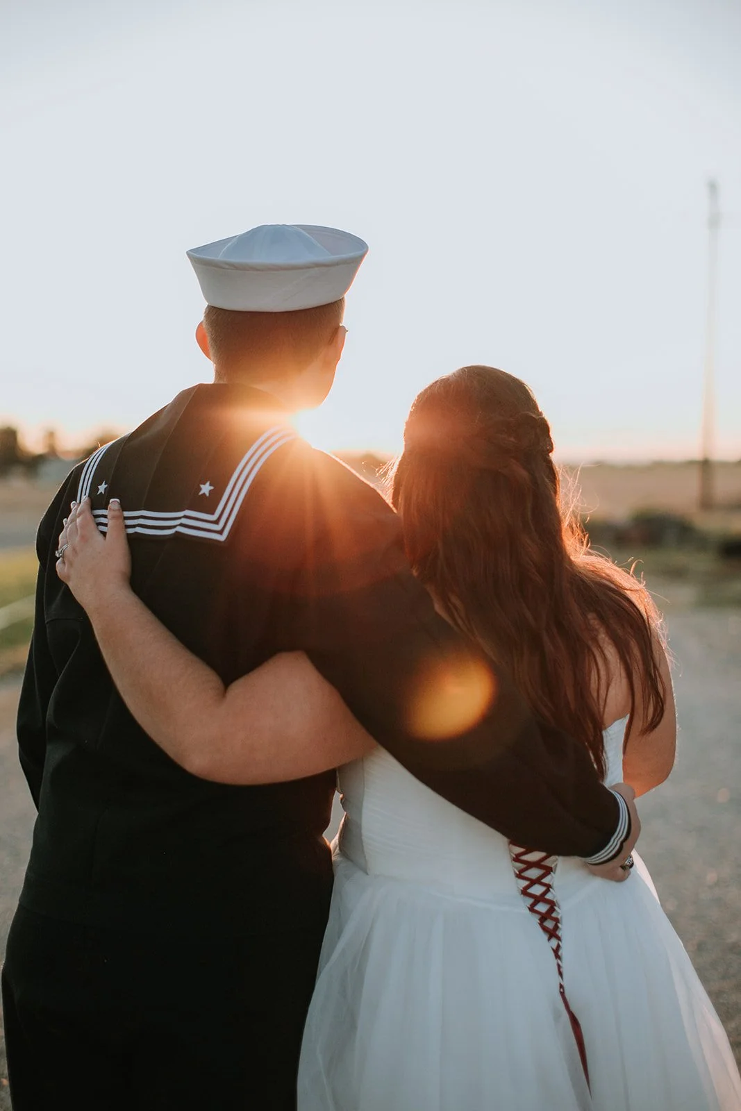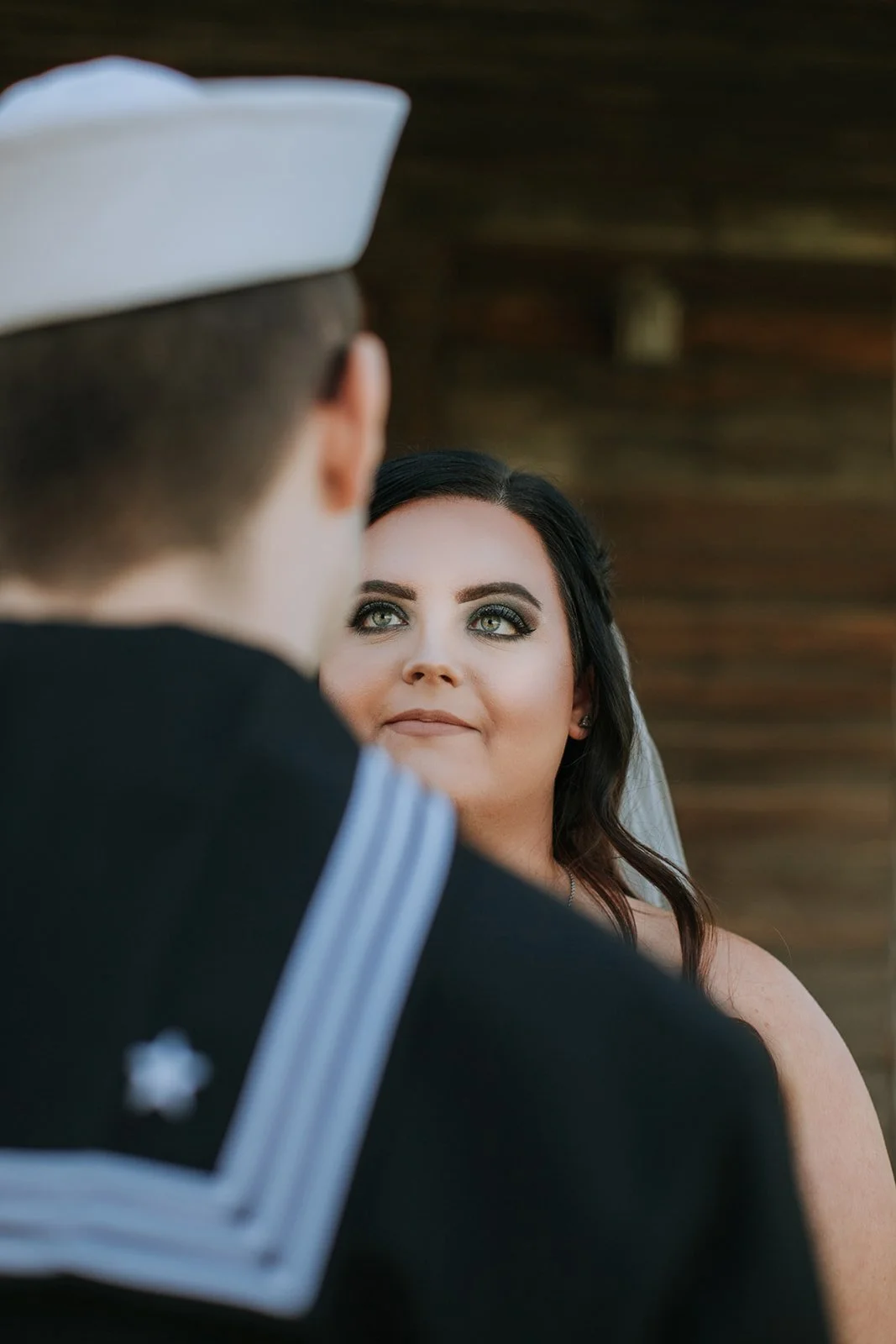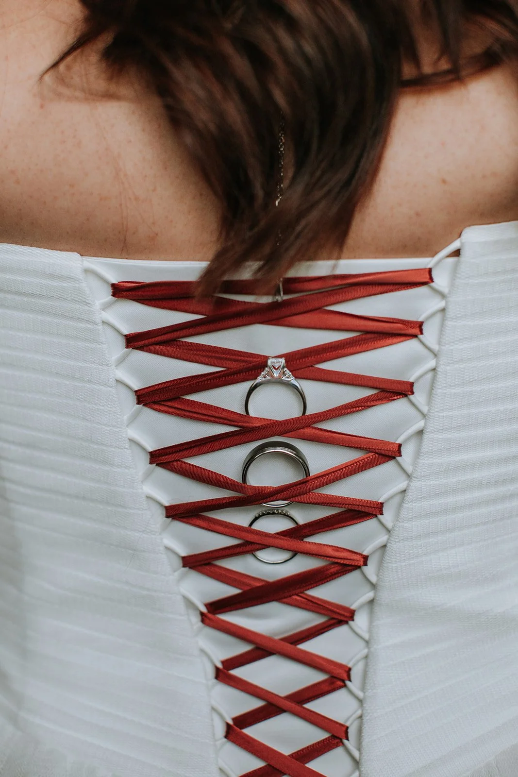 Codey wore his Navy dress blues. Chelsi wore a white strapless ballgown with a red ribbon corset back — and before the day even started, she told me the one shot she absolutely had to have. All three wedding rings woven into the ribbon lacing down her back. It was the image she'd been thinking about, and when we got it, it delivered. Every single time I look at it I think about how it was entirely her idea, already perfectly formed before I ever raised my camera. That's the best kind of detail shot — the one the bride shows up already knowing she wants.