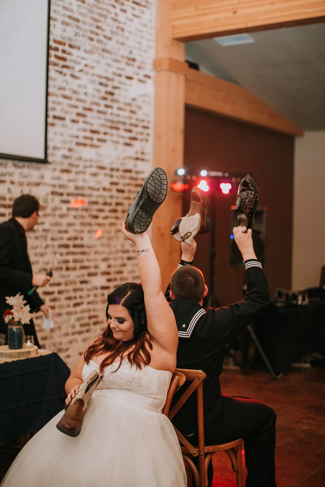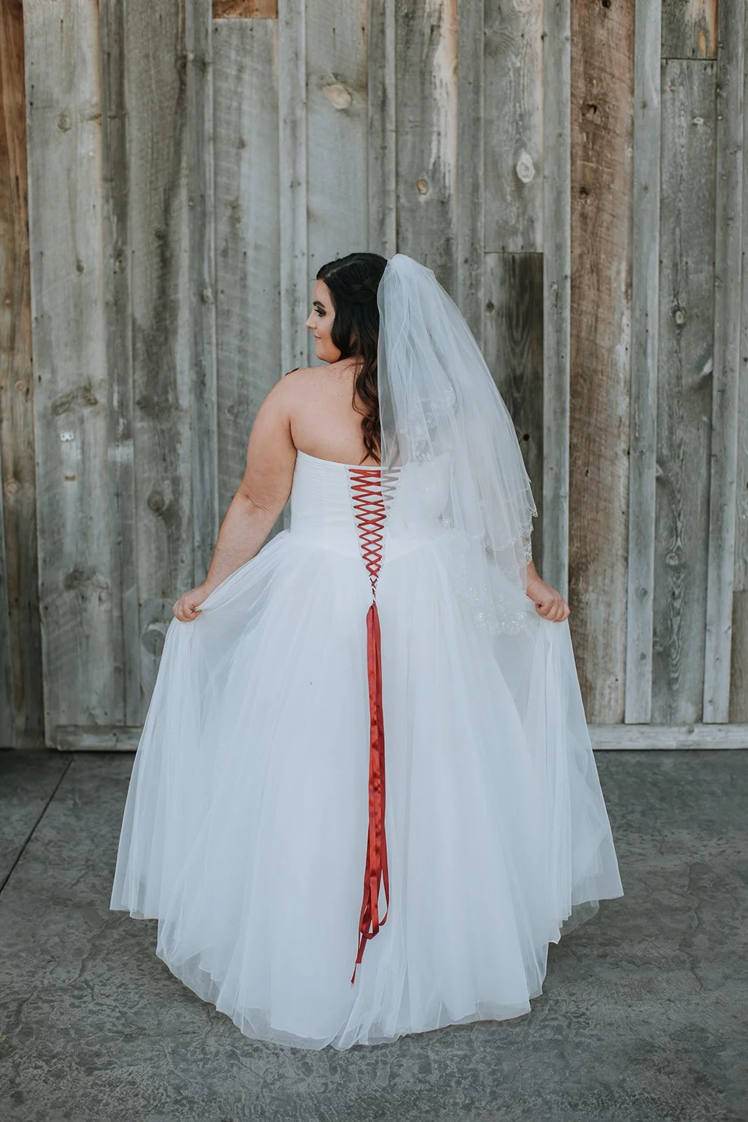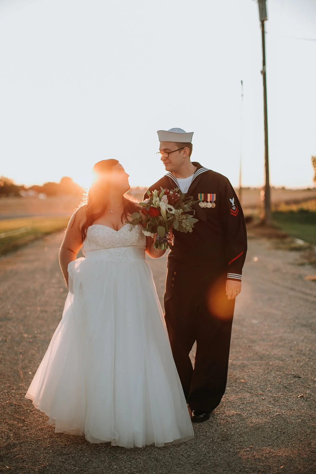 Codey wore his Navy dress blues. Chelsi wore a white strapless ballgown with a red ribbon corset back — and before the day even started, she told me the one shot she absolutely had to have. All three wedding rings woven into the ribbon lacing down her back. It was the image she'd been thinking about, and when we got it, it delivered. Every single time I look at it I think about how it was entirely her idea, already perfectly formed before I ever raised my camera. That's the best kind of detail shot — the one the bride shows up already knowing she wants.