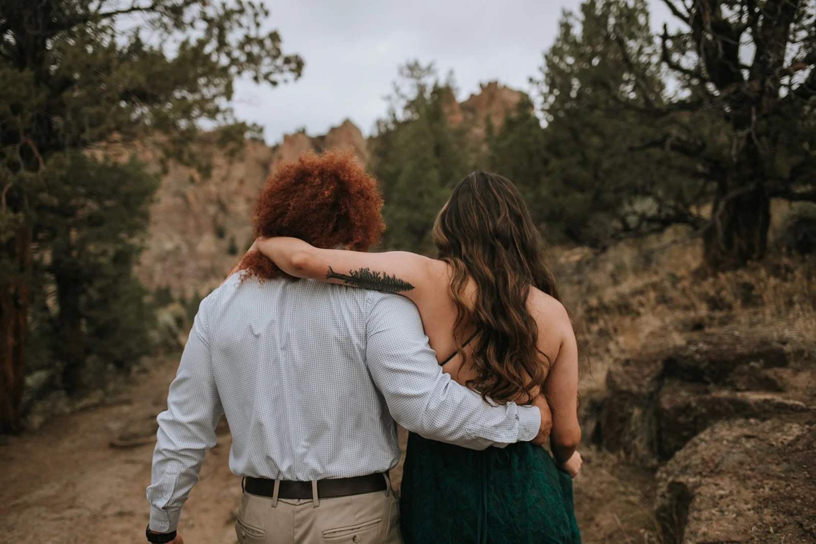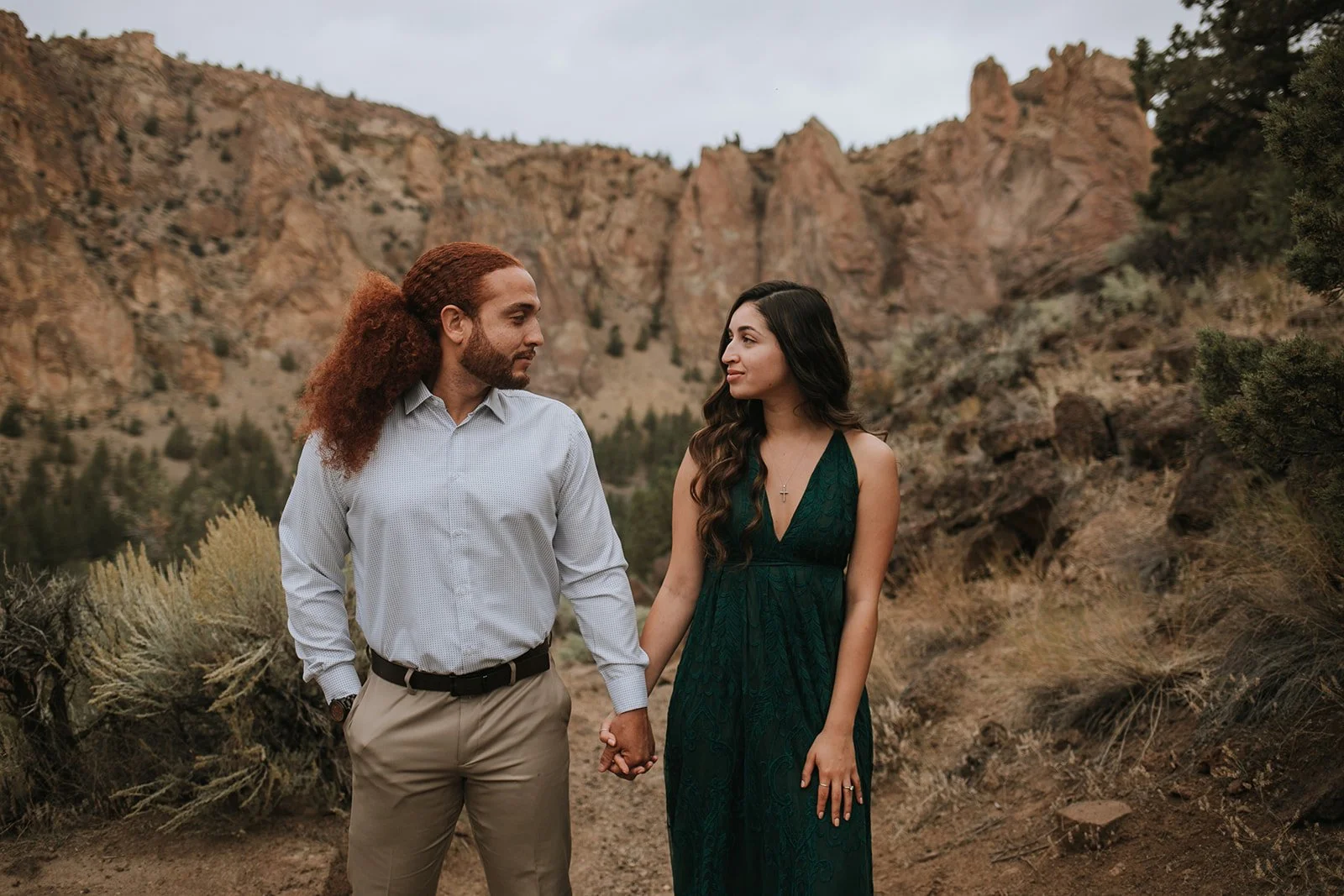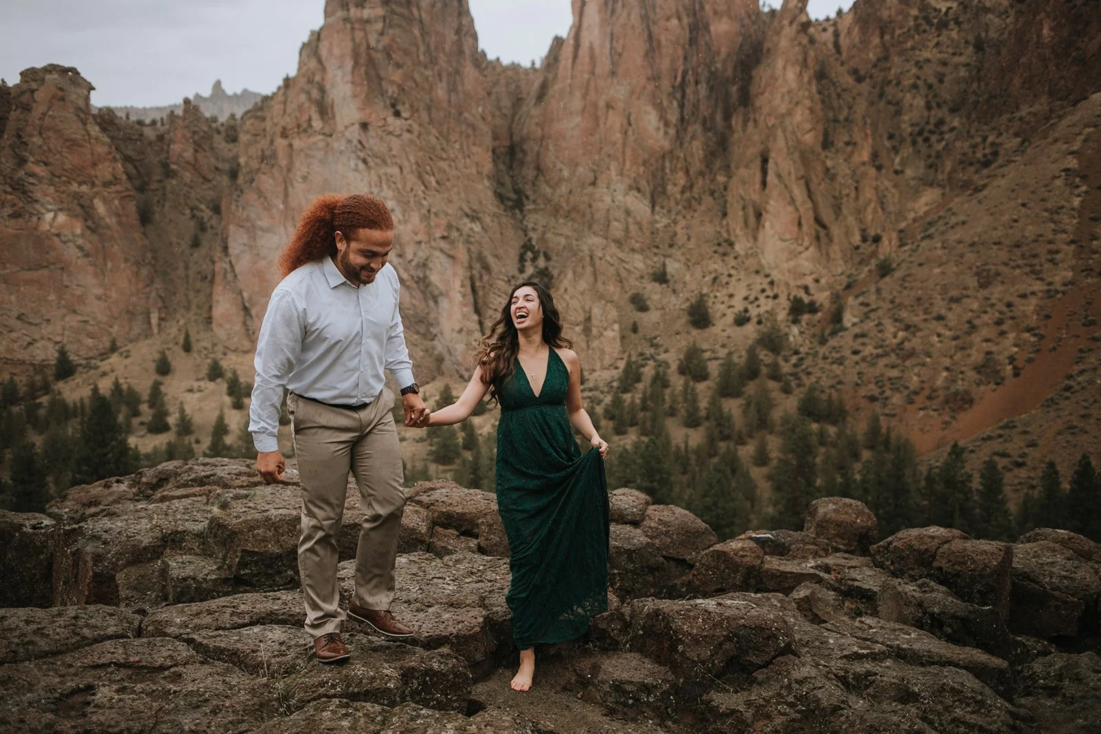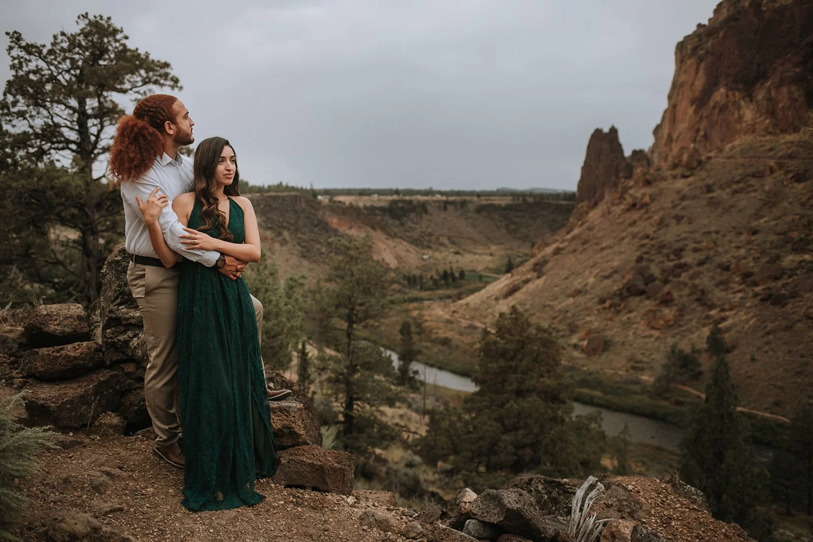They chose Smith Rock State Park for their engagement session, and I drove out to Bend with them on a day that had other plans. The desert sky was doing something dramatic, clouds moving in over the red rock spires and the canyon dropping away behind them in shades of rust and sage. The storm made everything moodier and more cinematic than any clear-sky day could have. Andrea in her emerald dress against those towering rock walls, Deion pulling her close on a weathered fence rail with the Crooked River far below: those frames came together in a way that still feels like a small miracle.