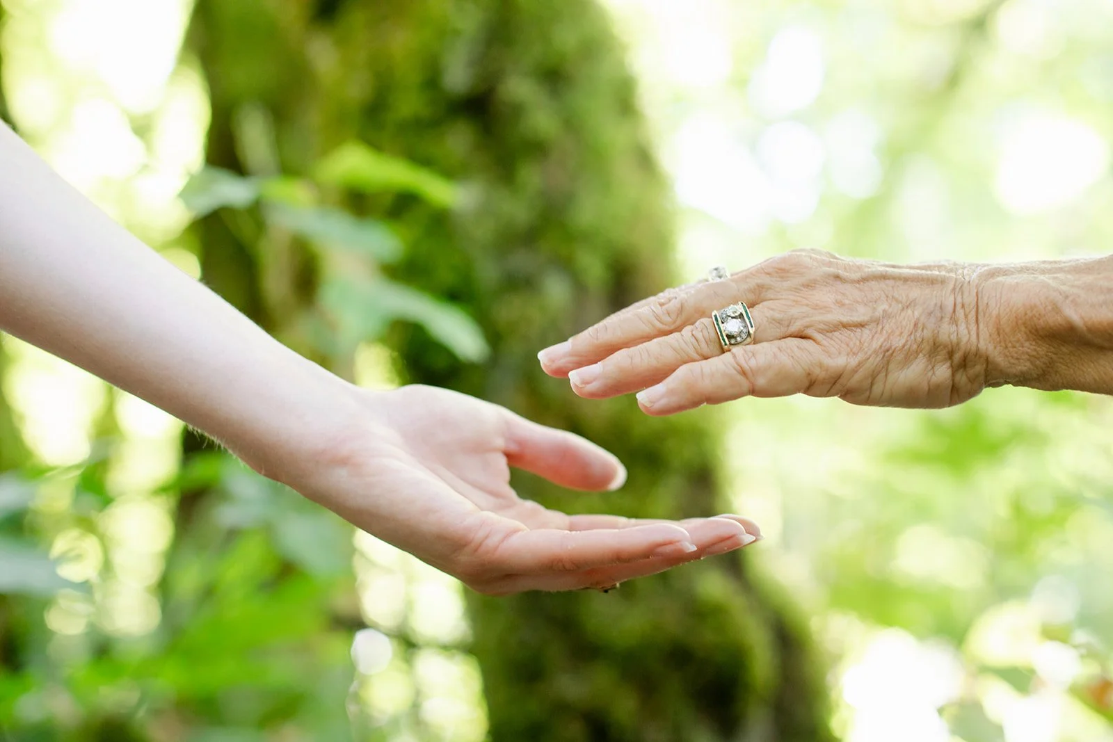 The detail shot of their hands — reaching toward each other against the mossy green backdrop — is one of my favorite photographs I've made in a long time. Two generations, right there in the frame. Everything a picture is supposed to hold.