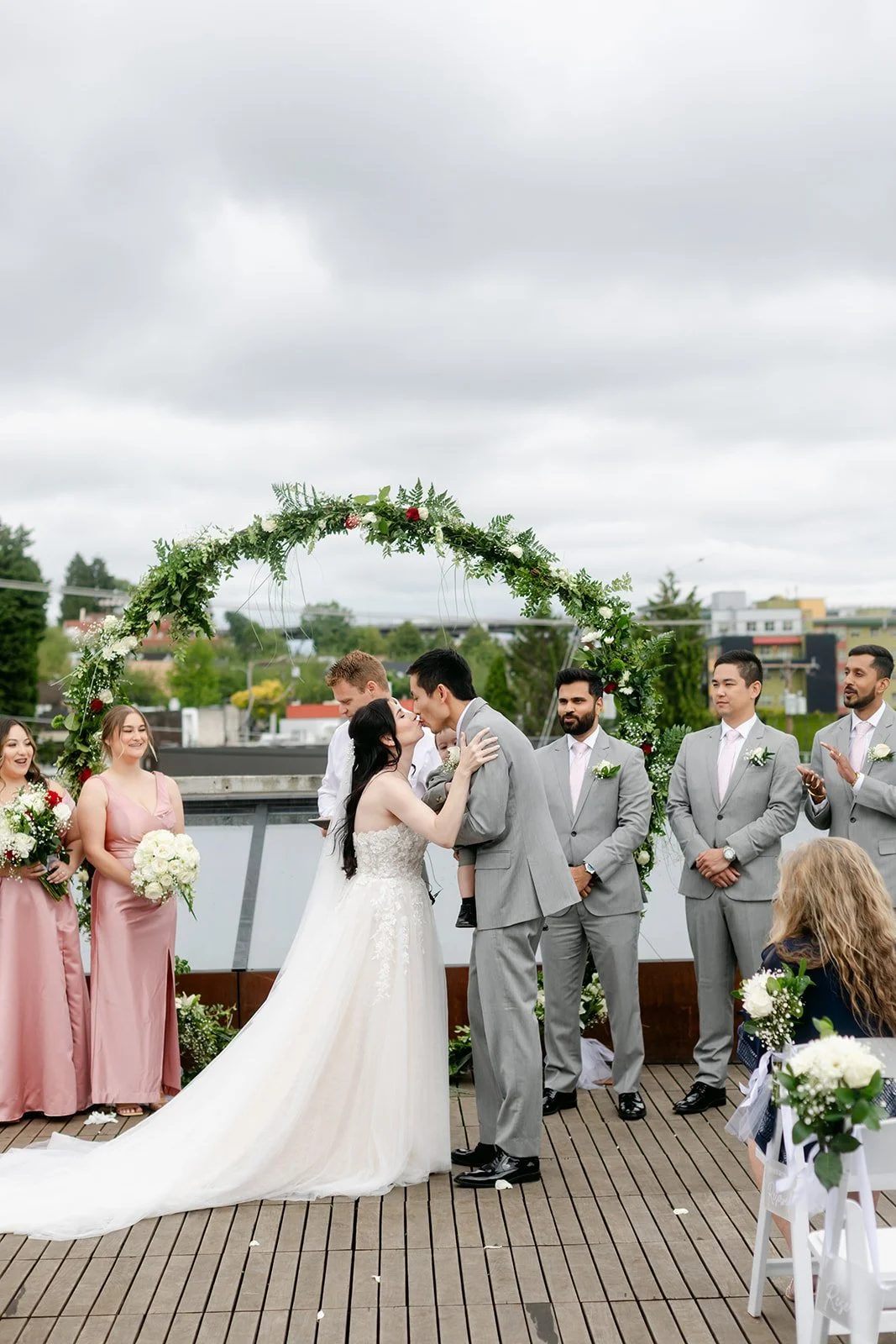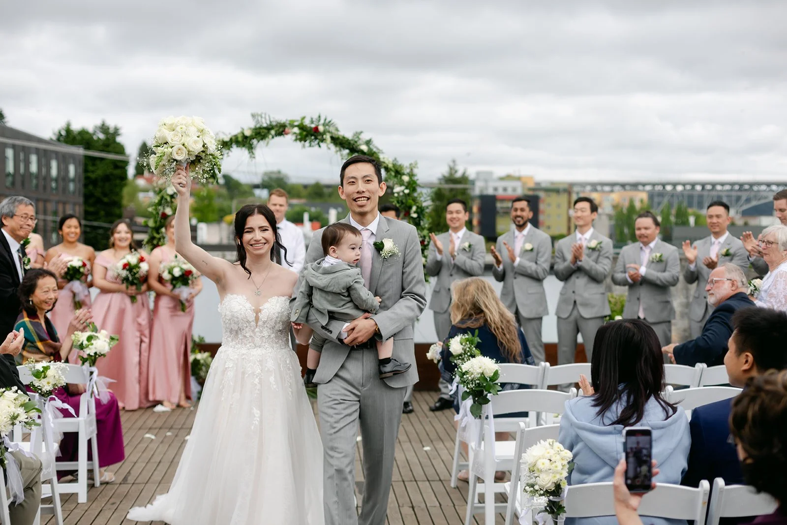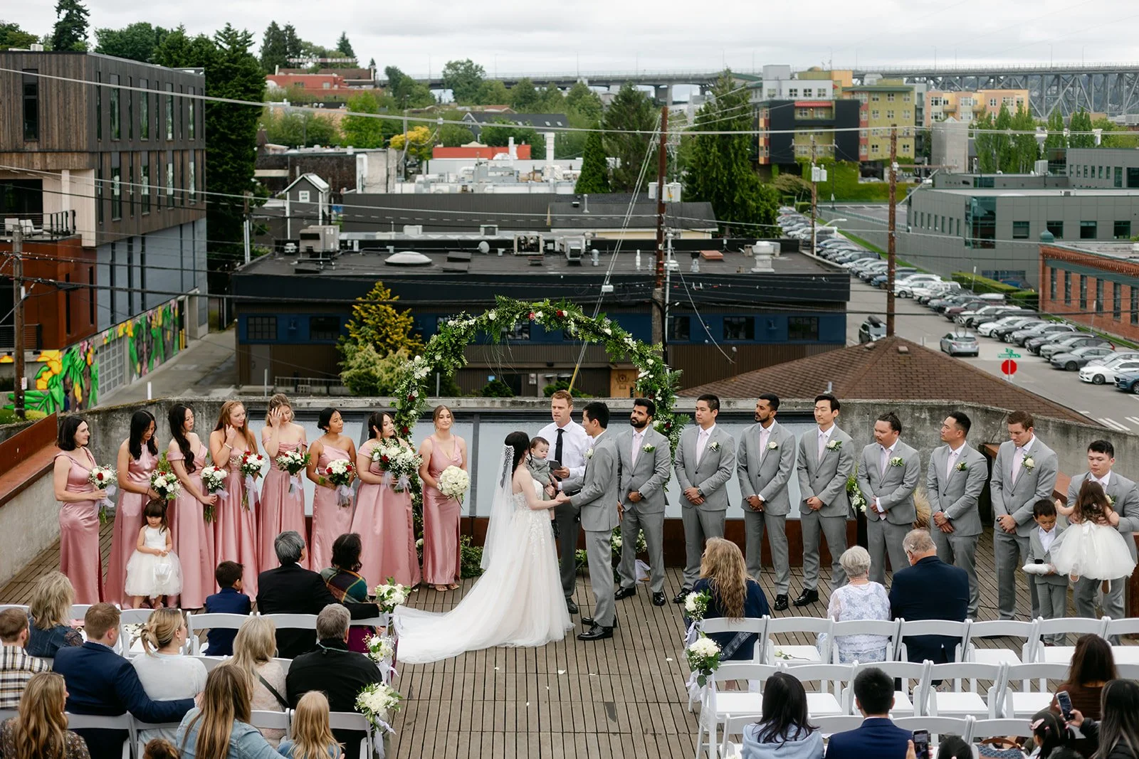 The ceremony happened on the rooftop, which is the only correct way to get married at the Fremont Foundry if the Seattle sky is cooperating — and on this day it was. Open air, city views stretching out in every direction, the kind of backdrop that makes you feel like the whole city is witnessing something. Kristen was stunning. Brian looked like a man who knew exactly how lucky he was. The whole thing felt elevated and intimate at the same time, which is a balance that's harder to achieve than it looks.