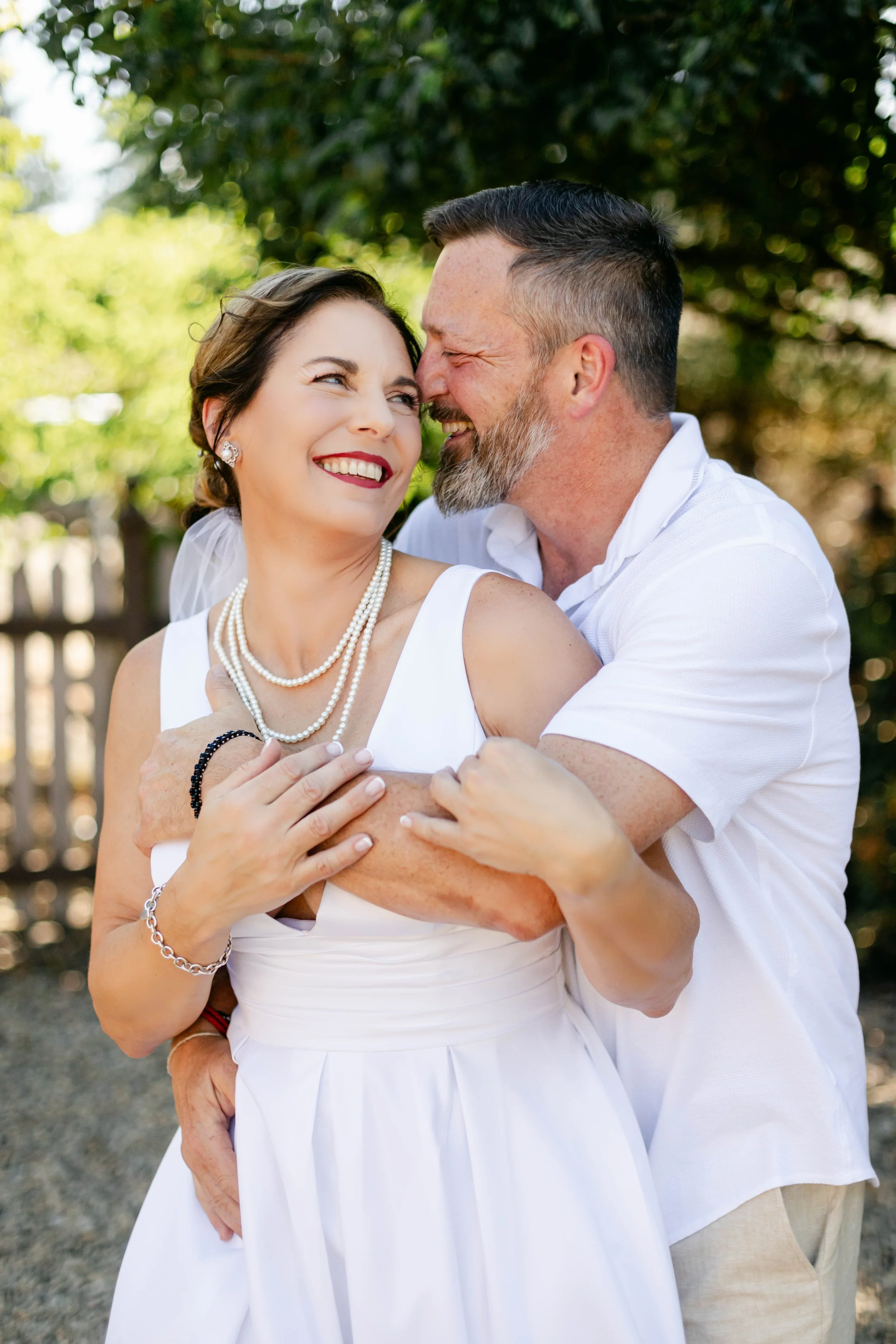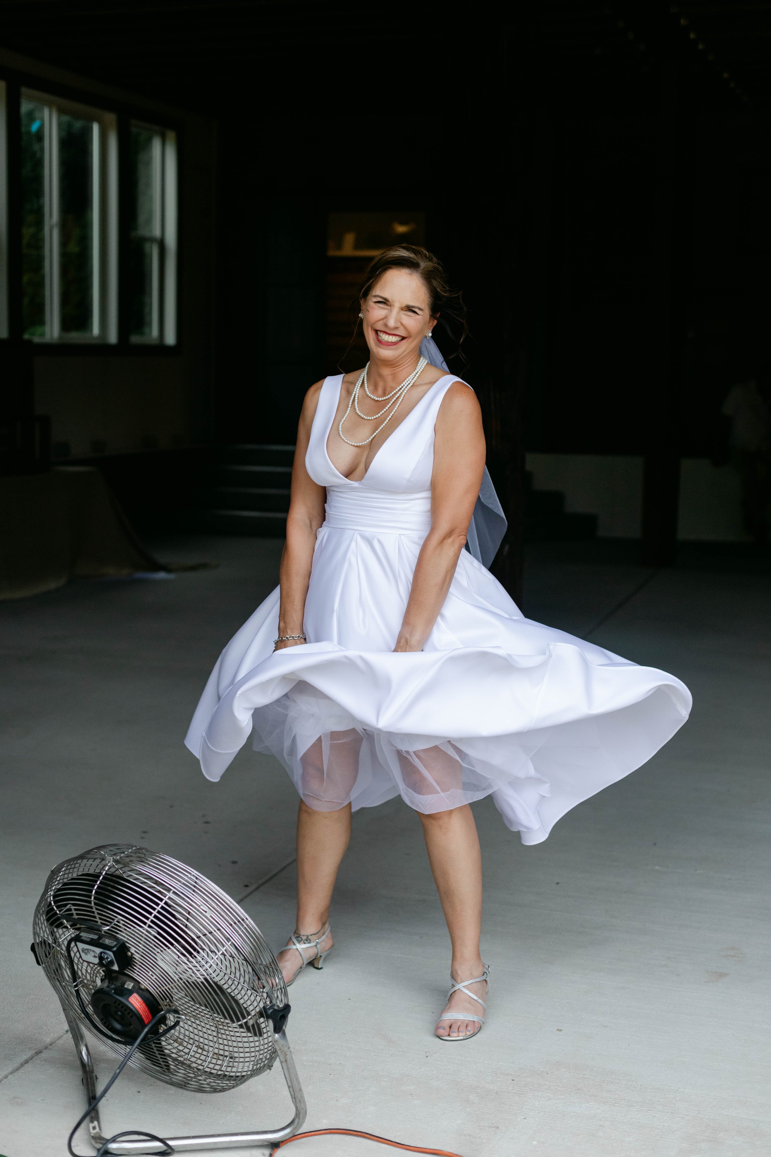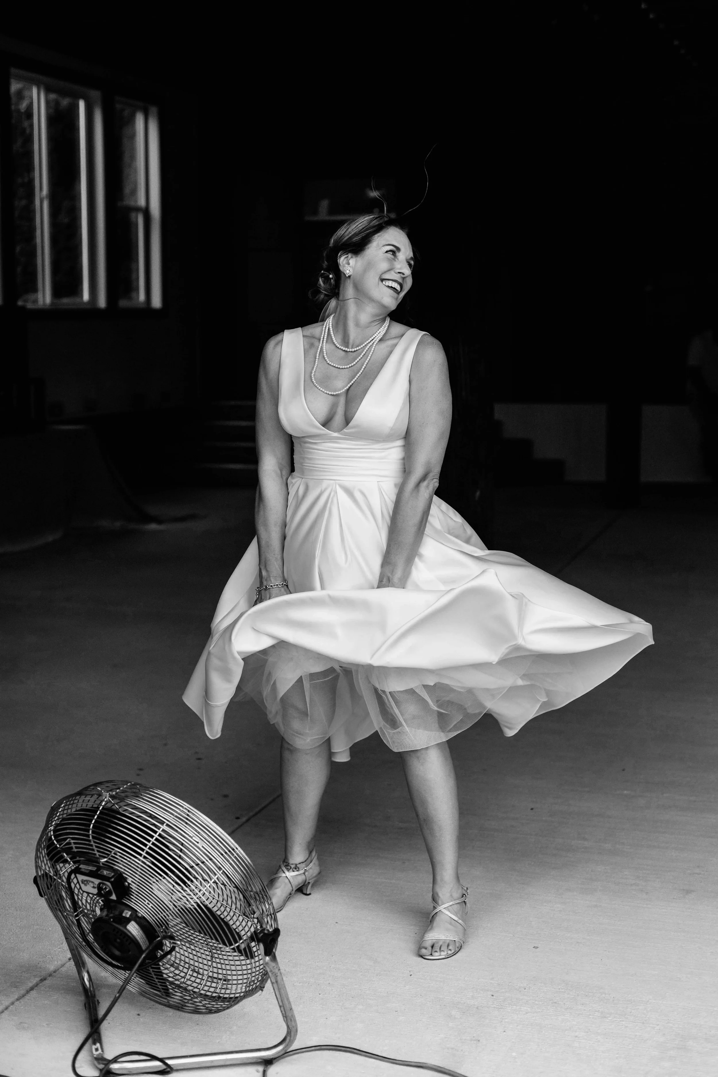 Before the ceremony, Niki had a moment I will never stop thinking about. Someone on the team had a big industrial fan. We pointed it at her. She planted her feet, grabbed her white dress as it billowed up around her, threw her head back, and laughed — red lip, pearl necklace, full Marilyn Monroe energy. That photo might be one of my favorites I've ever taken. It is completely, unmistakably her.