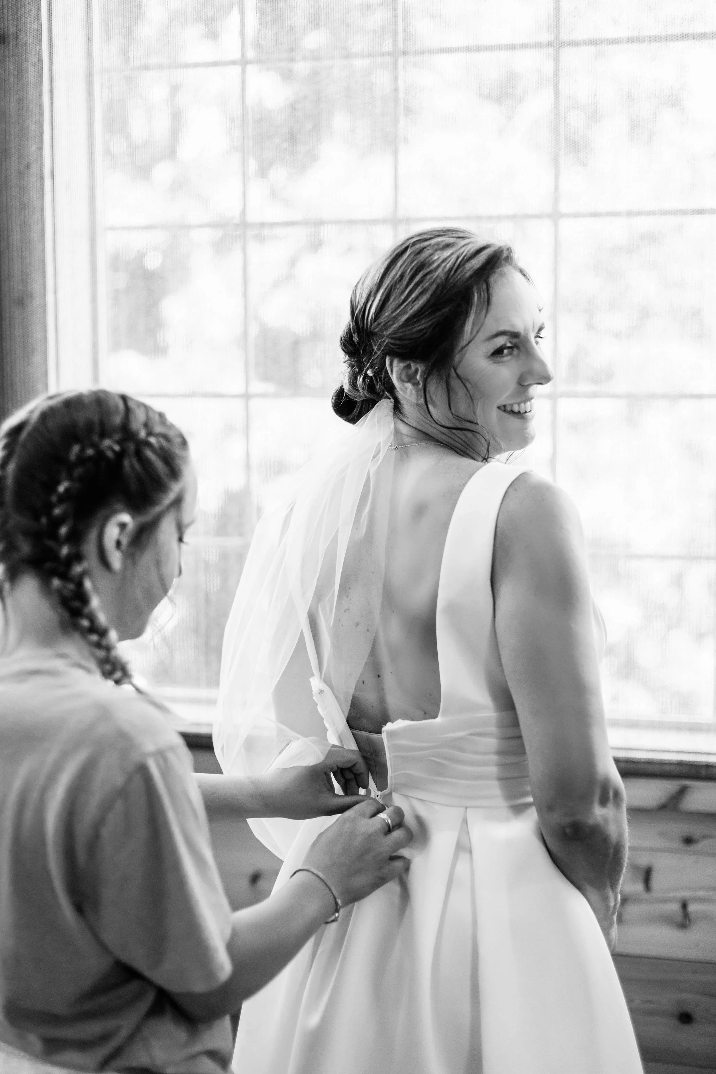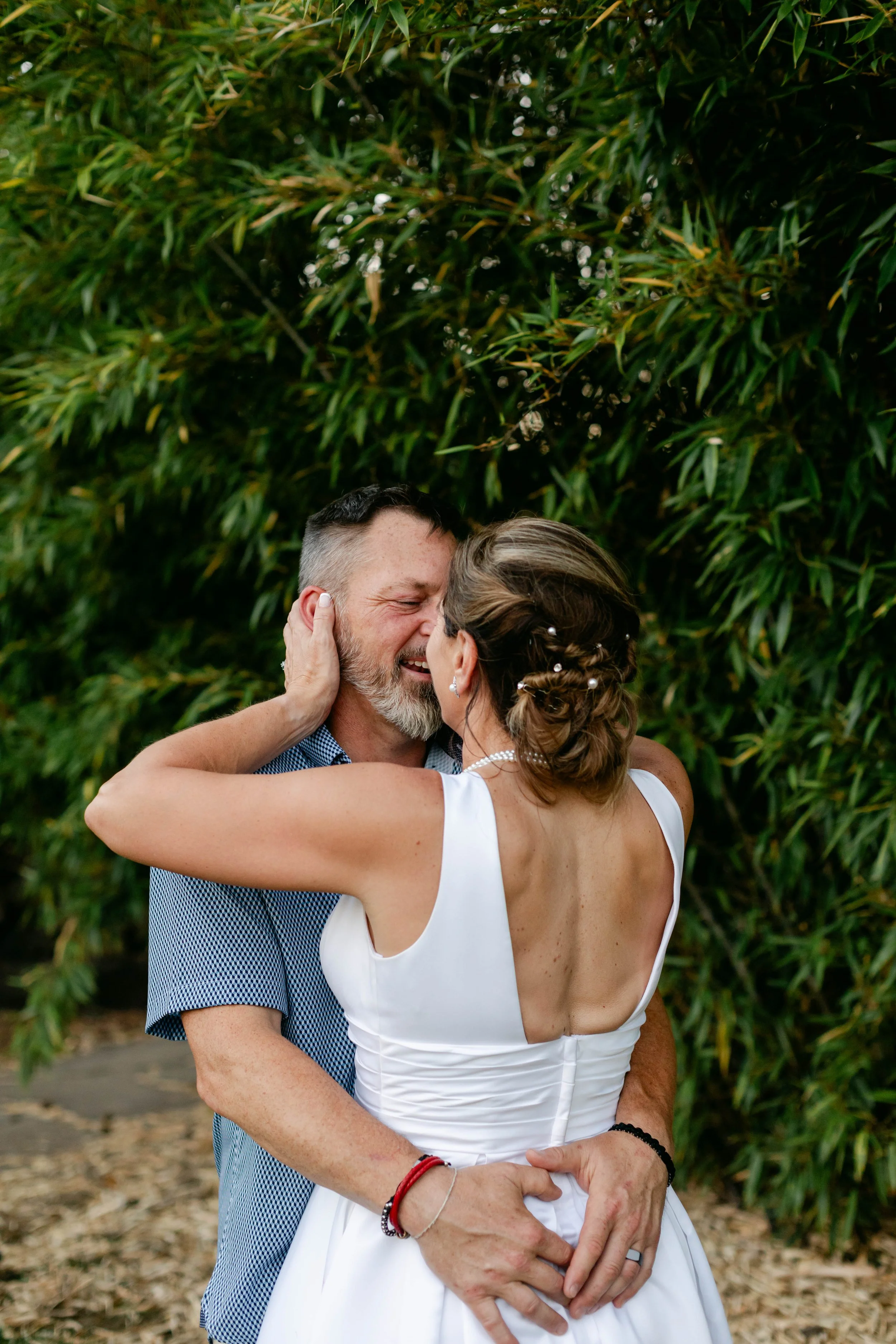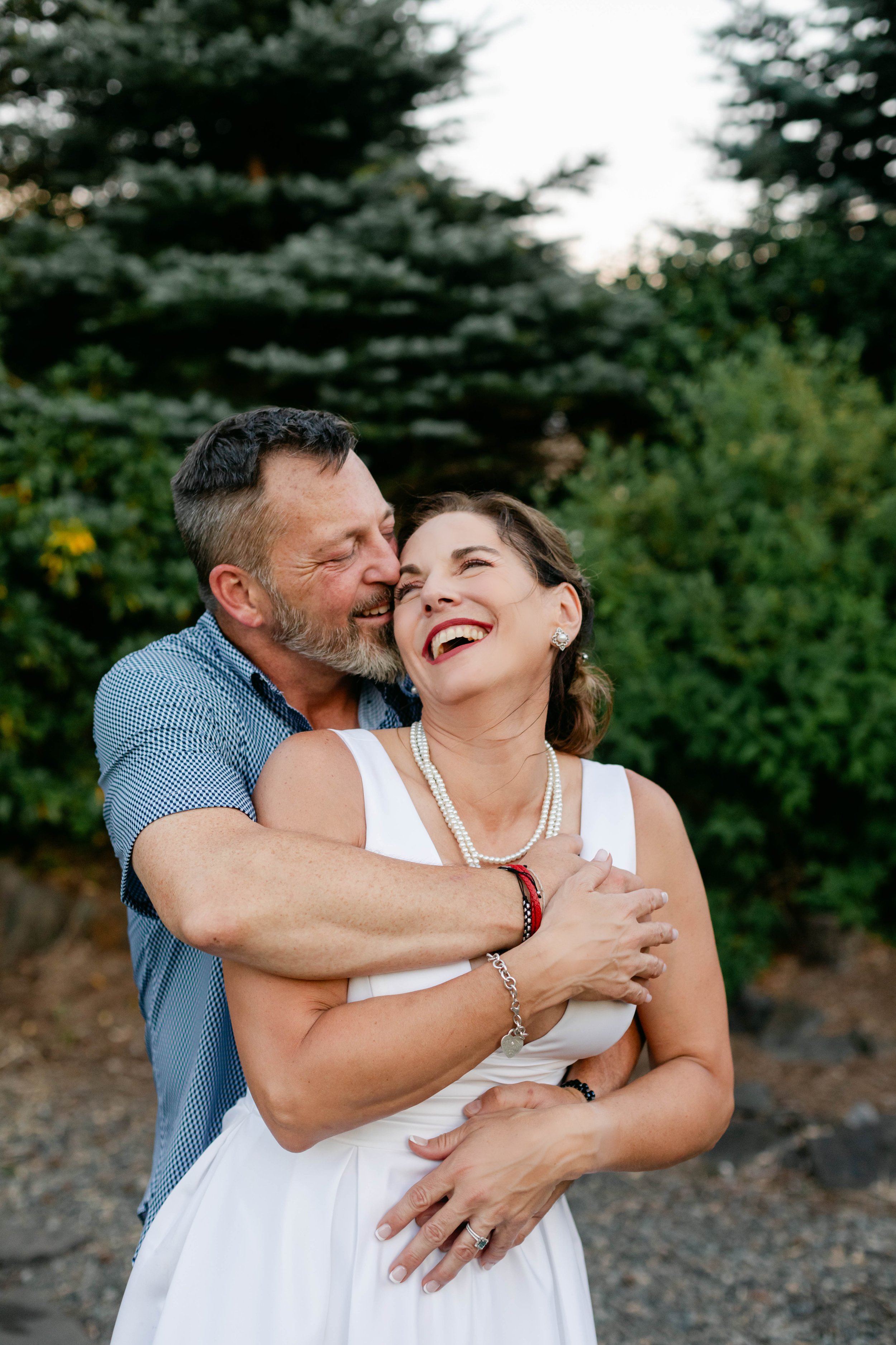 Before the ceremony, Niki had a moment I will never stop thinking about. Someone on the team had a big industrial fan. We pointed it at her. She planted her feet, grabbed her white dress as it billowed up around her, threw her head back, and laughed — red lip, pearl necklace, full Marilyn Monroe energy. That photo might be one of my favorites I've ever taken. It is completely, unmistakably her.