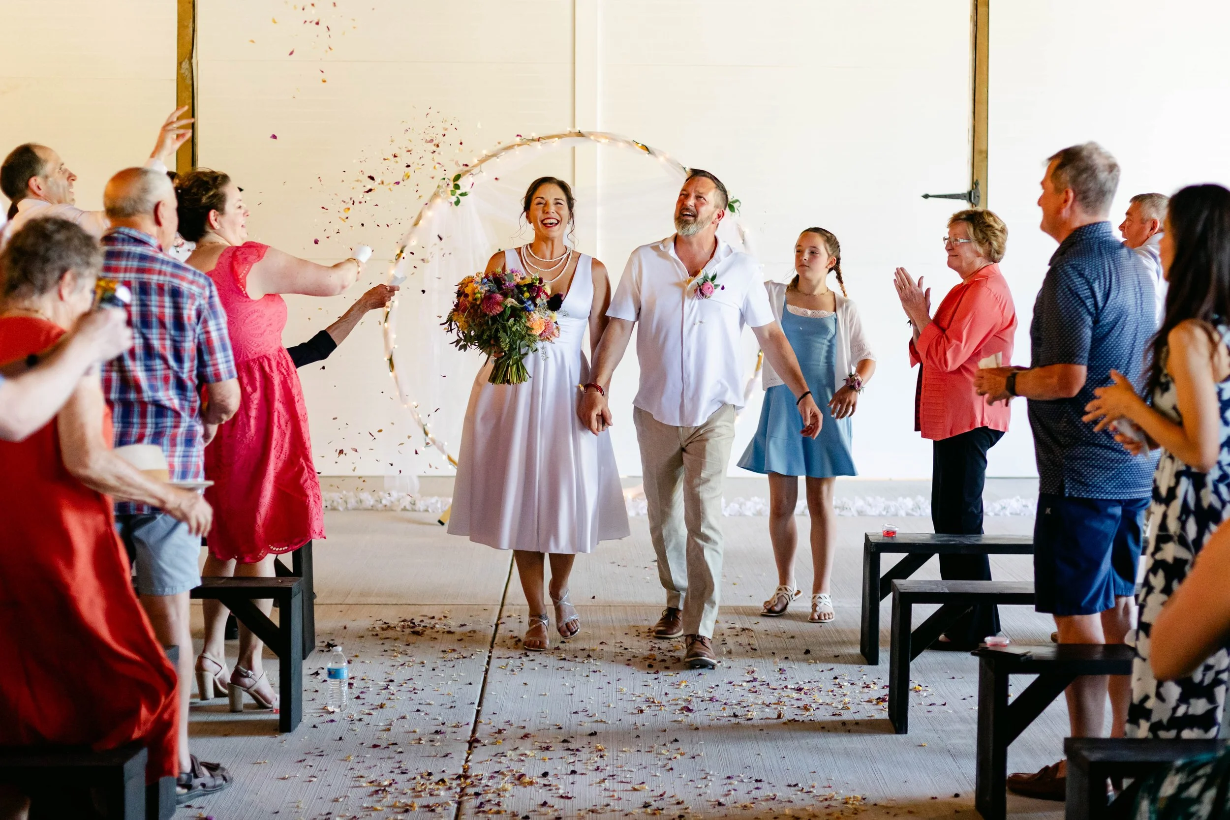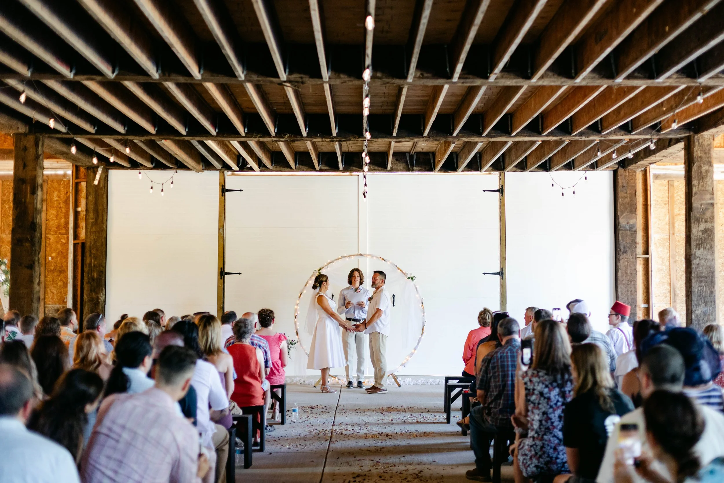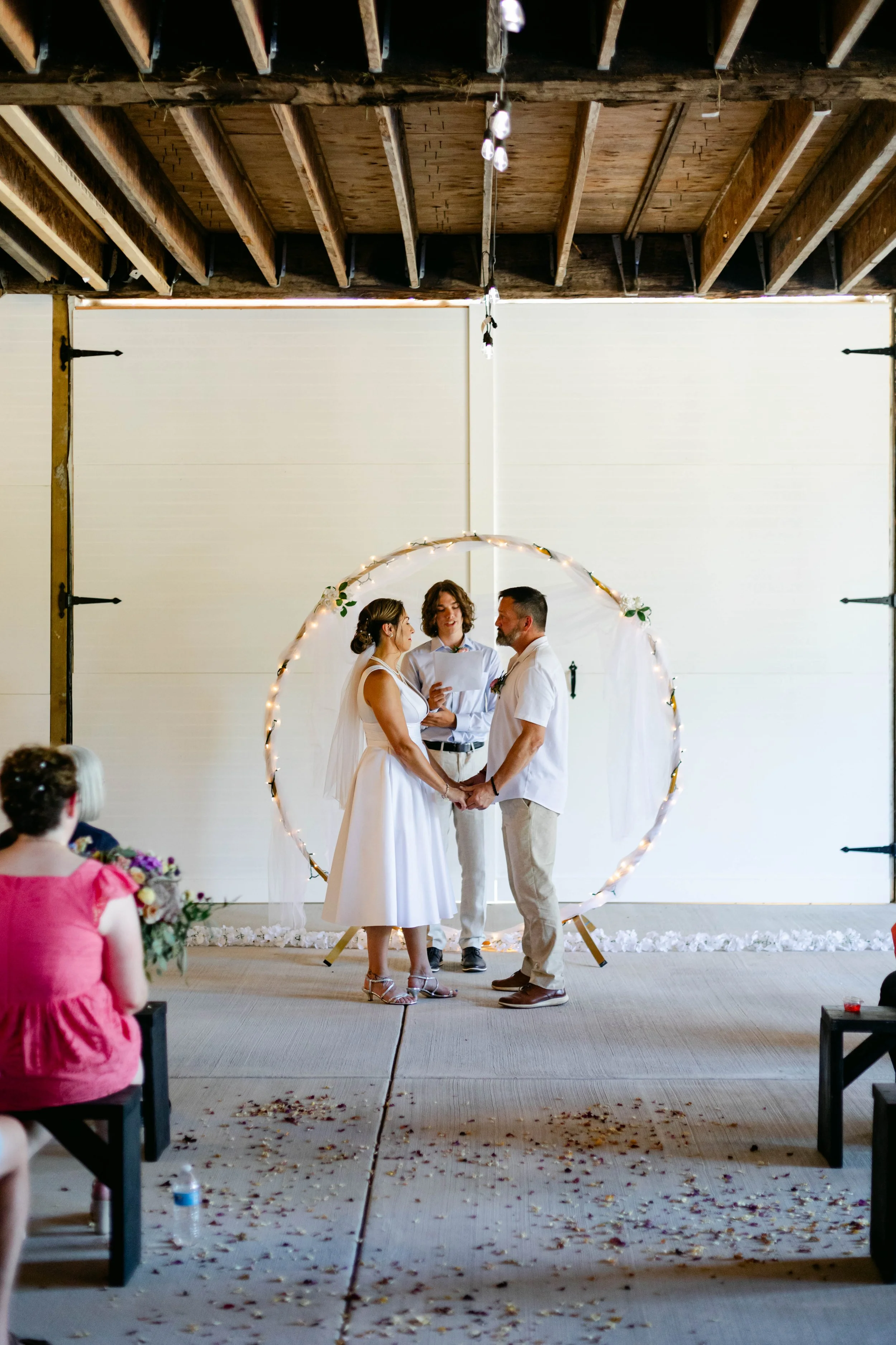 Rusty Barn Estates was the exact right venue for these two. Raw wood beams, string lights strung across the ceiling, big barn doors thrown open to the summer light — it felt warm and lived-in and completely unpretentious, which is exactly who Niki and Shaun are. They stood beneath a circular floral arch hung with fairy lights and said their vows while their people packed the benches on either side. Flower petals covered the aisle floor. The whole scene looked like something out of a dream — the kind of dream where everything is golden and loud and full of laughter.