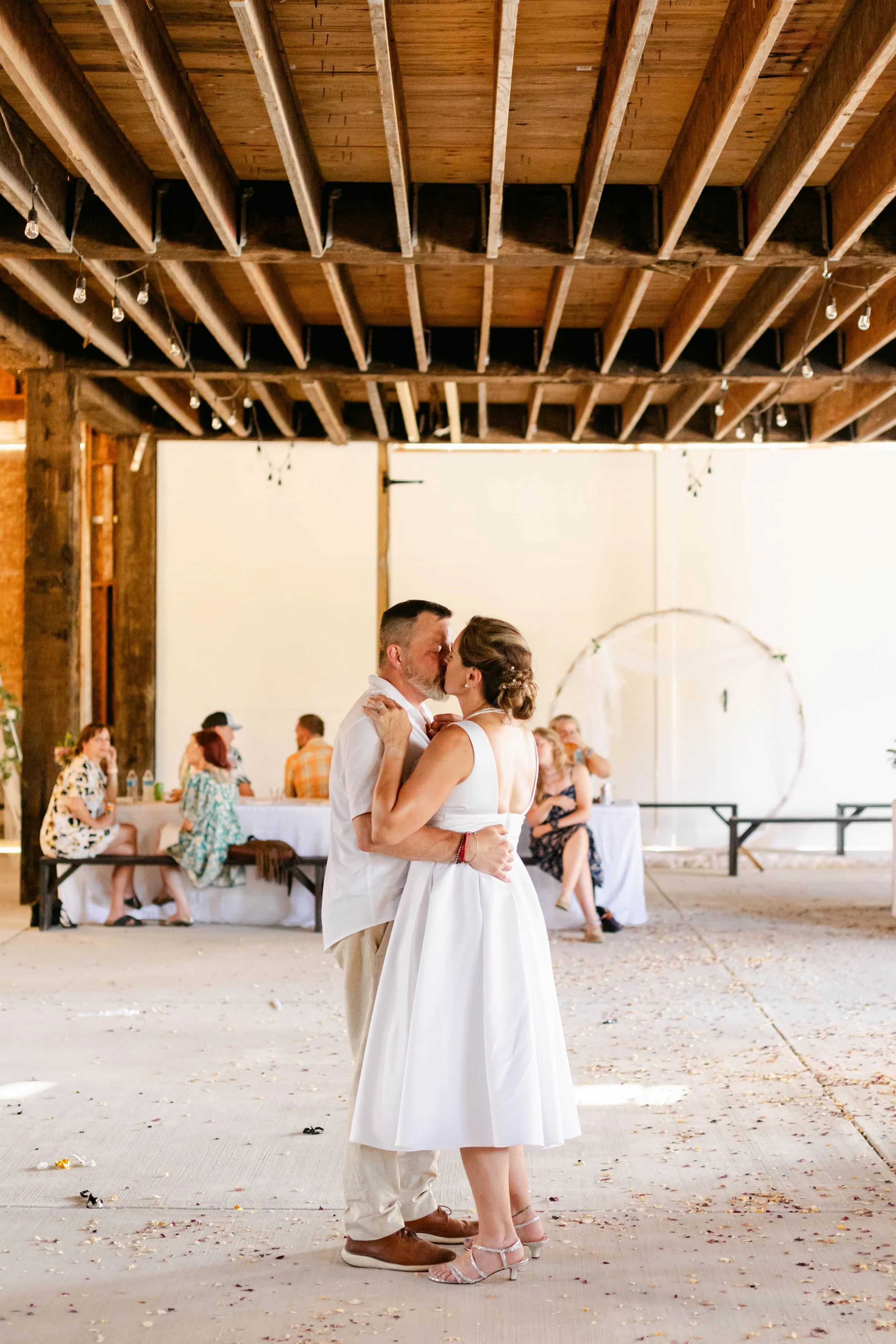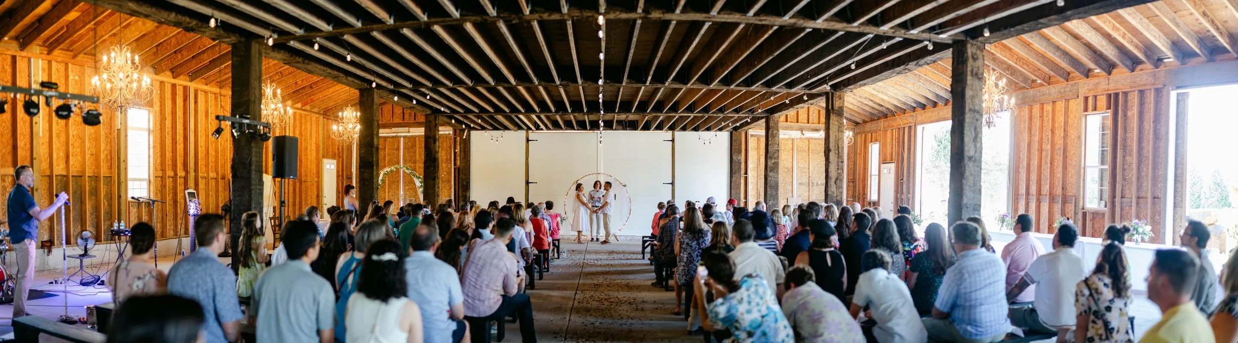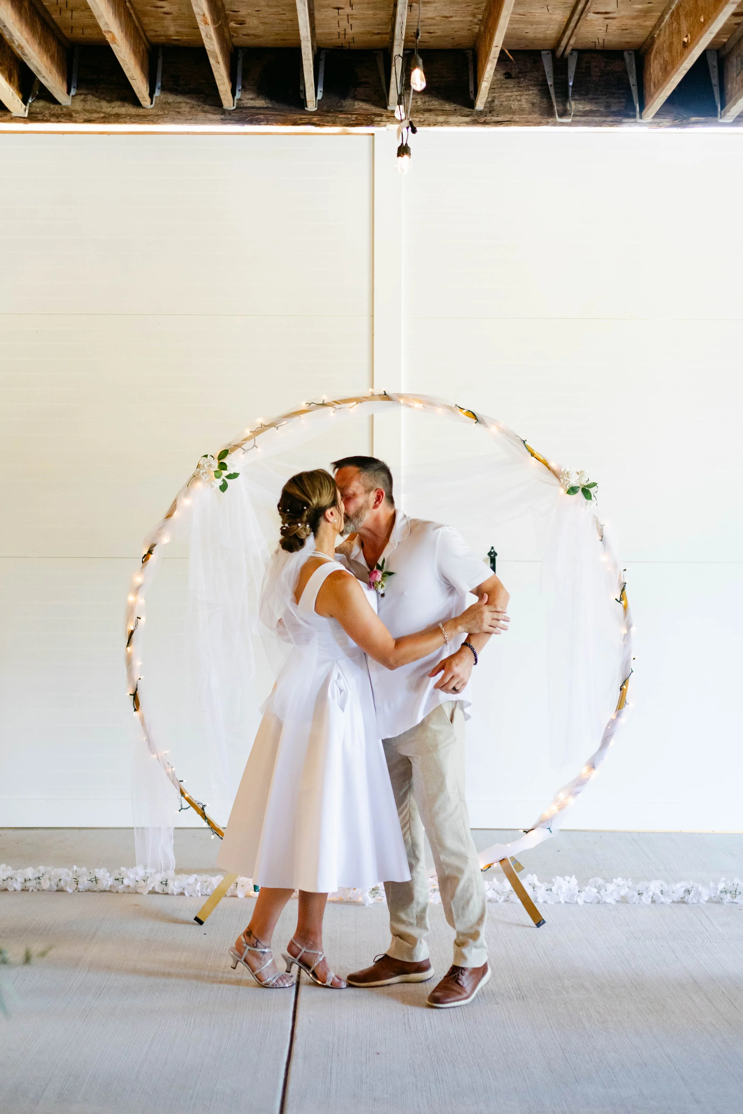 Rusty Barn Estates was the exact right venue for these two. Raw wood beams, string lights strung across the ceiling, big barn doors thrown open to the summer light — it felt warm and lived-in and completely unpretentious, which is exactly who Niki and Shaun are. They stood beneath a circular floral arch hung with fairy lights and said their vows while their people packed the benches on either side. Flower petals covered the aisle floor. The whole scene looked like something out of a dream — the kind of dream where everything is golden and loud and full of laughter.