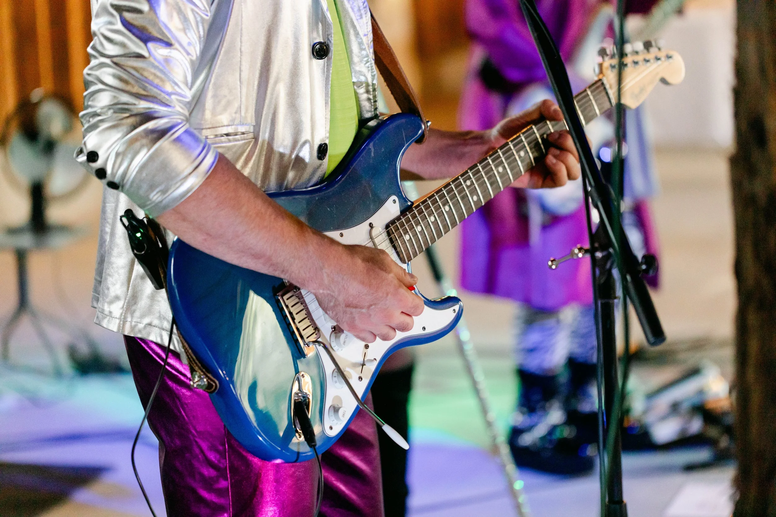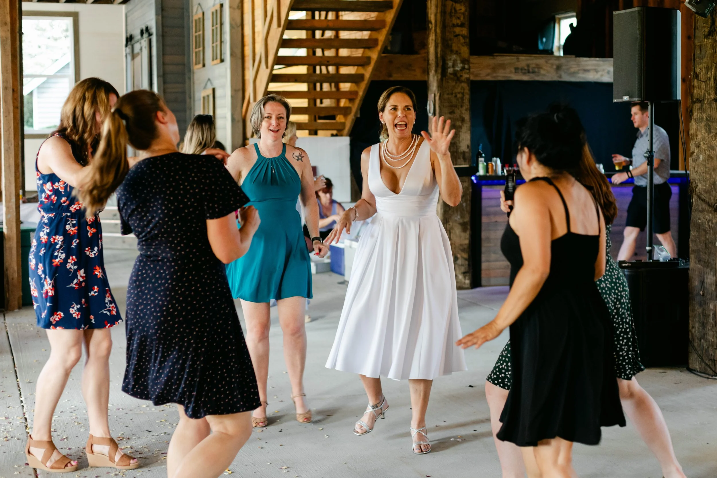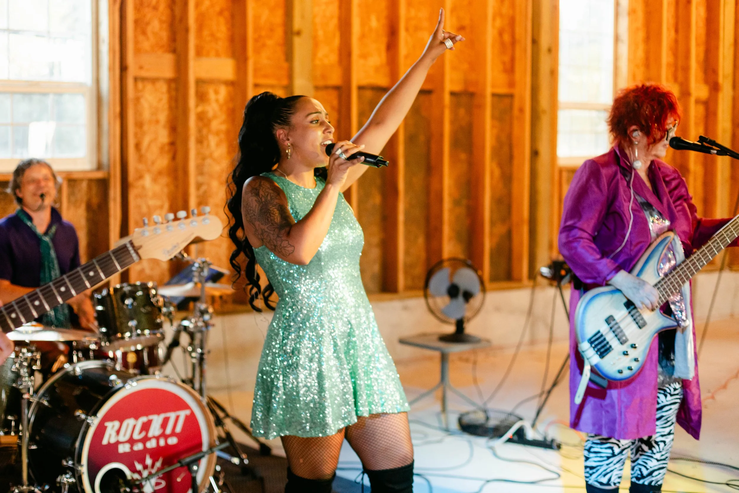 The reception brought in Rockit Radio, a live band that turned that barn into a full concert. Sequins, electric guitars, a bass player in zebra print — they came to work, and the dance floor never stood a chance. Niki danced. Shaun grinned. The kids danced. The grandparents danced. That is how you know a band is doing their job.