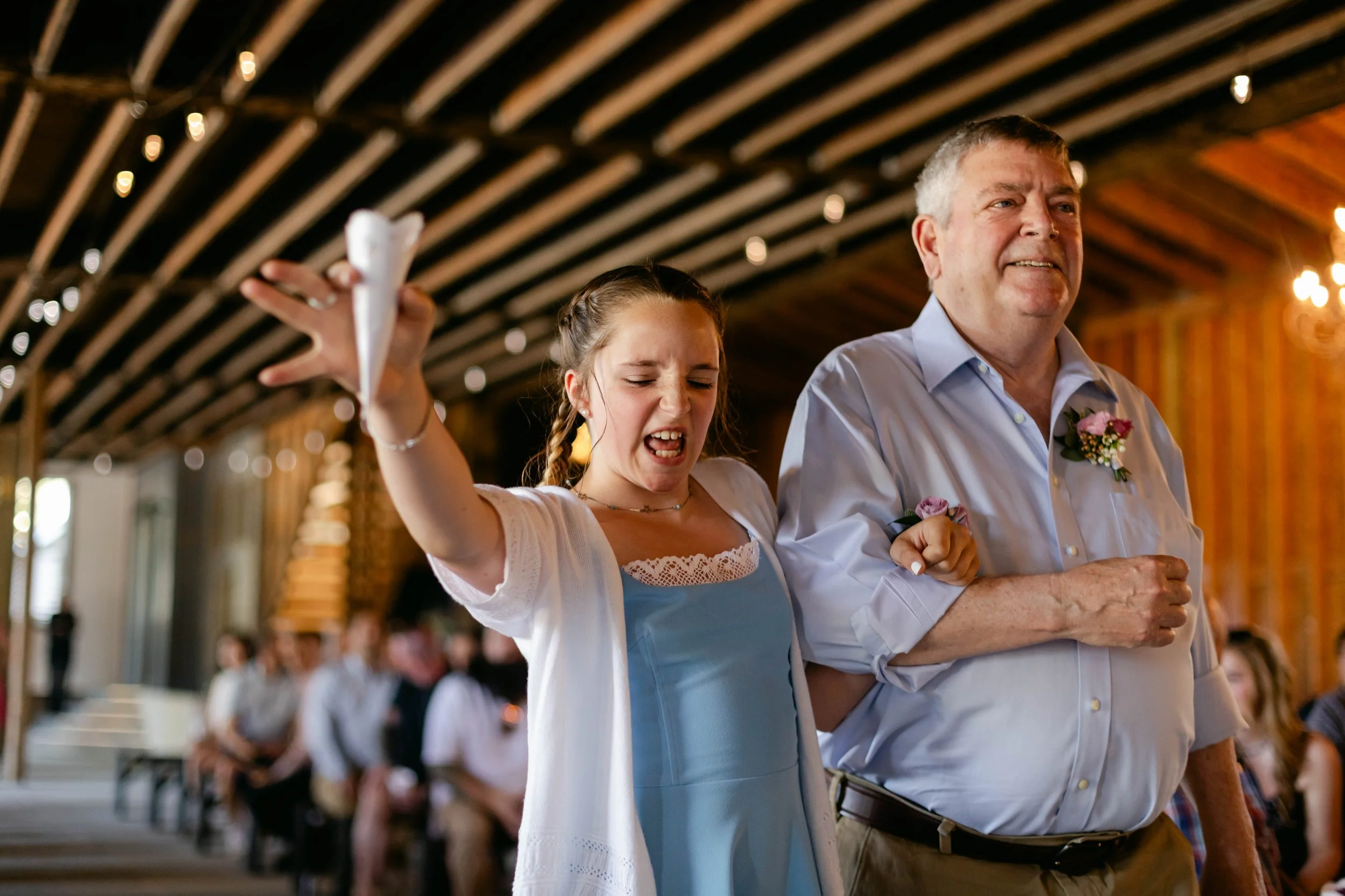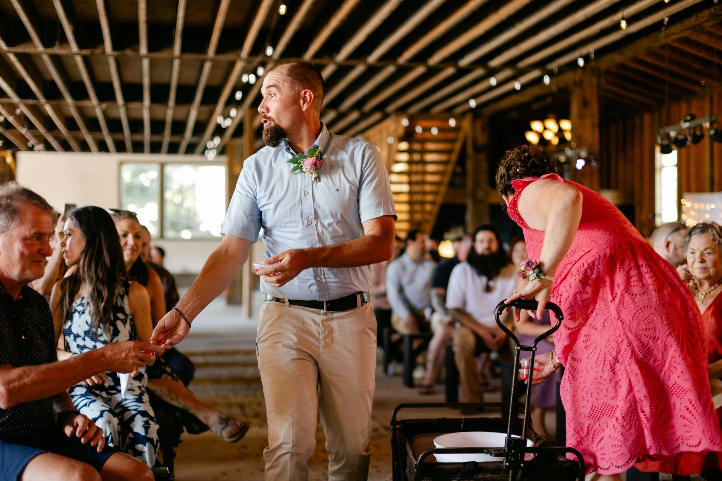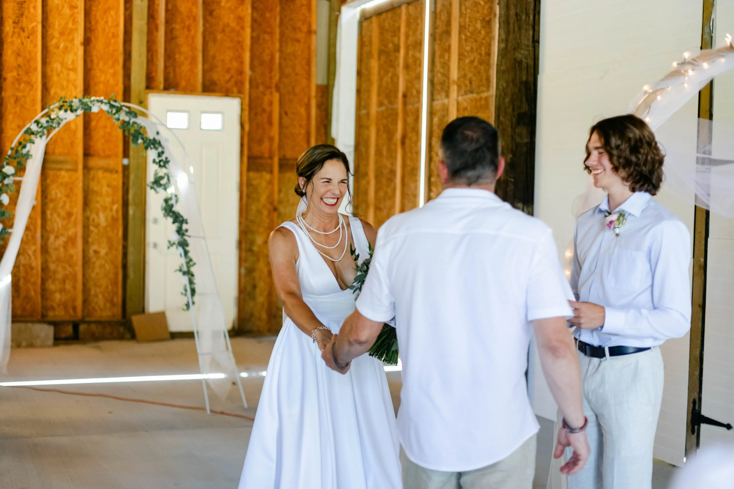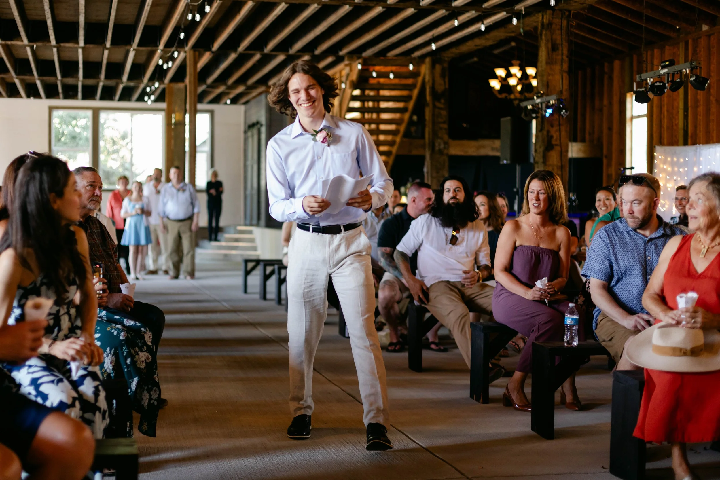 I've known Niki since I was a kid running around a soccer field. She was always there — on the sidelines, cheering, present. I even babysat her son JP when he was in diapers. So when she asked me to photograph her wedding, I said yes before she finished the sentence. What I did not fully prepare for was standing in a gorgeous rustic barn watching that same tiny baby — now a full-grown teenager — stand up front and officiate his mom's wedding. JP pulled it off with total composure and a confidence that made the whole room lean in. Then, because JP clearly has a flair for the dramatic and an excellent sense of timing, he changed into a Hawaiian shirt for the reception. Perfect. Iconic. Correct.