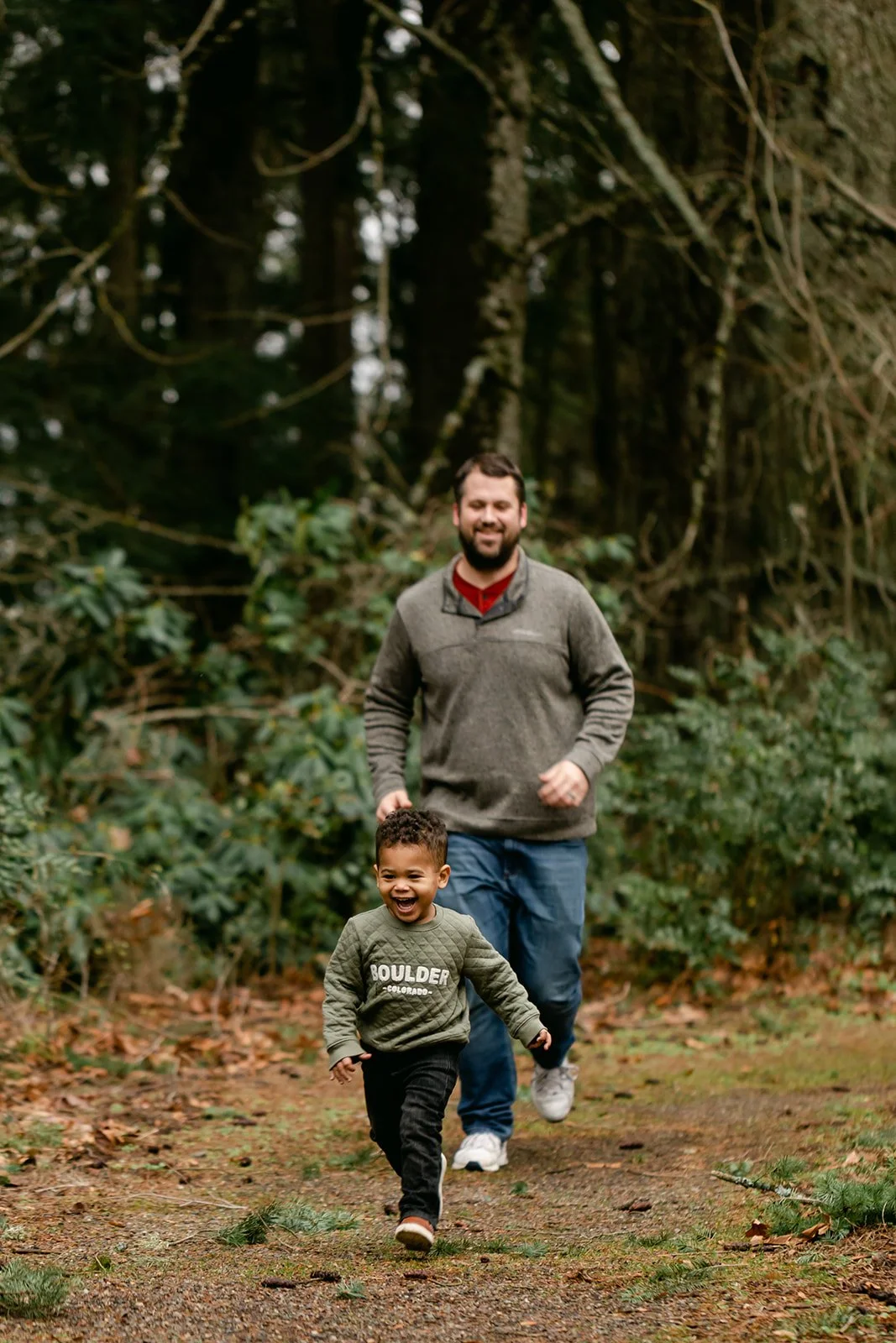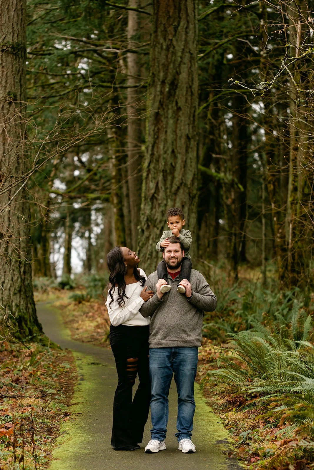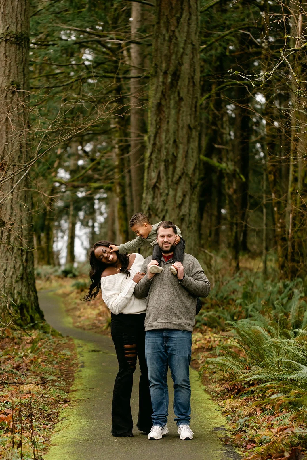 Now there's E — a toddler with a big laugh and very specific ideas about which direction we should be walking. Scouters Mountain in Happy Valley was the right setting for it: a volcanic butte draped in Douglas fir and big-leaf maple, with trees that have been growing for over 200 years. The kind of place that makes a toddler feel like an explorer.