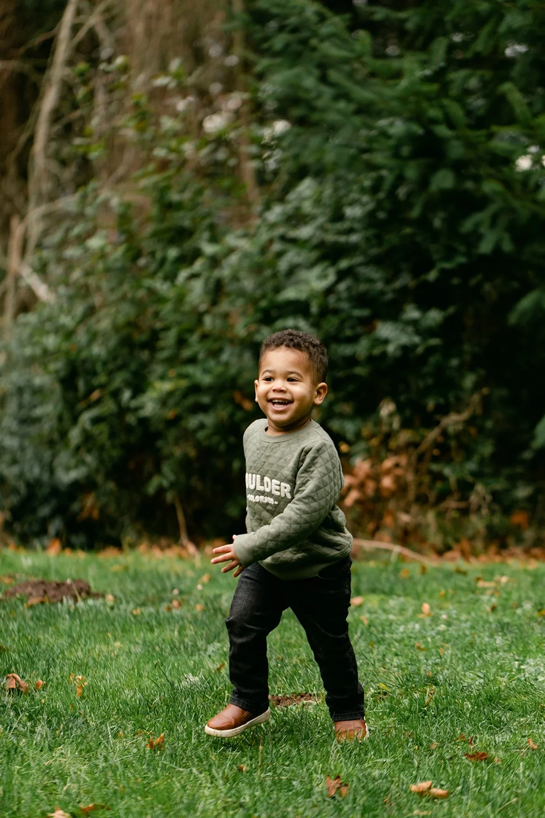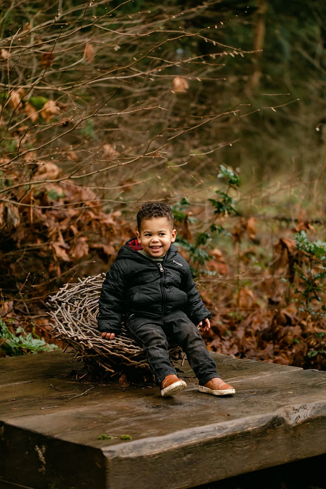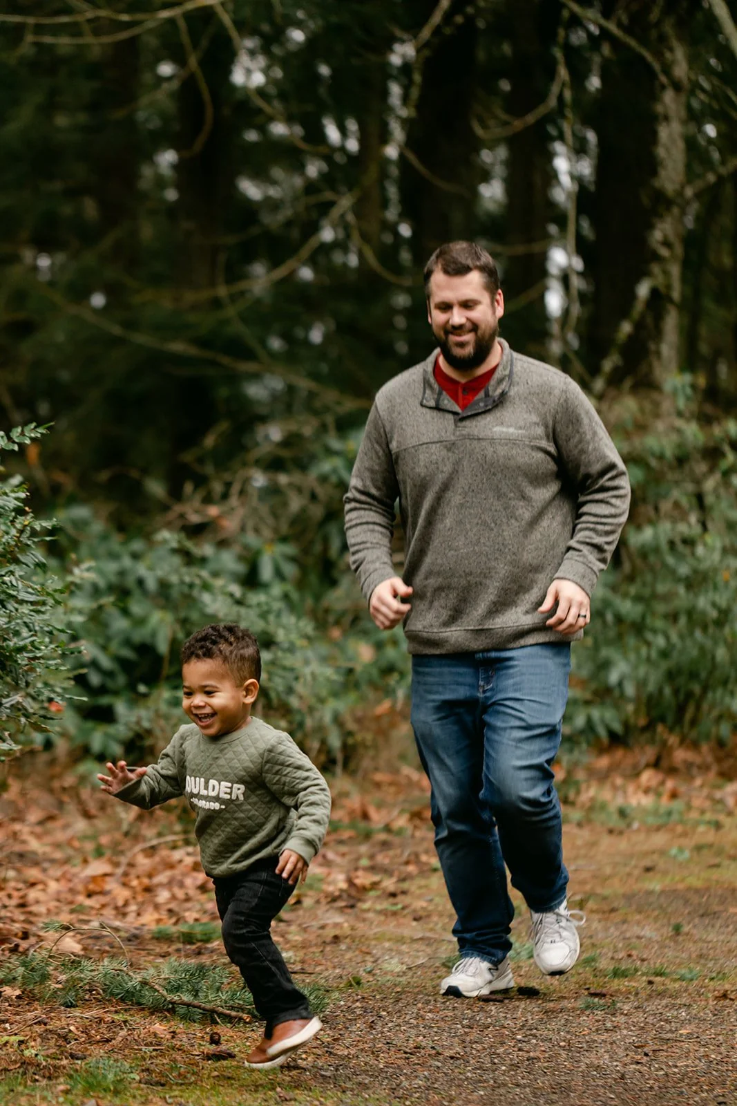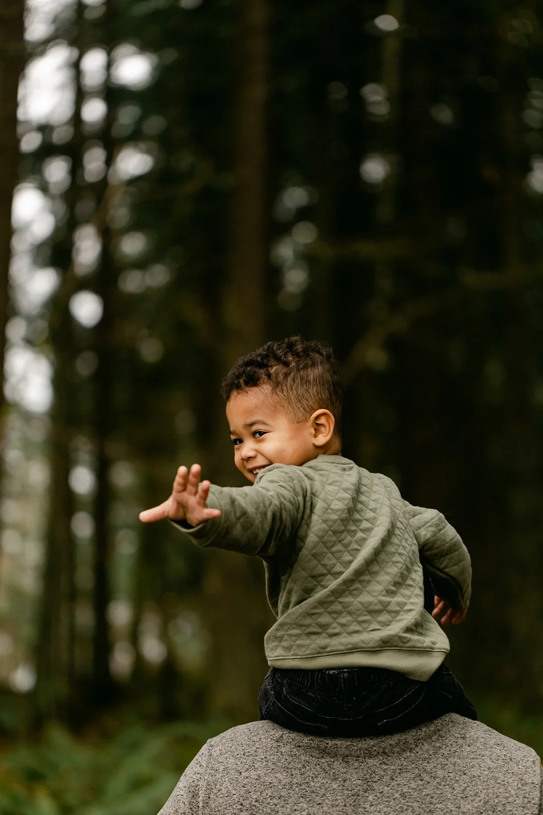 Now there's E — a toddler with a big laugh and very specific ideas about which direction we should be walking. Scouters Mountain in Happy Valley was the right setting for it: a volcanic butte draped in Douglas fir and big-leaf maple, with trees that have been growing for over 200 years. The kind of place that makes a toddler feel like an explorer.