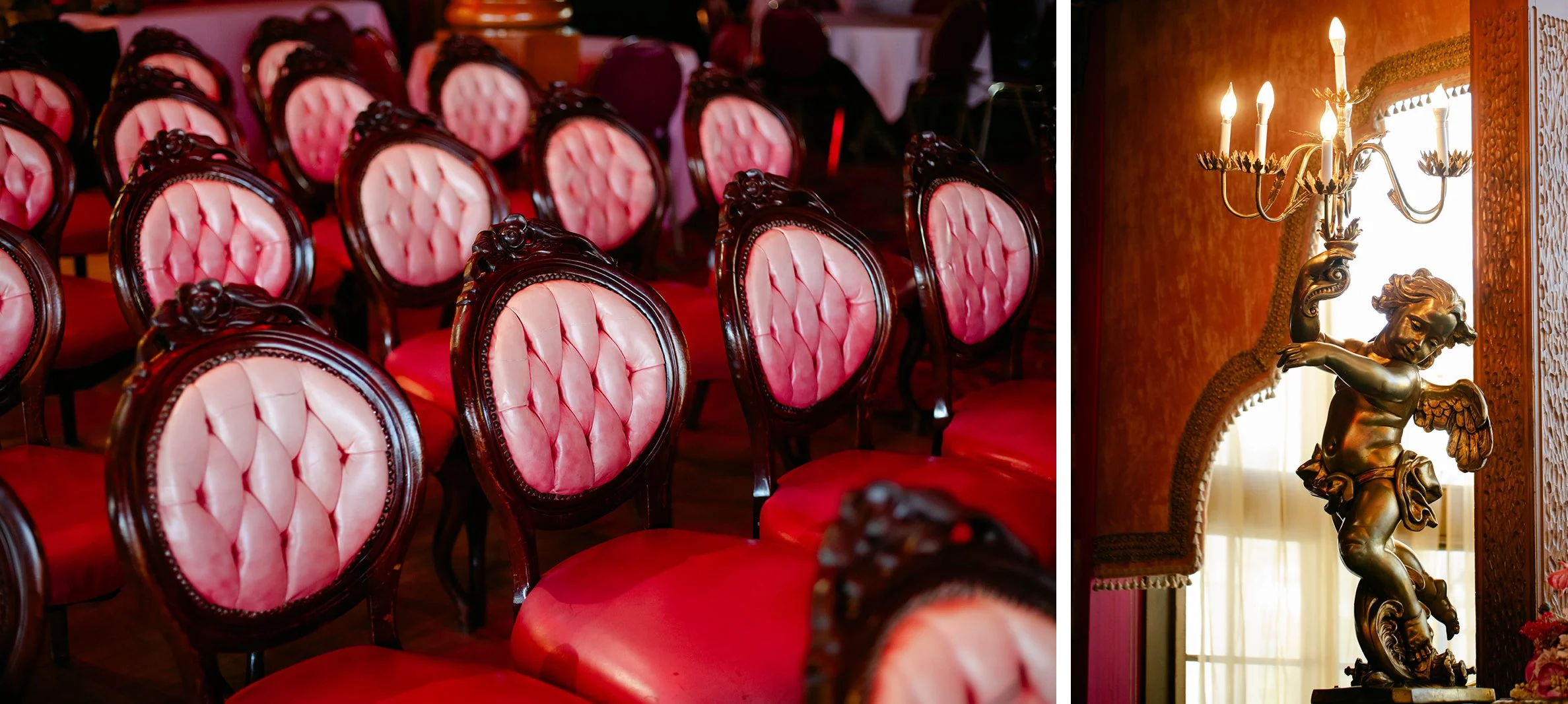 The ceremony location in the ‘Main Dance Floor’ is a showstopper. Soaring ceilings, red chandeliers casting everything in a warm jewel-toned glow, golden curtains, hardwood floors that seem to have absorbed decades of celebration. Rows of plush velvet pink chairs lined the aisle — soft and romantic, somehow perfectly at odds with Sam's black gown in the best possible way. That contrast again. It followed her everywhere.