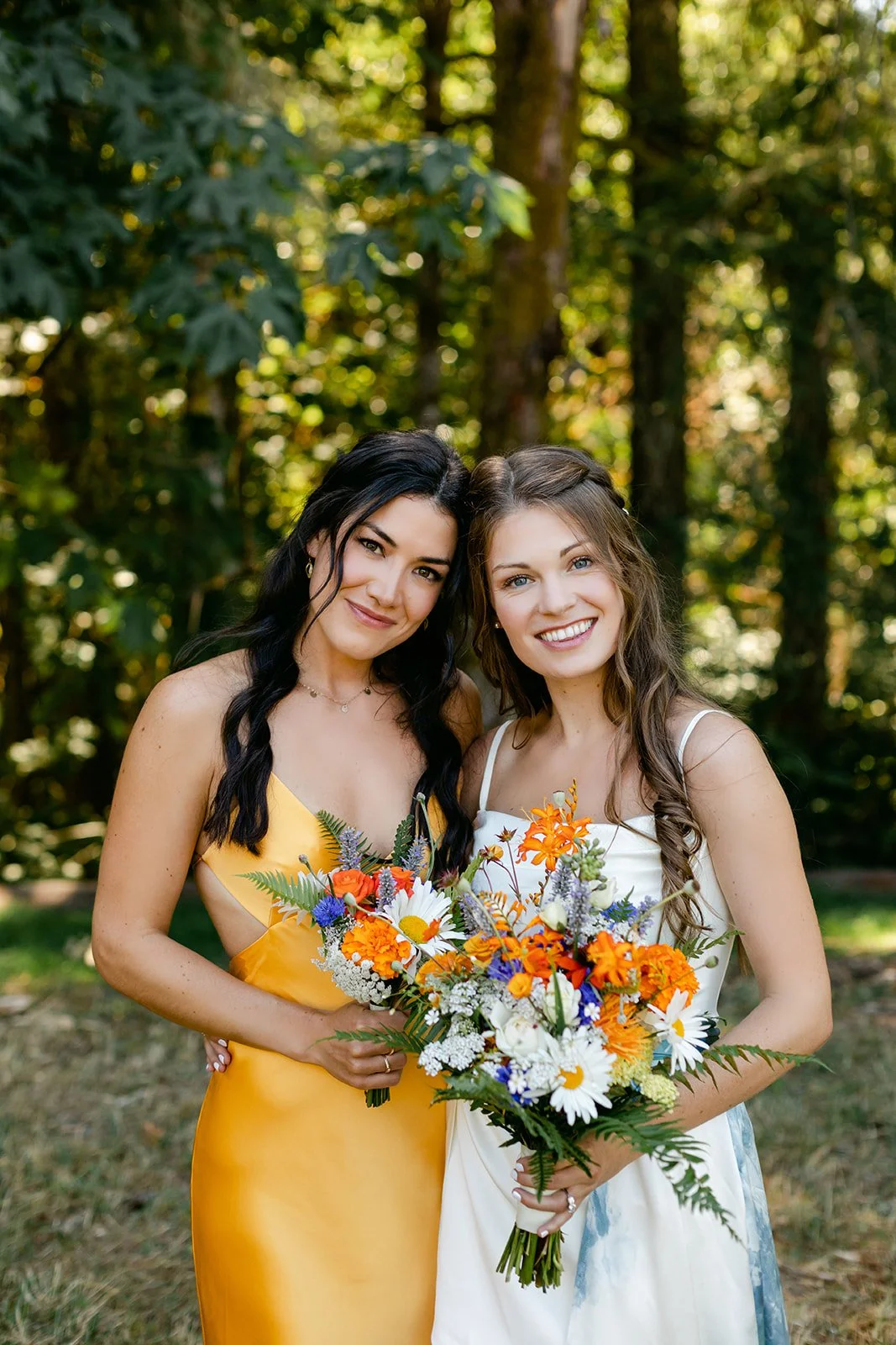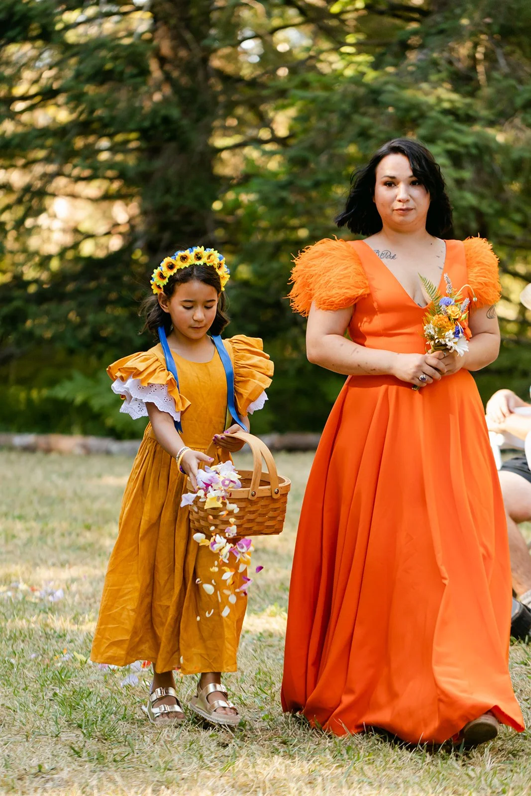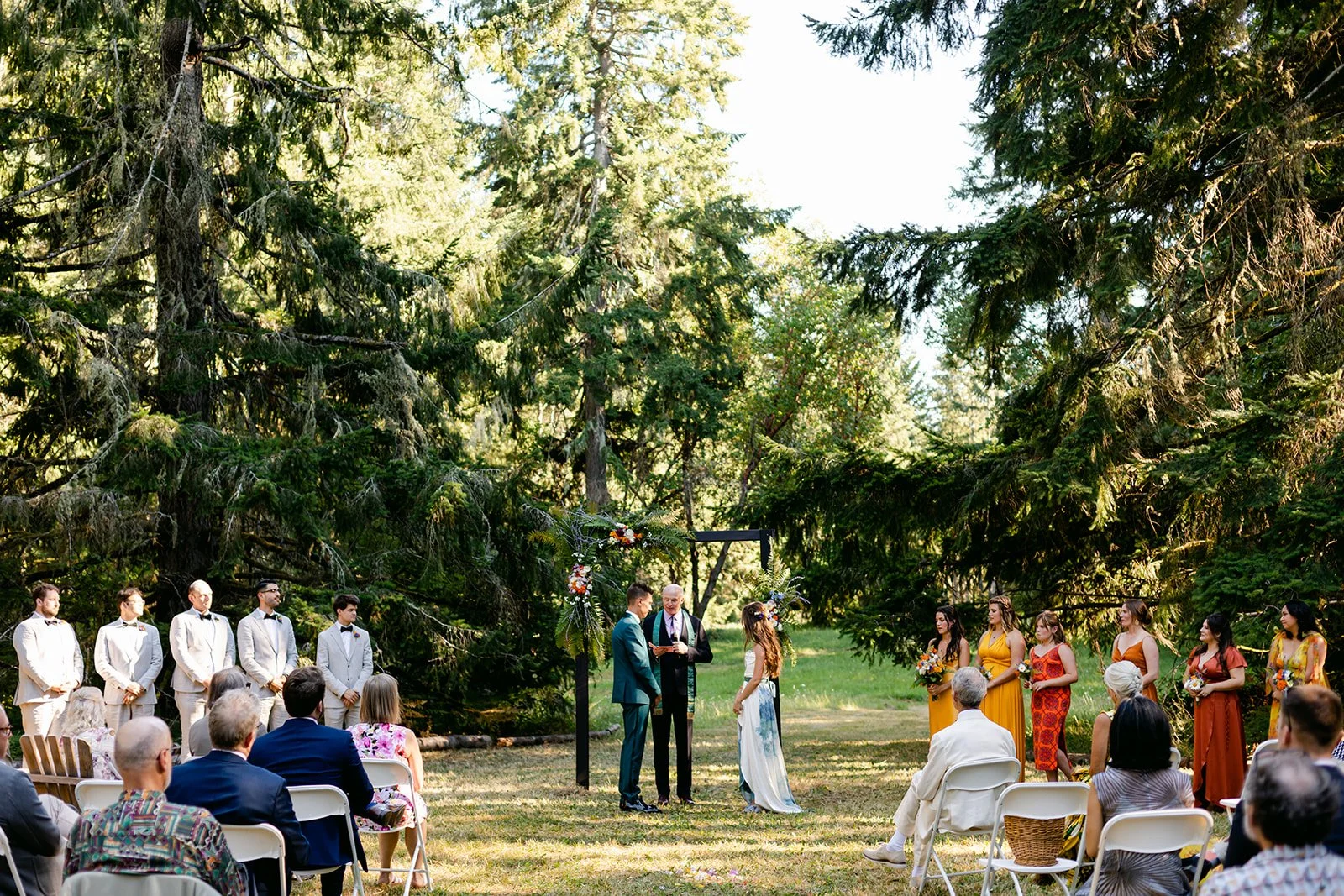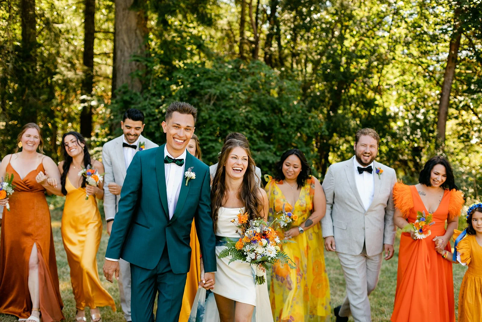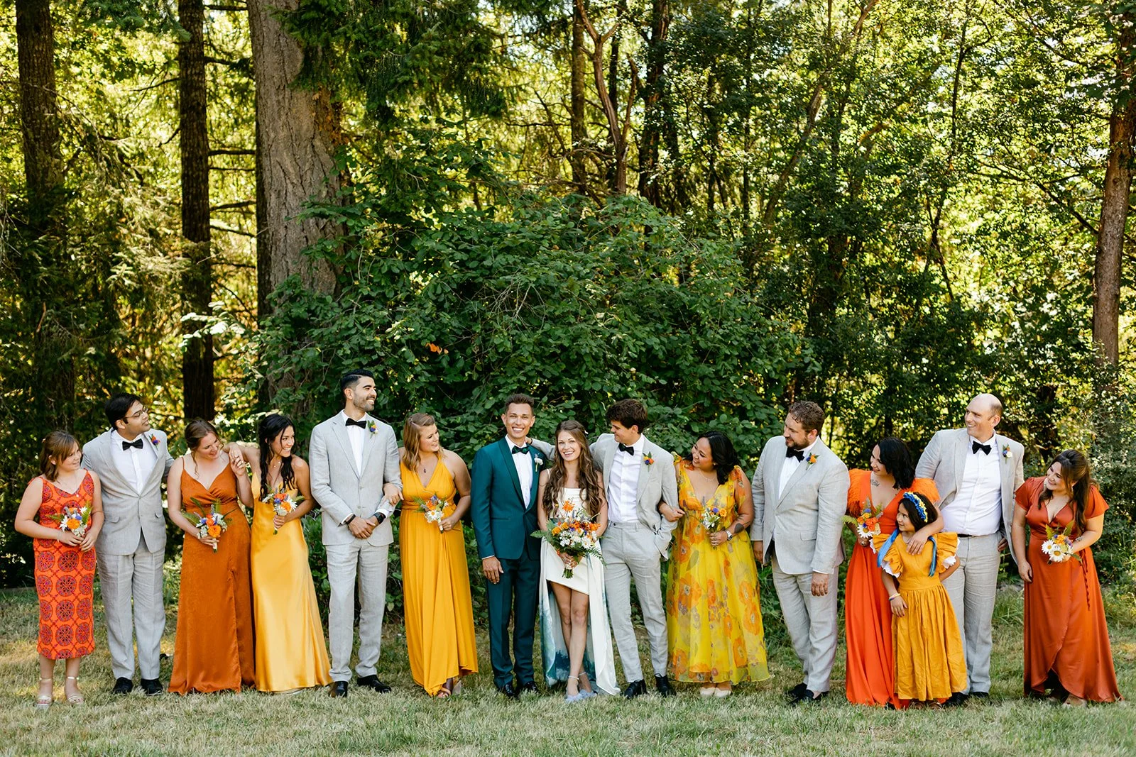 The wedding party wore a full spectrum of warm tones — amber, rust, marigold, terracotta — against the deep Pacific Northwest green of the tree line behind them, and the effect was like standing inside a painting. The flower girl, in a golden ruffled dress with a sunflower crown in blue and yellow.