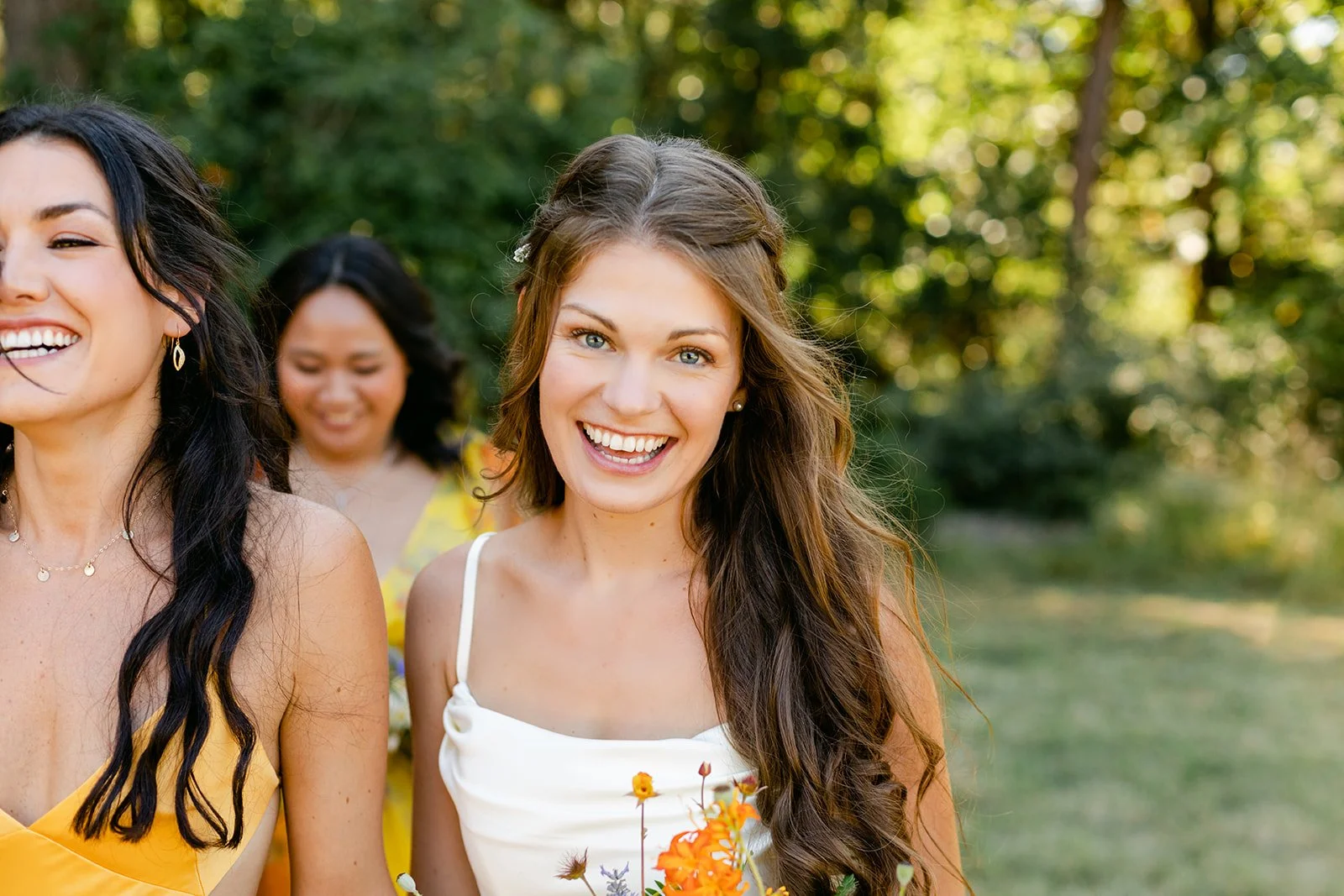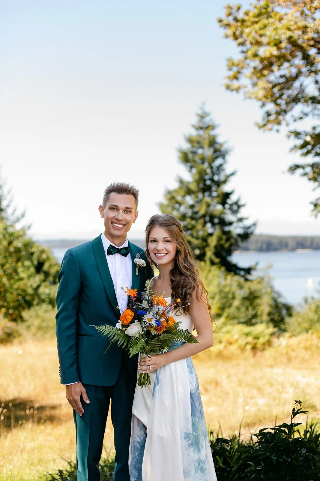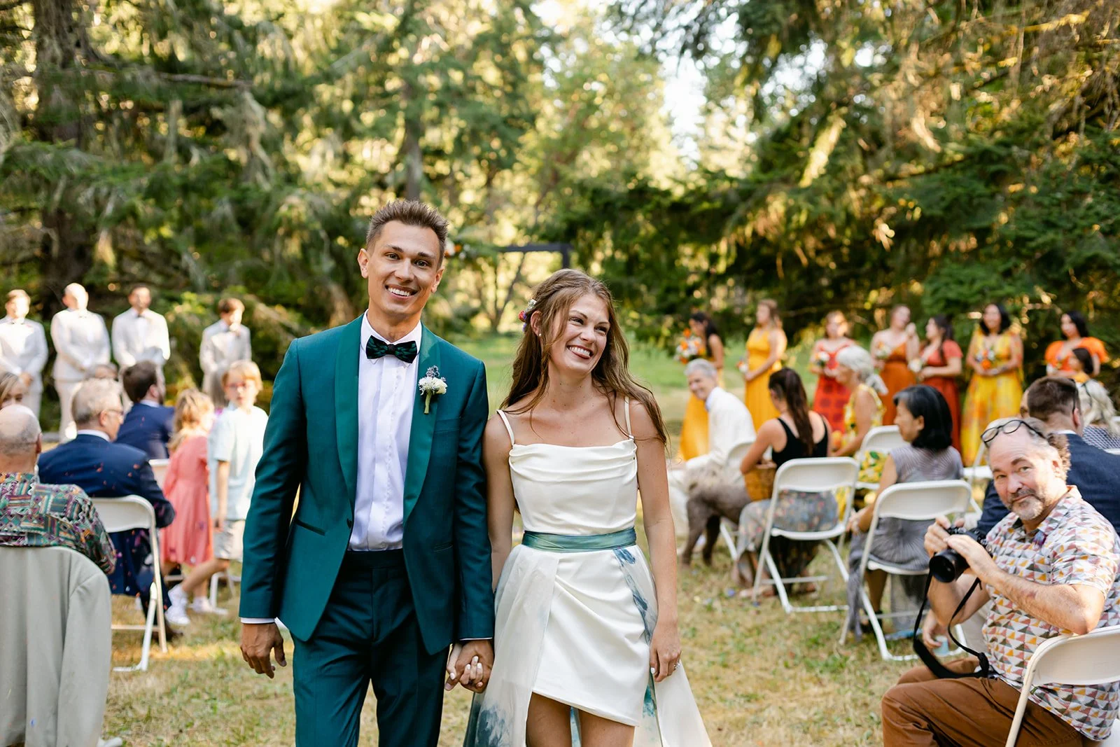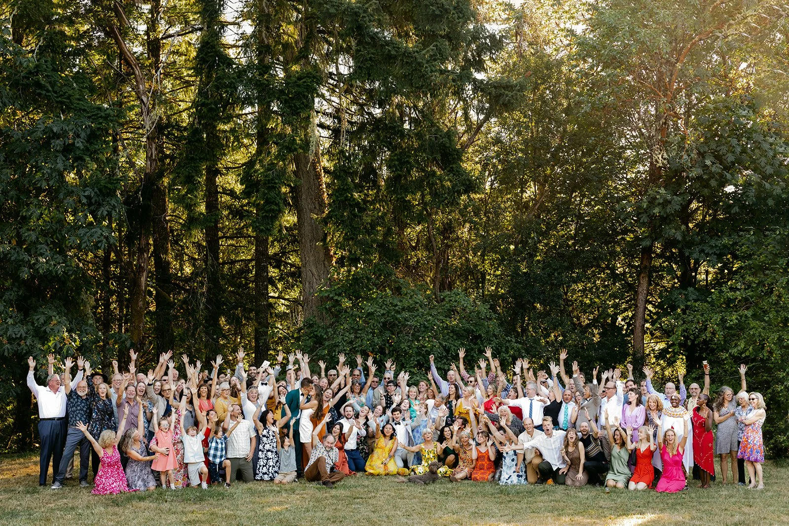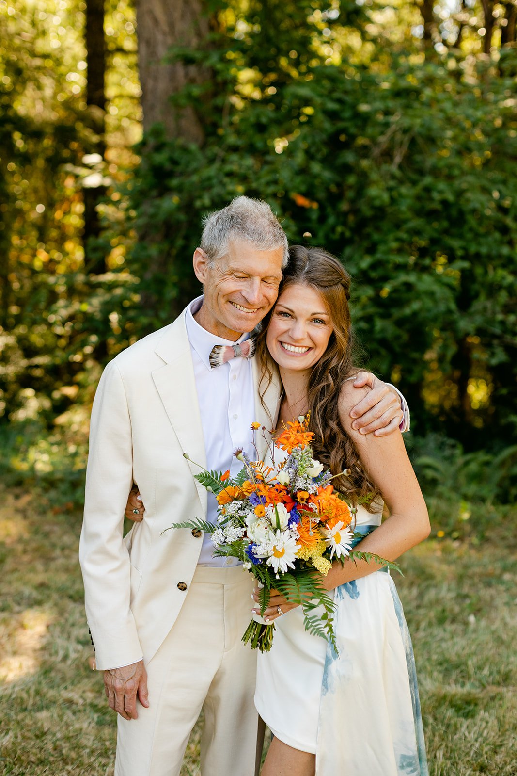 The wedding party wore a full spectrum of warm tones — amber, rust, marigold, terracotta — against the deep Pacific Northwest green of the tree line behind them, and the effect was like standing inside a painting. The flower girl, in a golden ruffled dress with a sunflower crown in blue and yellow.
