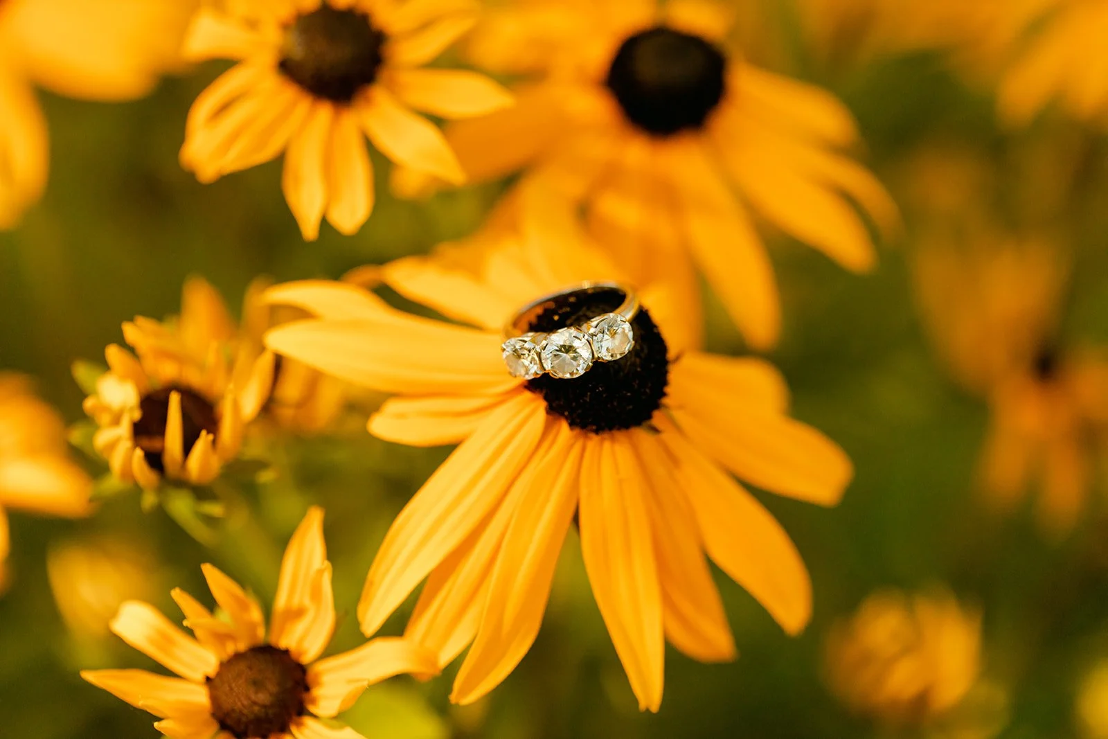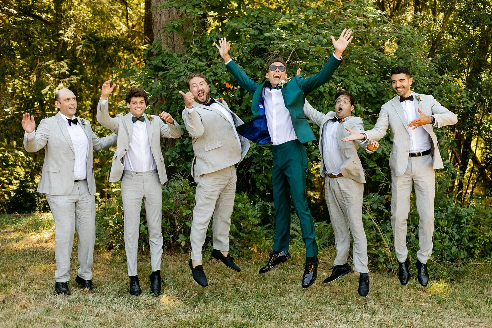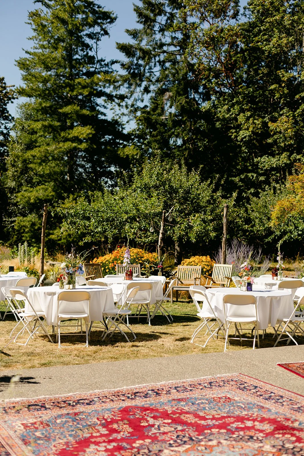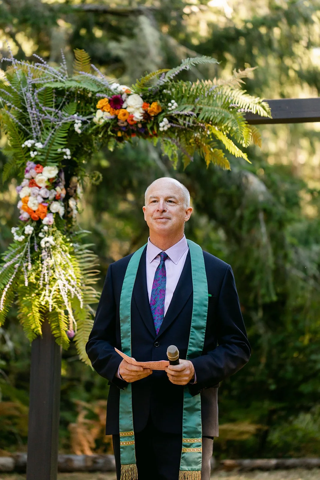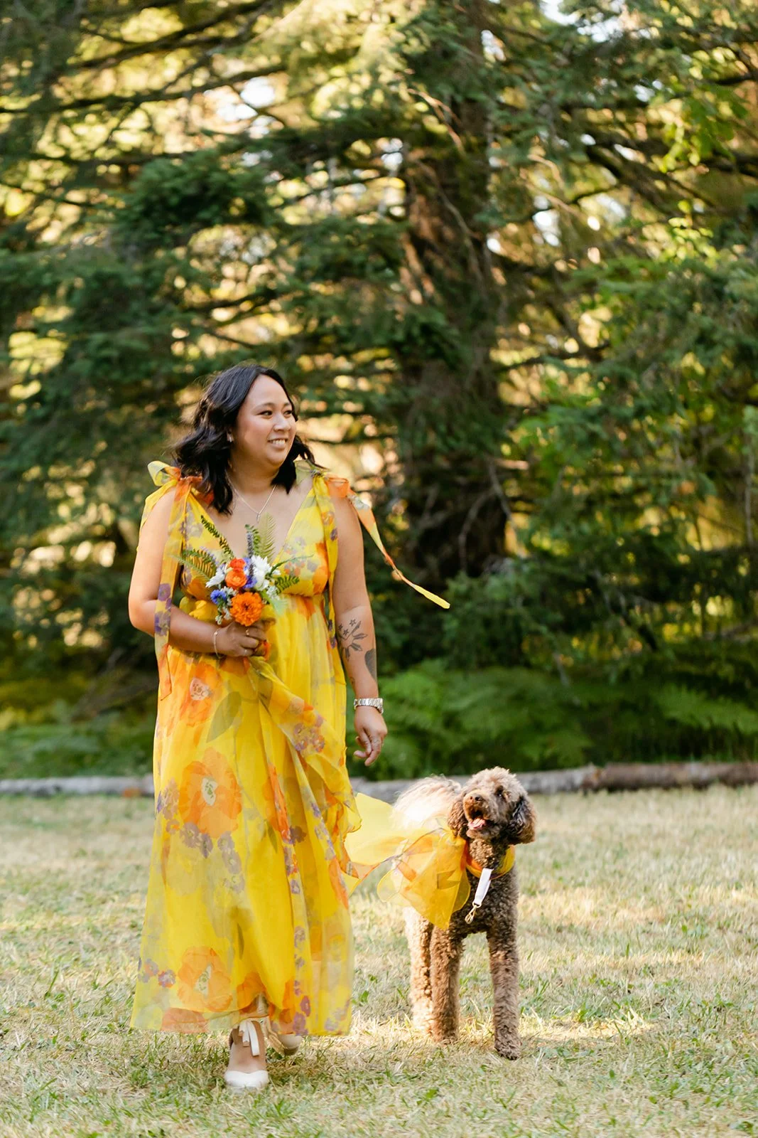 The wedding party wore a full spectrum of warm tones — amber, rust, marigold, terracotta — against the deep Pacific Northwest green of the tree line behind them, and the effect was like standing inside a painting. The flower girl, in a golden ruffled dress with a sunflower crown in blue and yellow.