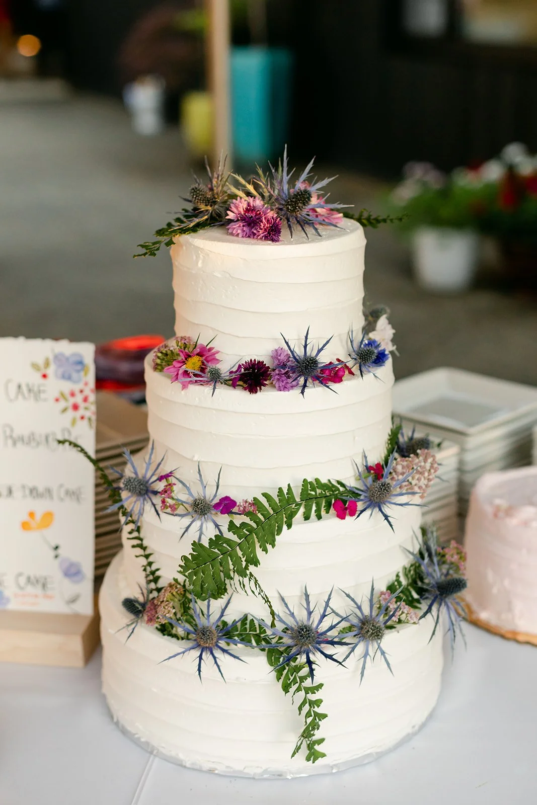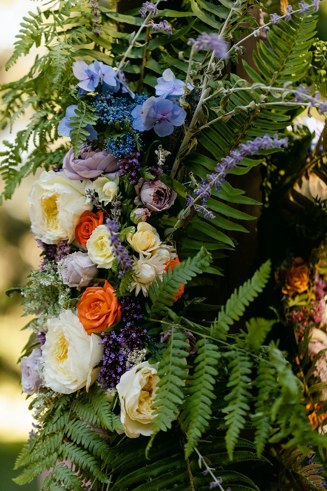 Start with the dress. Jill wore a sleek white dress with a silk skirt that she dyed herself — a watercolor wash of teal and blue that pooled at her feet when she stood still and moved like something alive when she walked. It was one of the most quietly extraordinary bridal looks I've ever photographed, and the fact that she made it herself made it even more so. Her wildflower bouquet — daisy, orange poppy, cobalt blue, fern.