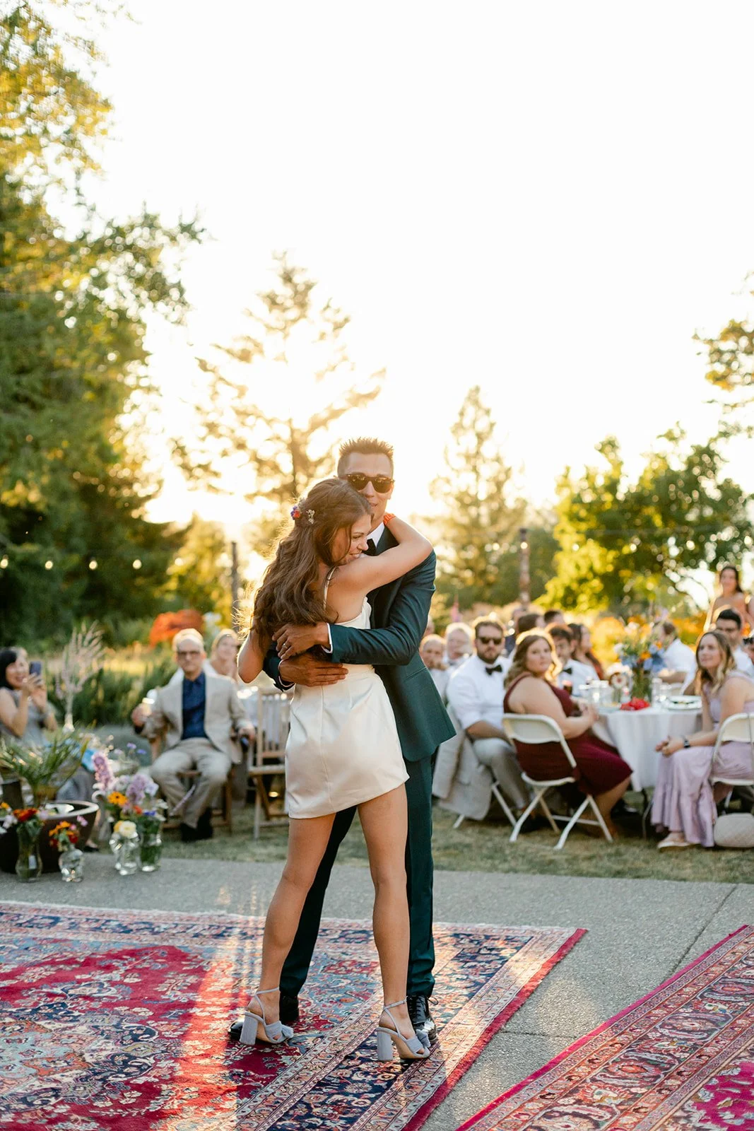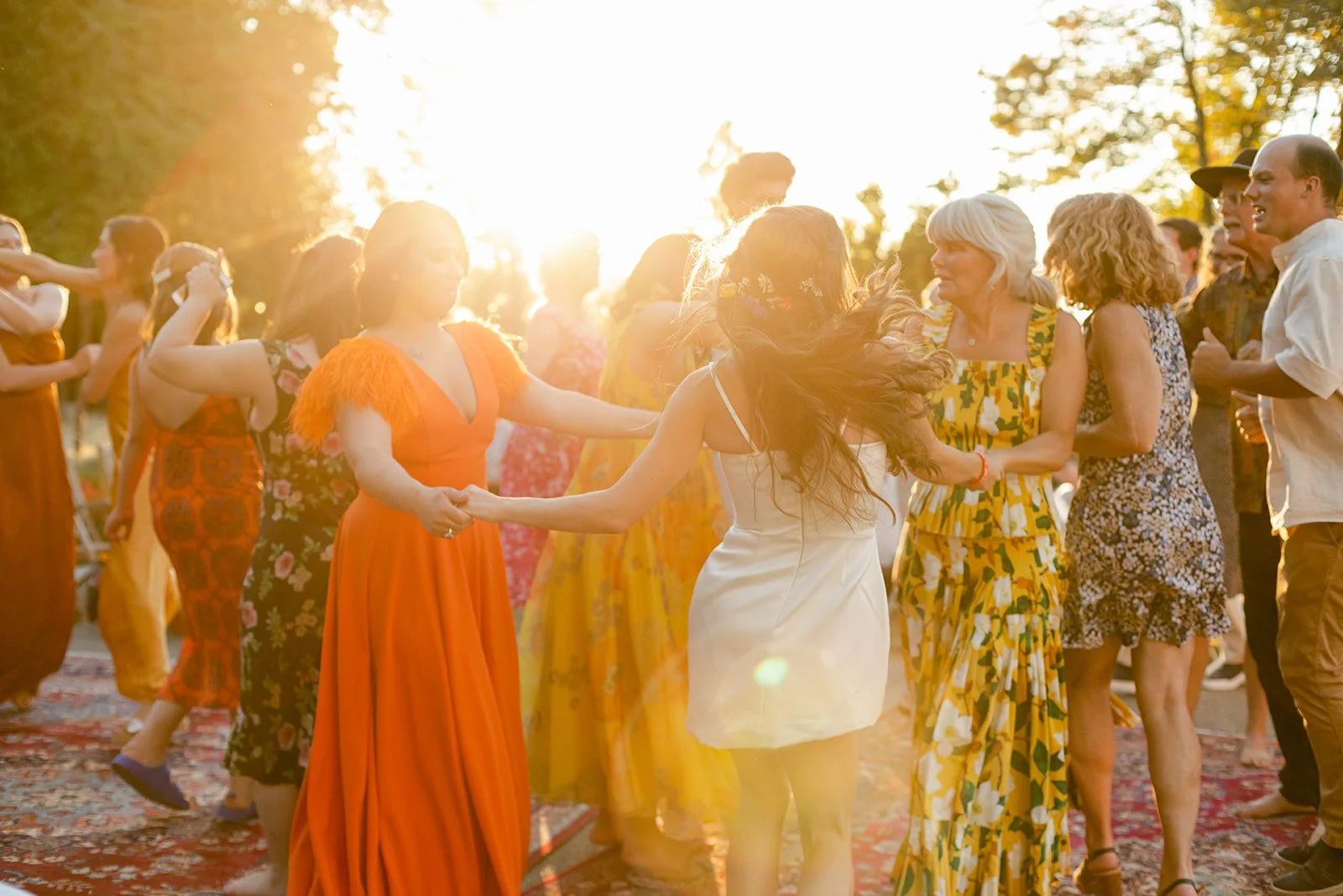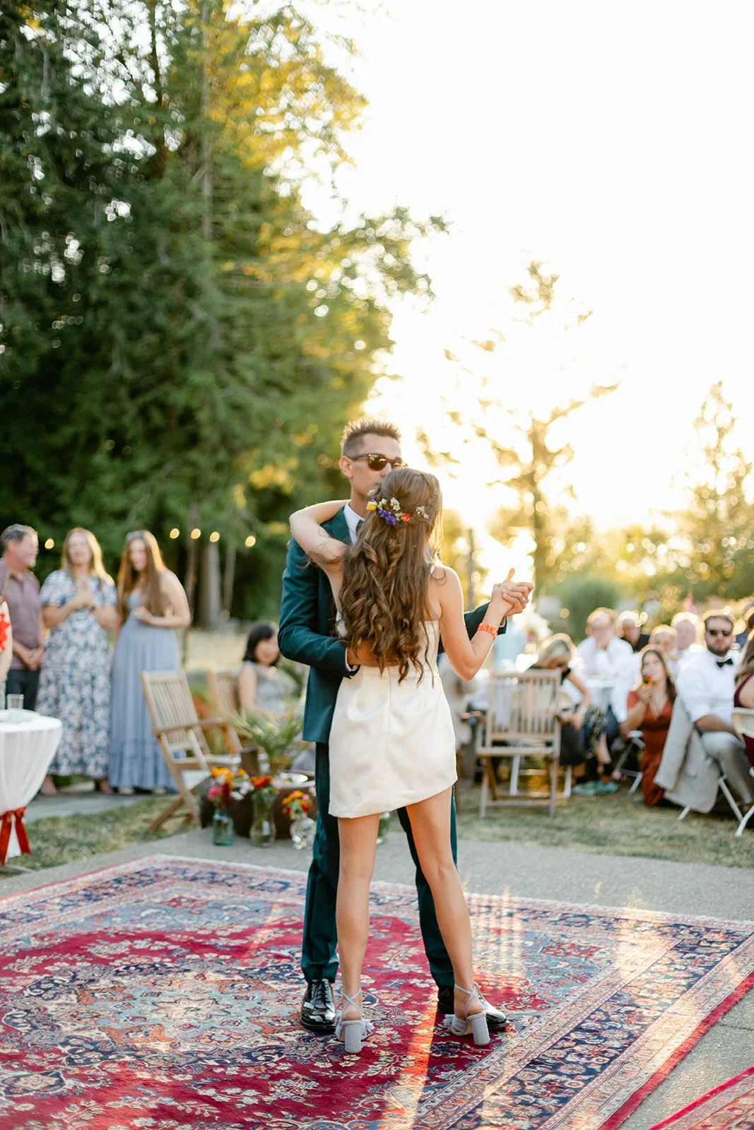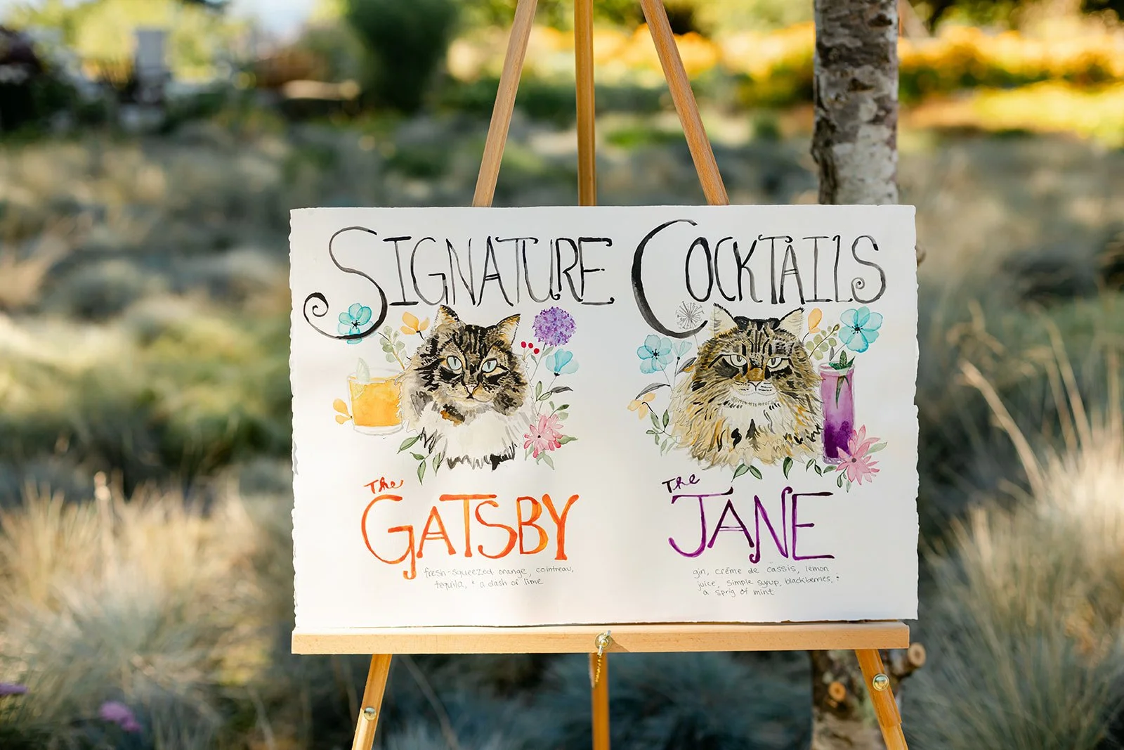 The reception itself included a live band, spoken word poetry, and interpretive dance. The party spread out across the property in the golden late-afternoon light — outdoor dining tables beneath the trees, Persian rugs laid out as a dance floor, gladioli in every color standing tall in glass vases, guests dressed like they'd been given a color palette and told to have fun with it. The bar menu deserves its own mention: each cocktail was named for and illustrated with a hand-painted portrait of Jill and Si's cats. The first dance happened in full golden hour, the kind of light that makes everything look like it belongs in a museum.