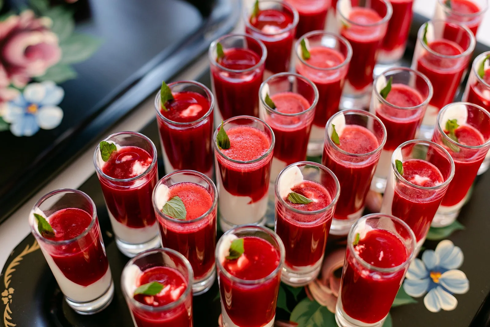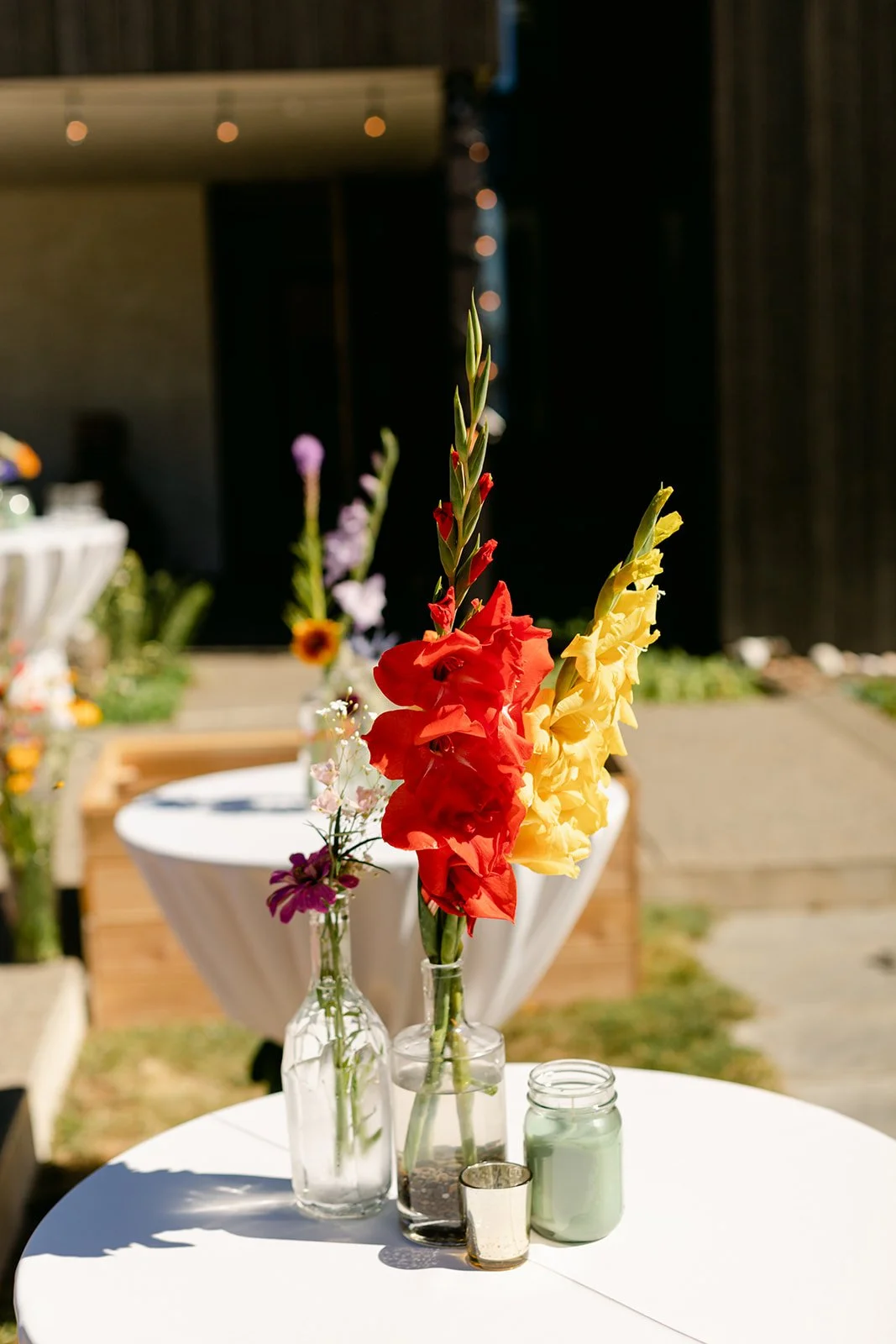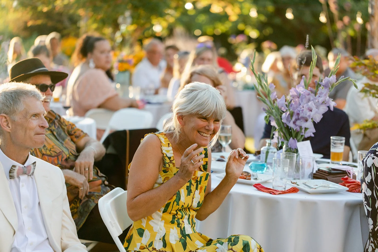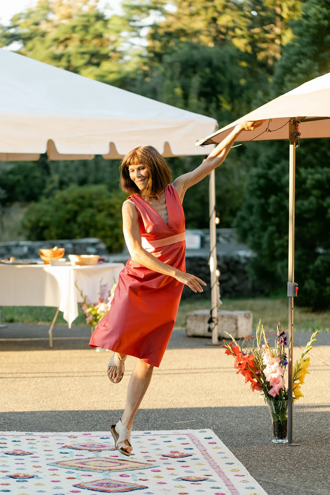 The reception itself included a live band, spoken word poetry, and interpretive dance. The party spread out across the property in the golden late-afternoon light — outdoor dining tables beneath the trees, Persian rugs laid out as a dance floor, gladioli in every color standing tall in glass vases, guests dressed like they'd been given a color palette and told to have fun with it. The bar menu deserves its own mention: each cocktail was named for and illustrated with a hand-painted portrait of Jill and Si's cats. The first dance happened in full golden hour, the kind of light that makes everything look like it belongs in a museum.