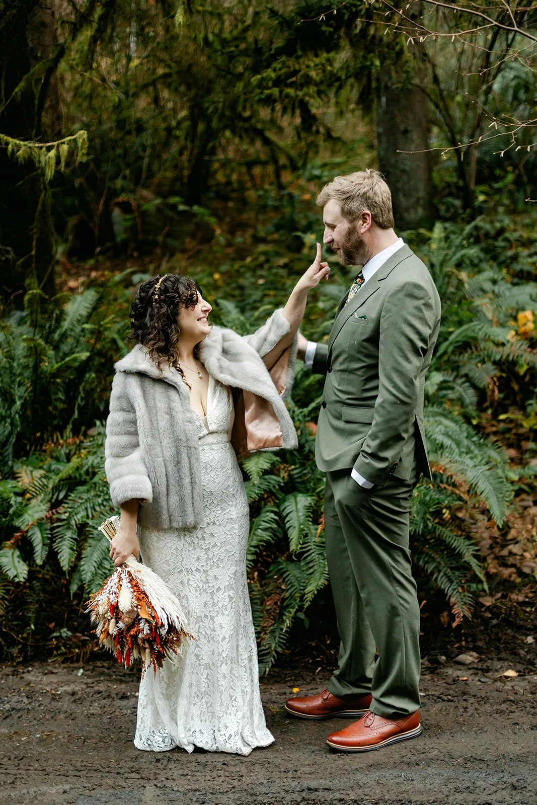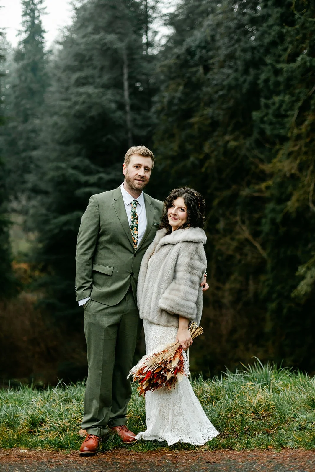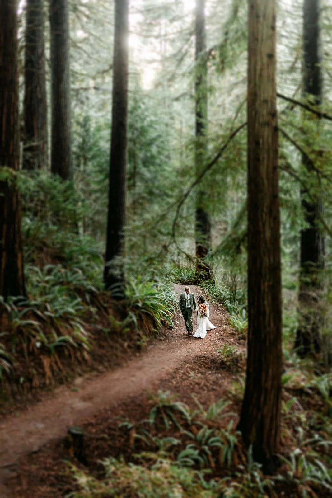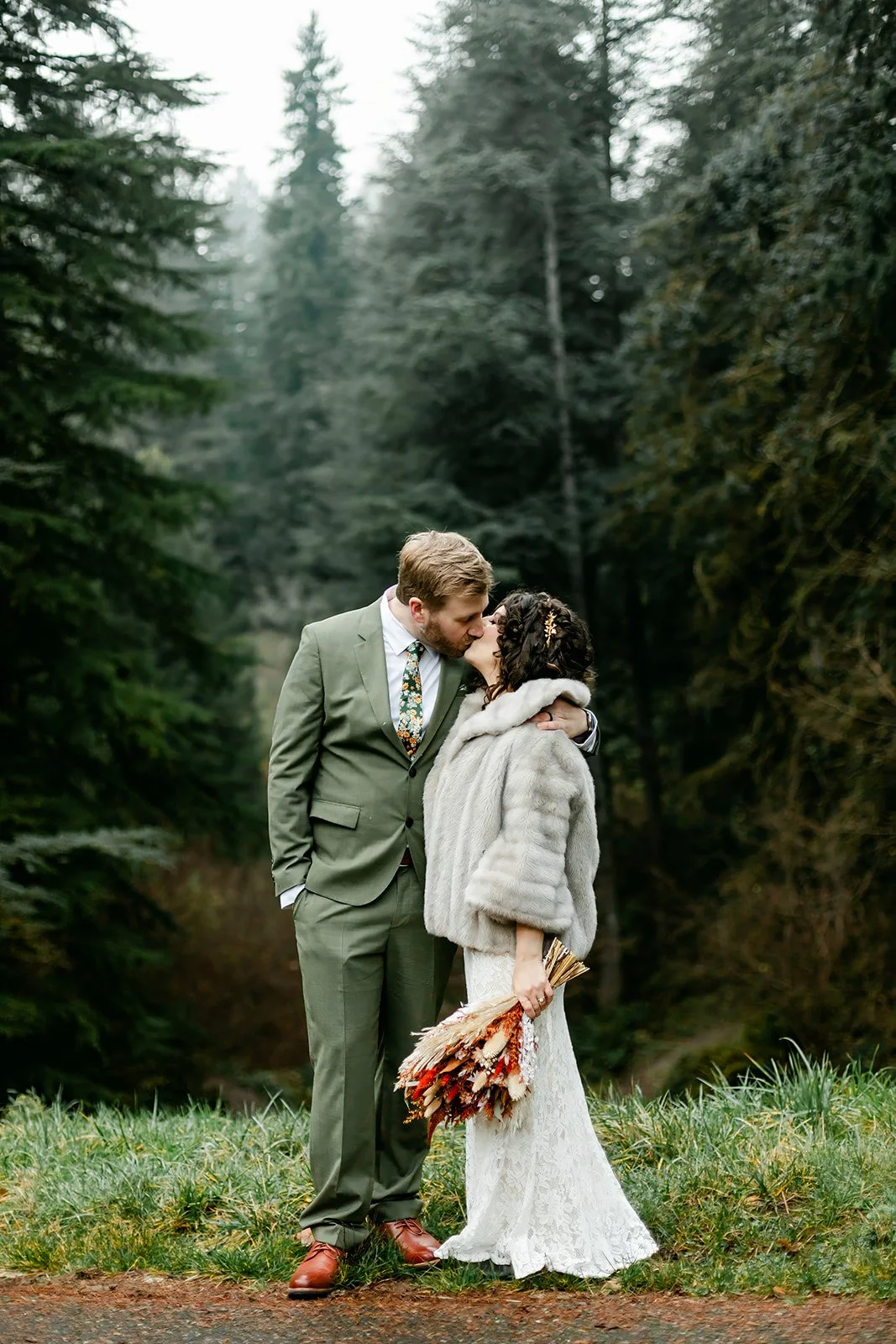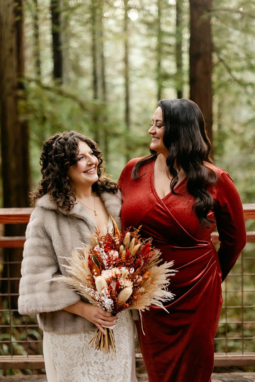Vendor Spotlight: Sara's look was in the hands of Lisa Boehm, a Portland based hair, makeup, and skincare artist whose whole approach is built around making you look like yourself, only better. Soft, skin forward makeup and modern timeless hair styling that photographs beautifully without ever feeling overdone. For a December elopement in the redwoods, it was exactly right. If you are looking for a Portland wedding hair and makeup artist who genuinely gets it, Lisa is your person. Find her at lisaboehmbeauty.com.