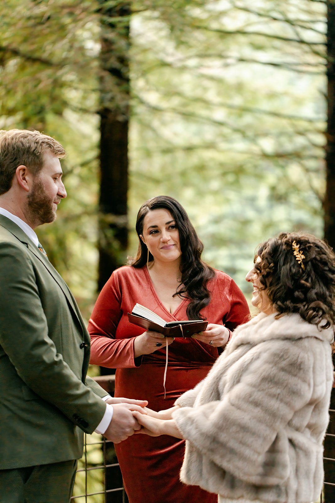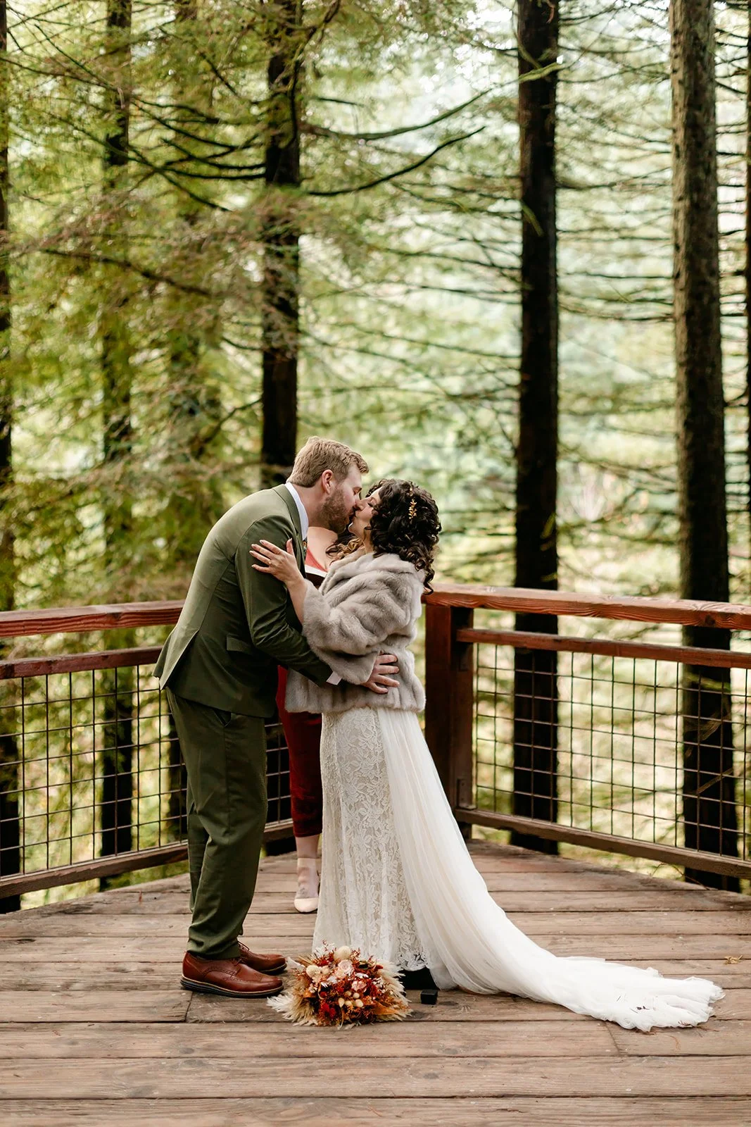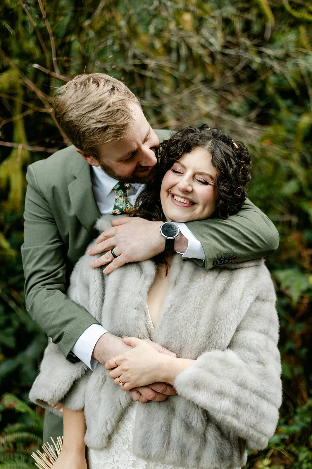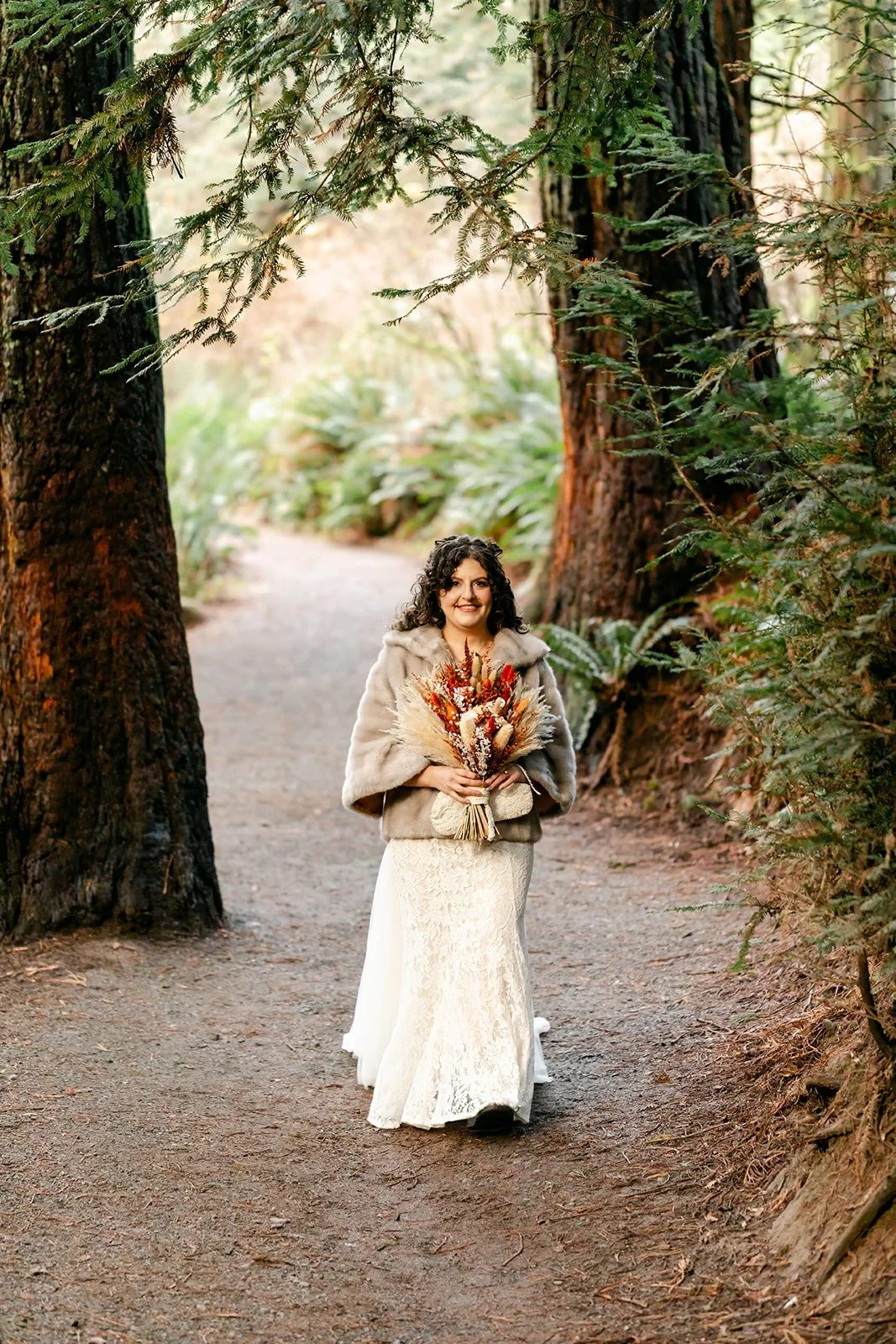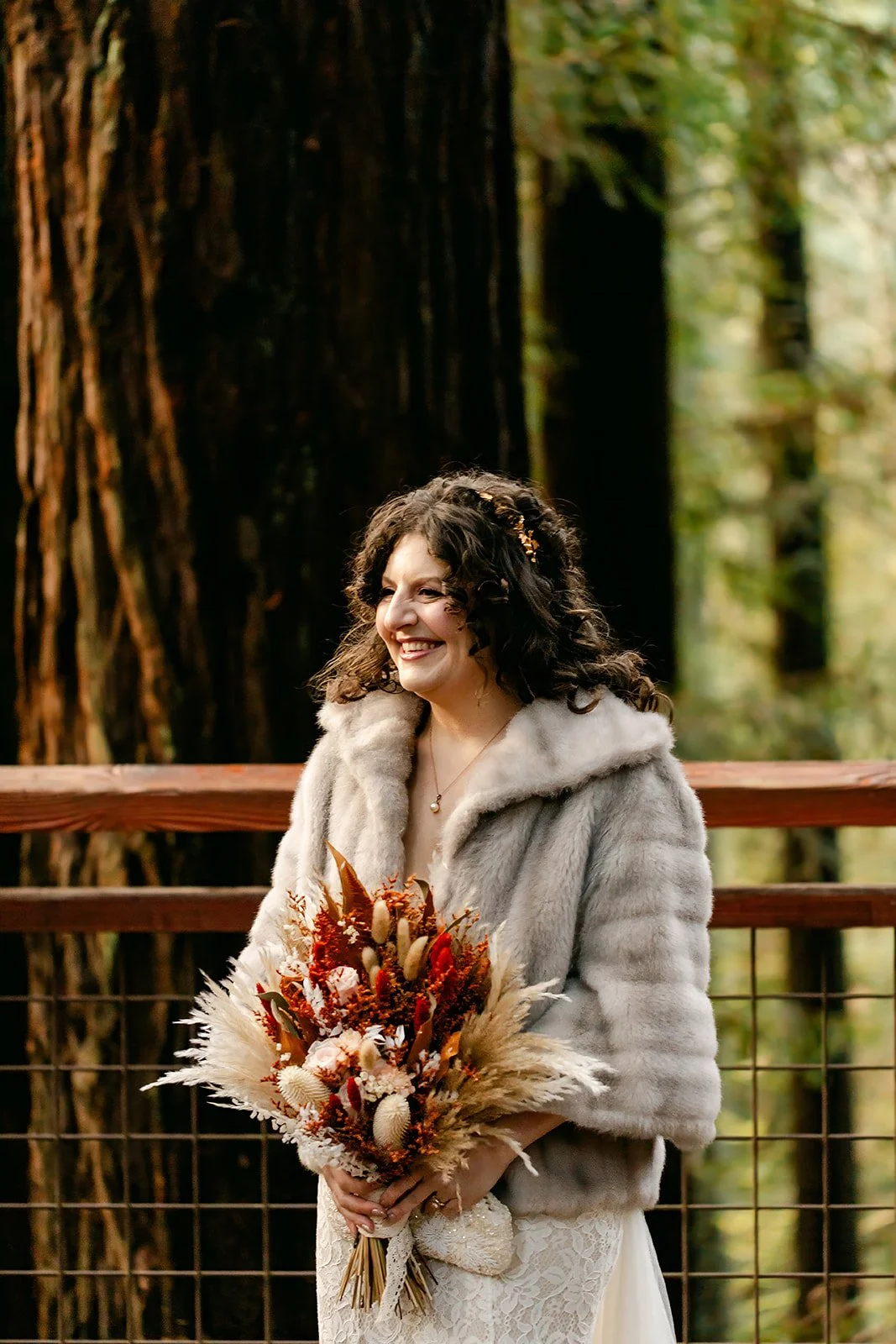 Vendor Spotlight: Sara's look was in the hands of Lisa Boehm, a Portland based hair, makeup, and skincare artist whose whole approach is built around making you look like yourself, only better. Soft, skin forward makeup and modern timeless hair styling that photographs beautifully without ever feeling overdone. For a December elopement in the redwoods, it was exactly right. If you are looking for a Portland wedding hair and makeup artist who genuinely gets it, Lisa is your person. Find her at lisaboehmbeauty.com.