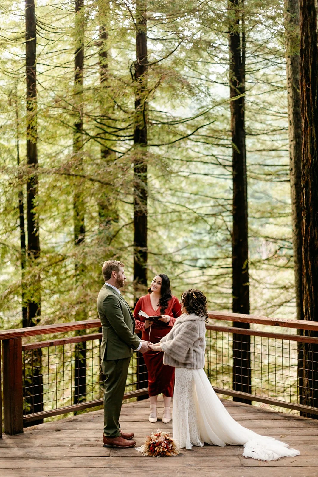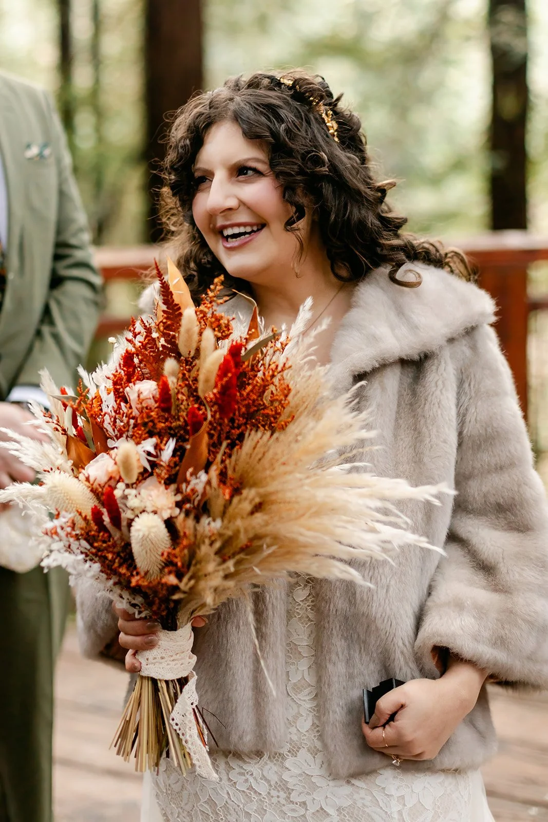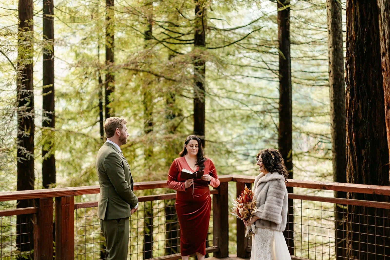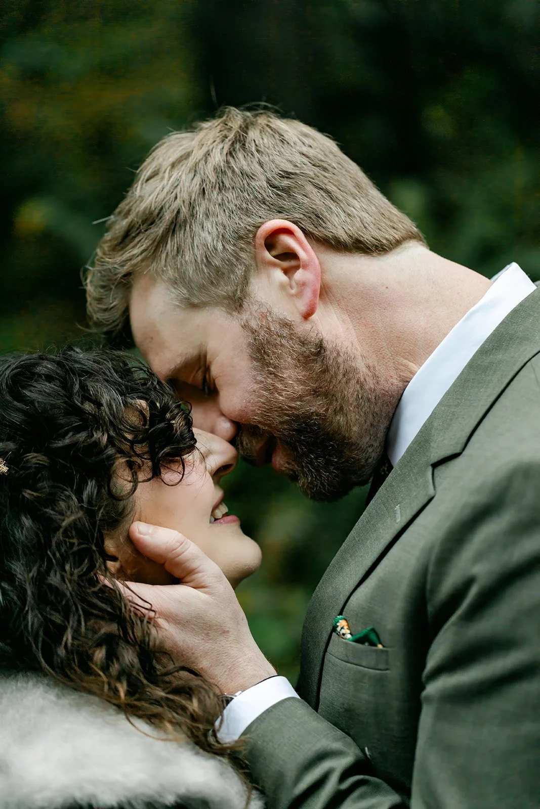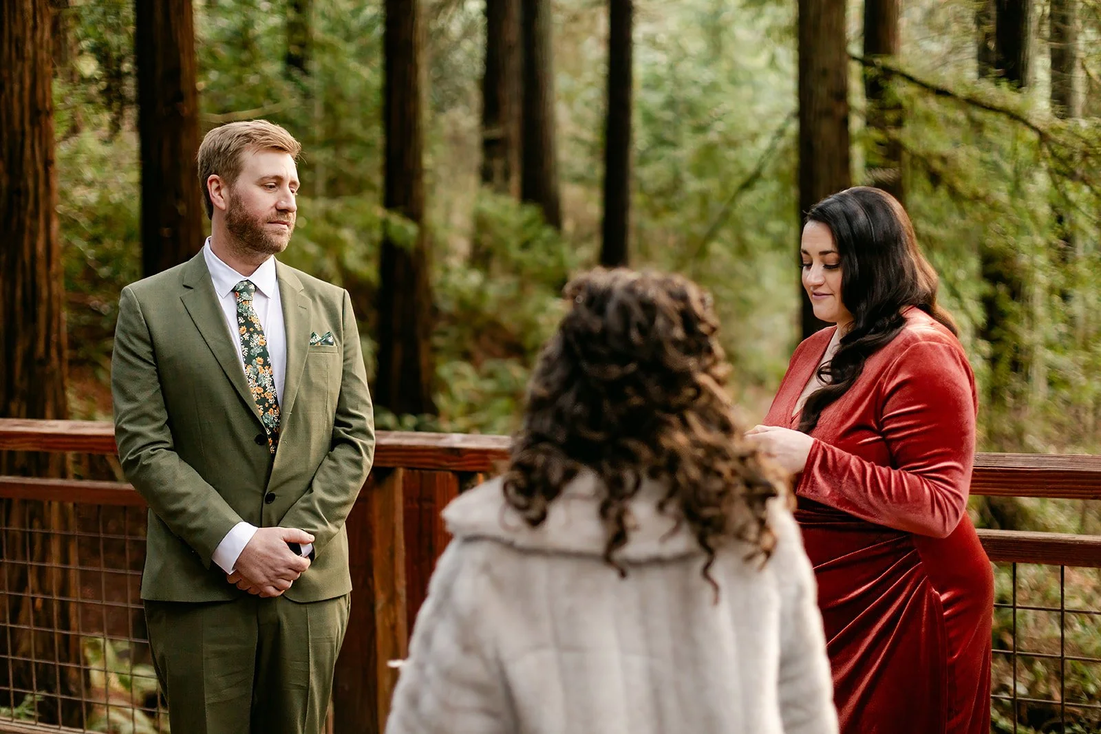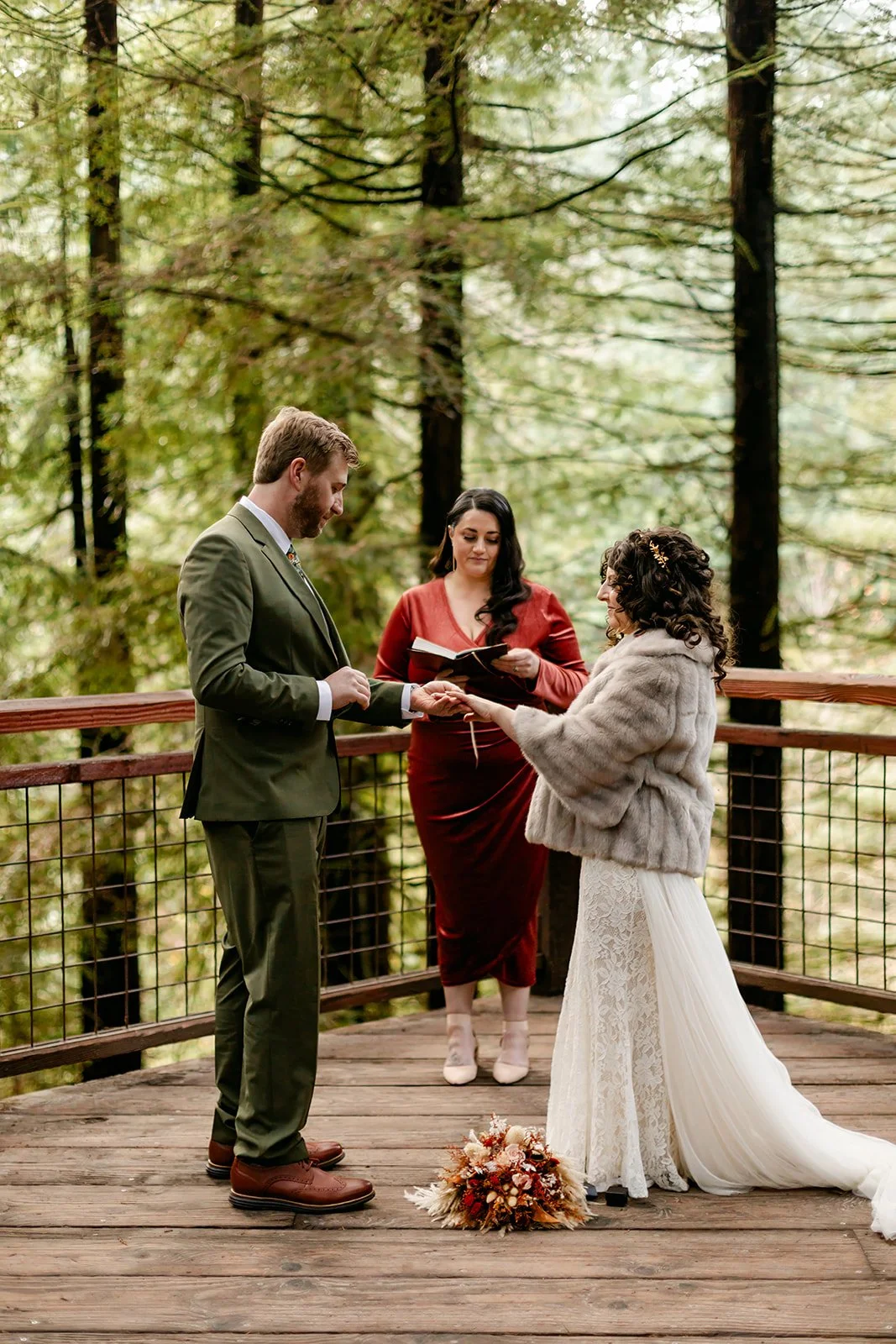 Vendor Spotlight: Sara's look was in the hands of Lisa Boehm, a Portland based hair, makeup, and skincare artist whose whole approach is built around making you look like yourself, only better. Soft, skin forward makeup and modern timeless hair styling that photographs beautifully without ever feeling overdone. For a December elopement in the redwoods, it was exactly right. If you are looking for a Portland wedding hair and makeup artist who genuinely gets it, Lisa is your person. Find her at lisaboehmbeauty.com.
